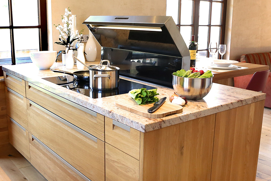Matthias Thielen hat sich für eine besonders hochwertige Massivholz-Küche von DECKER entschieden. Passend zum gemütlichen Hütten-Look ist die Küche top-modern ausgestattet, u. a. mit einer versenkbaren Dunstabzugshaube von der Marke BERBEL.
