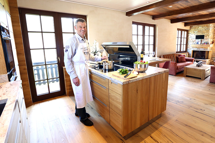 „Nach unserem Komplettumbau hat die Firma Thiex unsere neue Küche geplant. Das Resultat ist sozusagen ein Naturprodukt. Front und Korpus unserer Küche sind aus naturbelassenem Eiche-Massivholz, die Arbeitsplatten sind aus Naturstein. lAlles ist sehr modern, sowohl im Design als auch in der Technik, wie z. B. der ausfahrbare Dunstabzug. Gemütlich ist der Anbautisch mit integriertem Weinregal neben der Kochinsel. Der Fachberater Uwe Groben hat unsere Wünsche genau umgesetzt. Bei der Kundenbefragung haben wir Thiex die Note 1 für Beratung, Service und Qualität gegeben.“ (Matthias Thielen, L-Wallendorf-Pont)