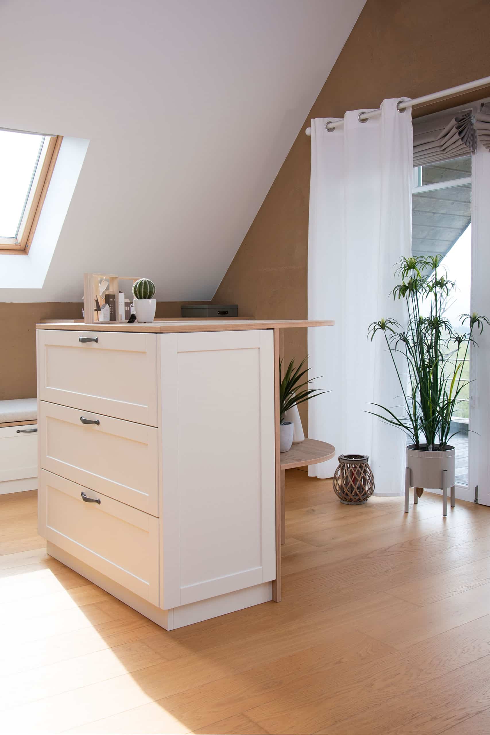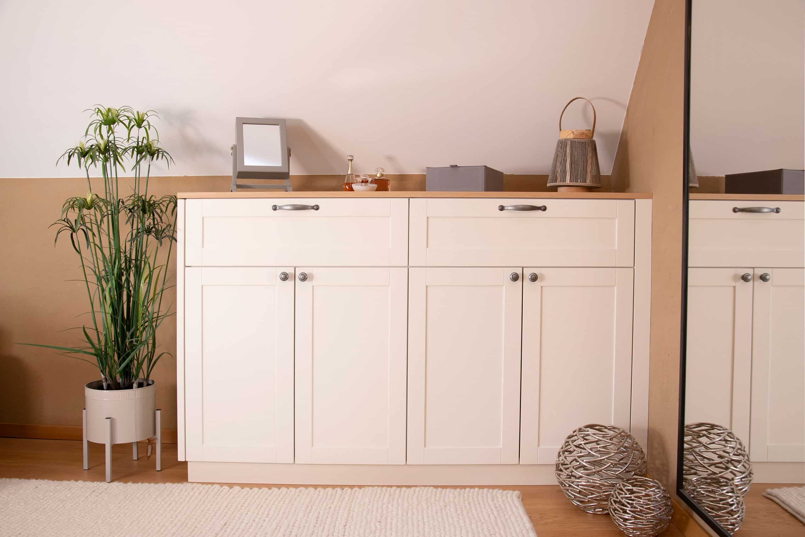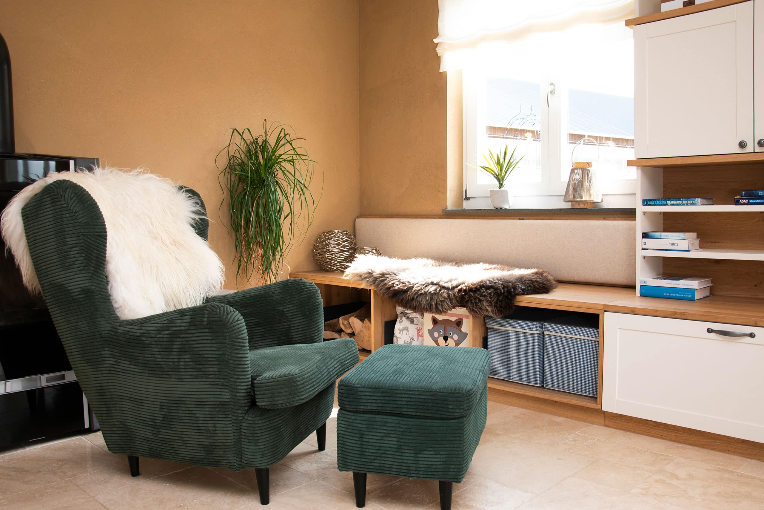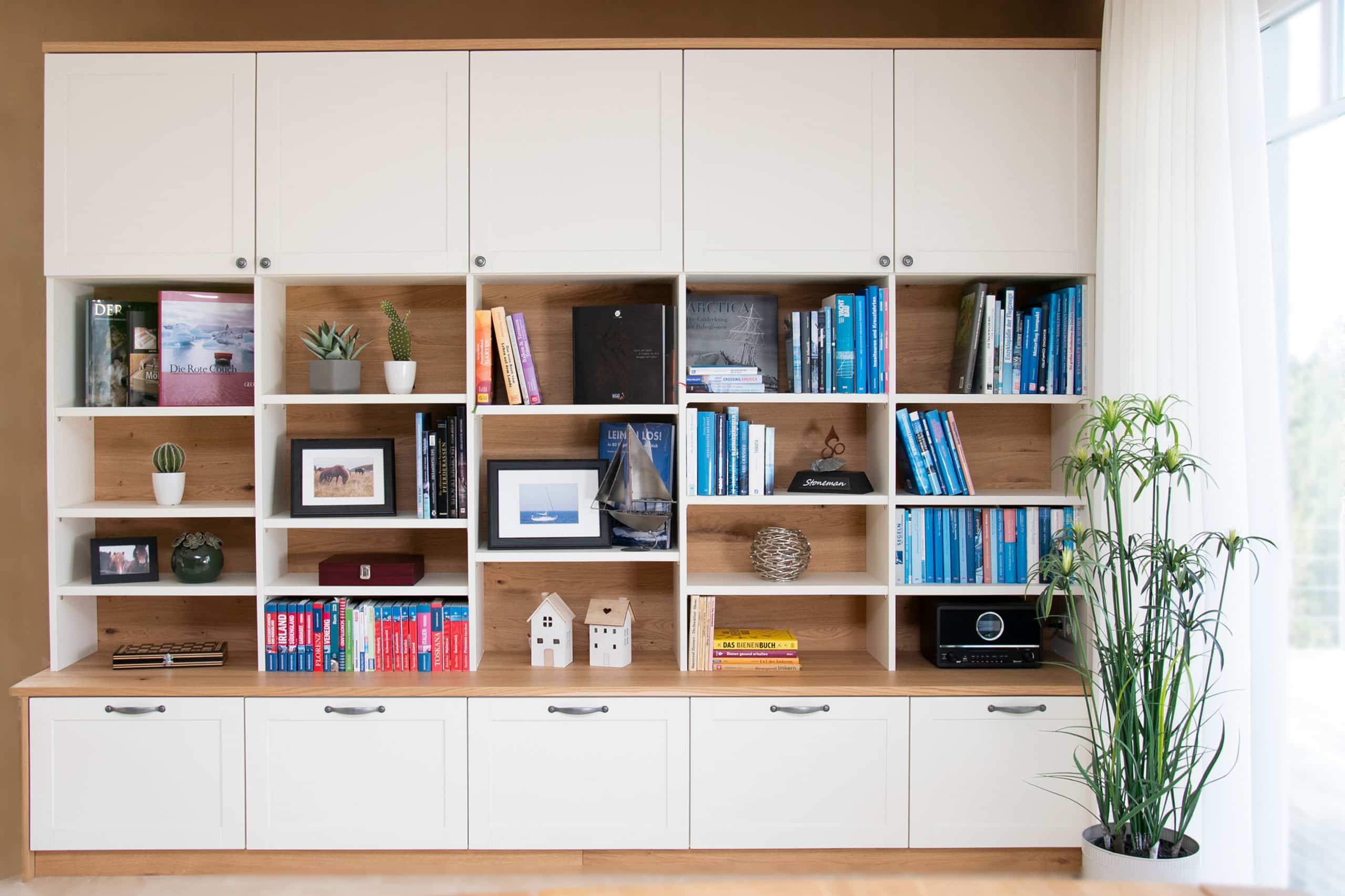 Für diesen Kunden durften wir eine maßgefertigte Wohnwand, stilvolle Bibliothek und elegante Schlafzimmerschränke im modernen Landhausstil anfertigen. Natürliches Eichenholz, matt lackierte Fronten in warmem Cremeweiß, durchdachte und komfortable Details wie Vollauszüge mit Softeinzug und integrierte LED-Beleuchtung schaffen ein wohnliches Ambiente mit Persönlichkeit.