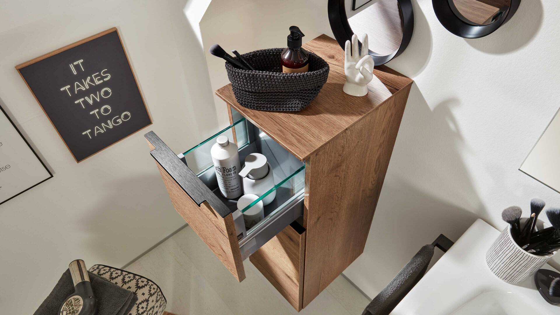 Der Hängeschrank ist mit einem bis zu 30 kg belastbaren Auszug mit Soft-Close und Selbsteinzug ausgestattet, der für leises und sanftes Schließen sorgt. Eine Tür mit Schließdämpfung und ein höhenverstellbarer Einlegeboden ergänzen den Stauraum und ermöglichen dir eine individuelle Organisation deiner Badutensilien.