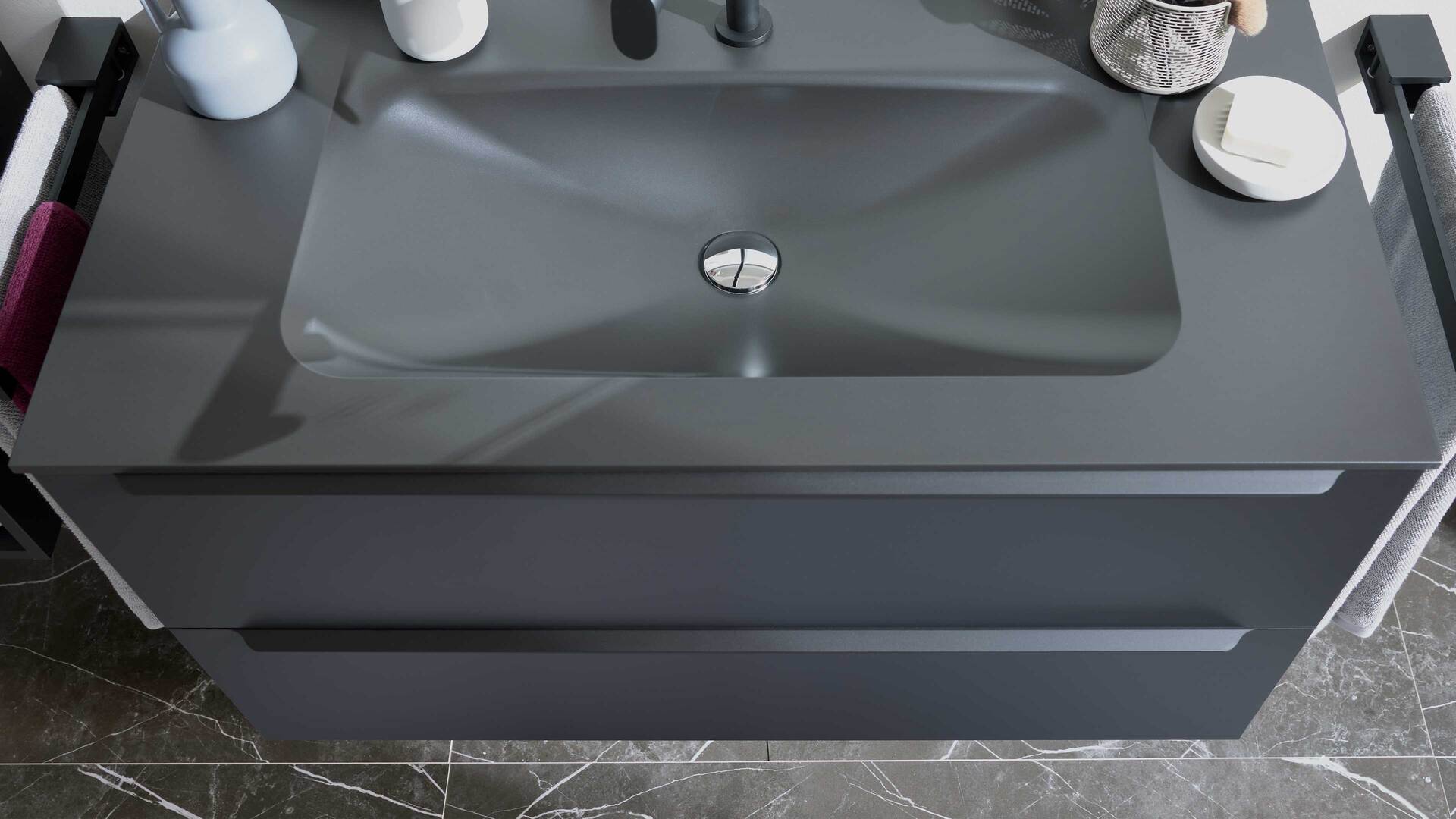 Der ca. 101 x 49 cm (B/LxT) große Waschtisch aus mattschwarzem Duratek® überzeugt mit ultrakompakter Struktur, samtiger Haptik und einer besonders widerstandsfähigen Oberfläche – kratz- und stoßfest sowie leicht zu reinigen. Er verfügt über eine Hahnlochbohrung und kommt ohne Überlauf. Darunter bietet der ca. 100 x 58 x 46 cm (B/LxHxT) große Unterschrank mit zwei Auszügen, Soft-Close und Selbsteinzug jede Menge Stauraum. Eine Rückwand ist integriert, Glas-Seitenwände sind gegen Mehrpreis erhältlich.