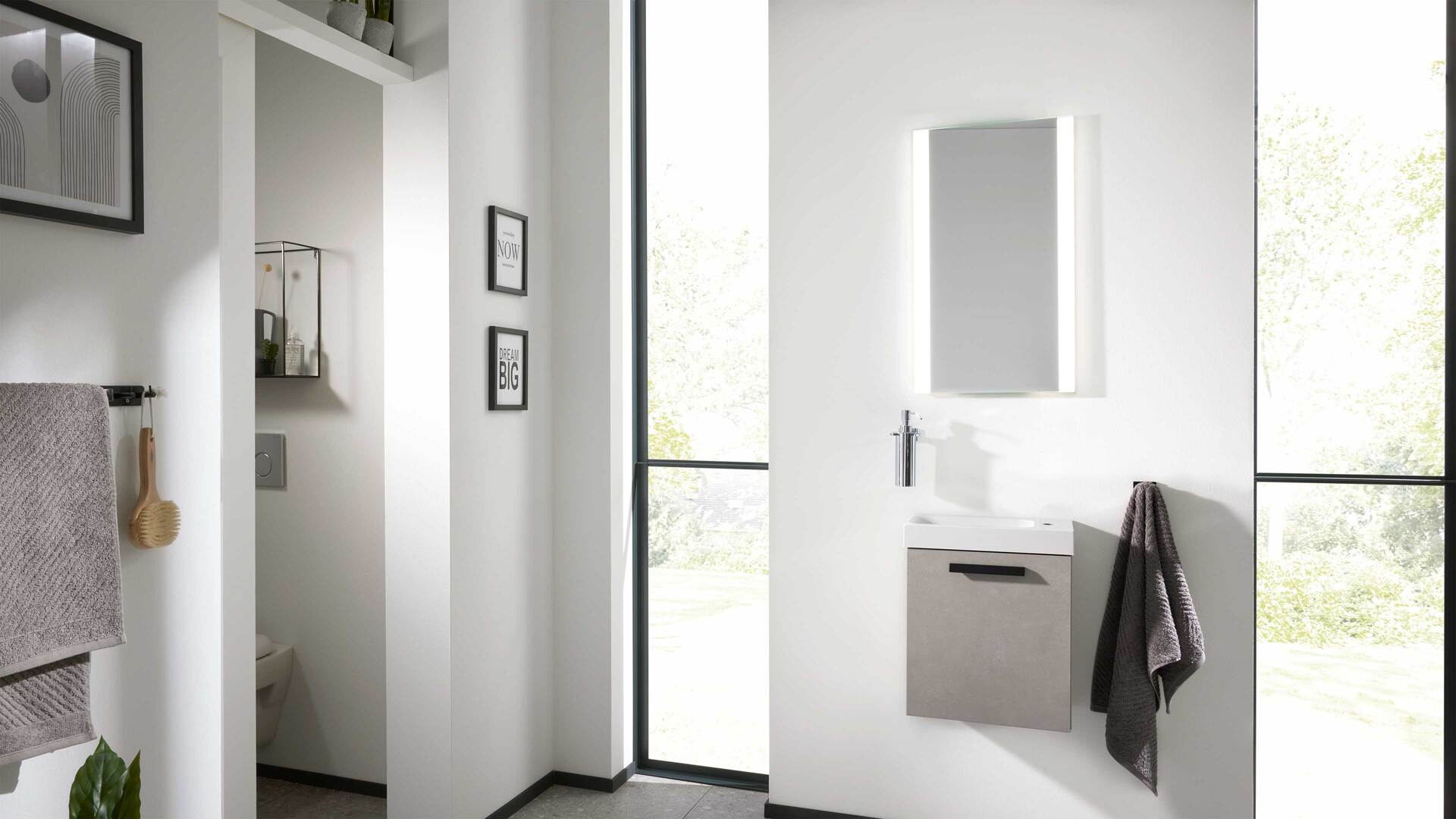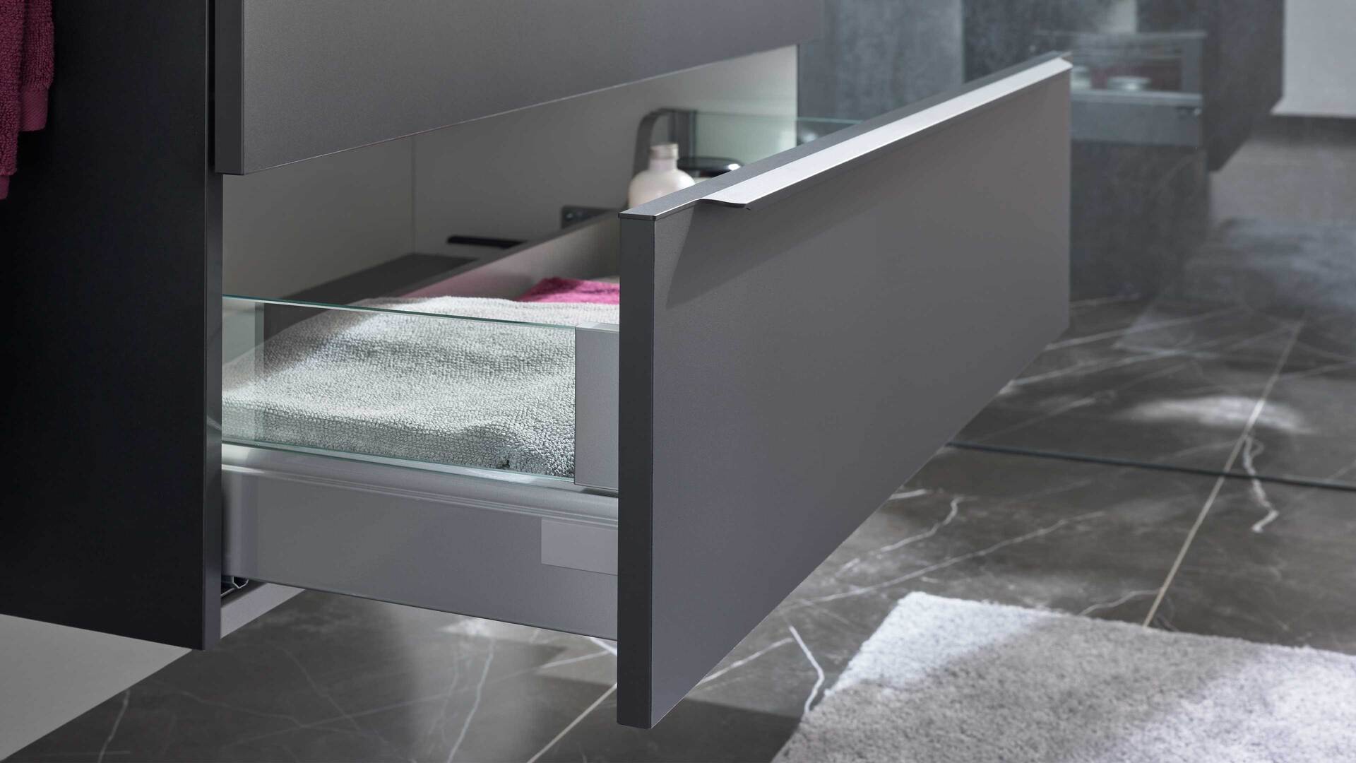 Der ca. 45 x 130 x 35 cm (BxHxT) große Midischrank mit supermatter graphitschwarzer Front, schwarzem Korpus und grifflosem Design ergänzt die Kombination perfekt. Mit Schließdämpfung, zwei höhenverstellbaren Einlegeböden, einem offenen Fach sowie einem beschichteten Abdeckboden bietet er flexible Organisation und Platz für Handtücher, Pflegeprodukte und Accessoires.