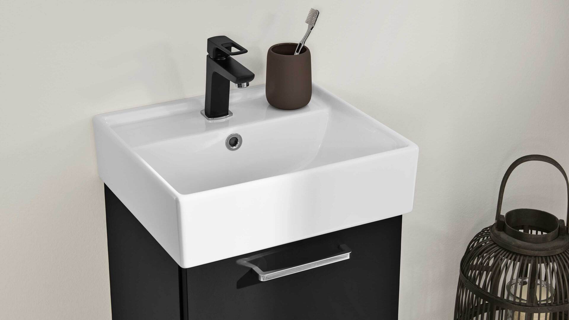 Der weiße Keramik-Möbelwaschtisch mit Hahnlochbohrung und Überlauf ist pflegeleicht und kompakt. Mit Maßen von ca. 43 x 19 x 39 cm (BxHxT) passt er perfekt in moderne Bäder. Ergänzt wird er durch die mattschwarze Einhand-Mischbatterie mit Chrom-Details, die dank Luftsprudler (24 mm Durchmesser), flexibler Anschlussschläuche und Zugstangen-Ablaufgarnitur nicht nur praktisch, sondern auch besonders komfortabel ist. Maße: ca. 12 x 15 cm (BxH).