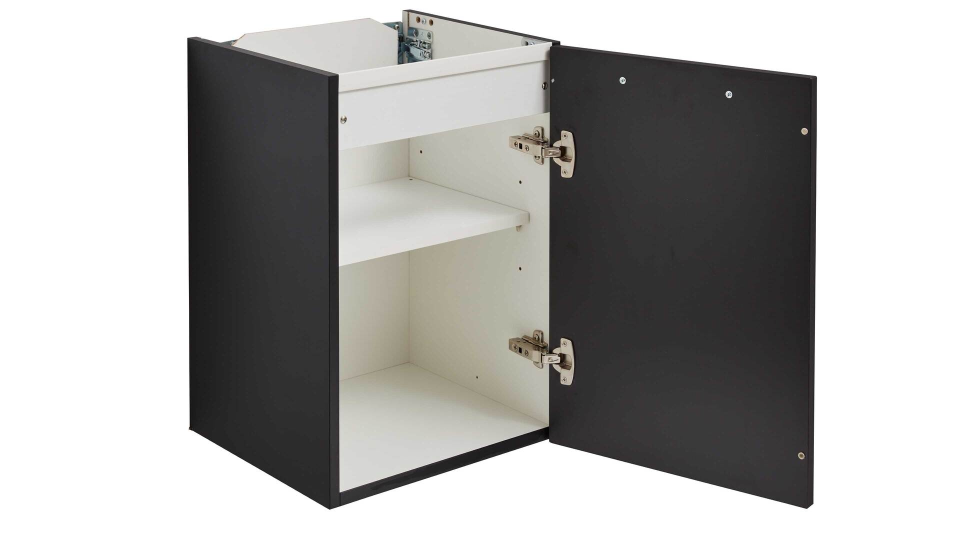 Der passende Waschtischunterschrank mit Innenblende bietet dir Stauraum auf kleinem Raum: eine Tür mit Schließdämpfung und ein höhenverstellbarer Einlegeboden sorgen für Ordnung und Flexibilität. Maße: ca. 40 x 58 x 35 cm (BxHxT).