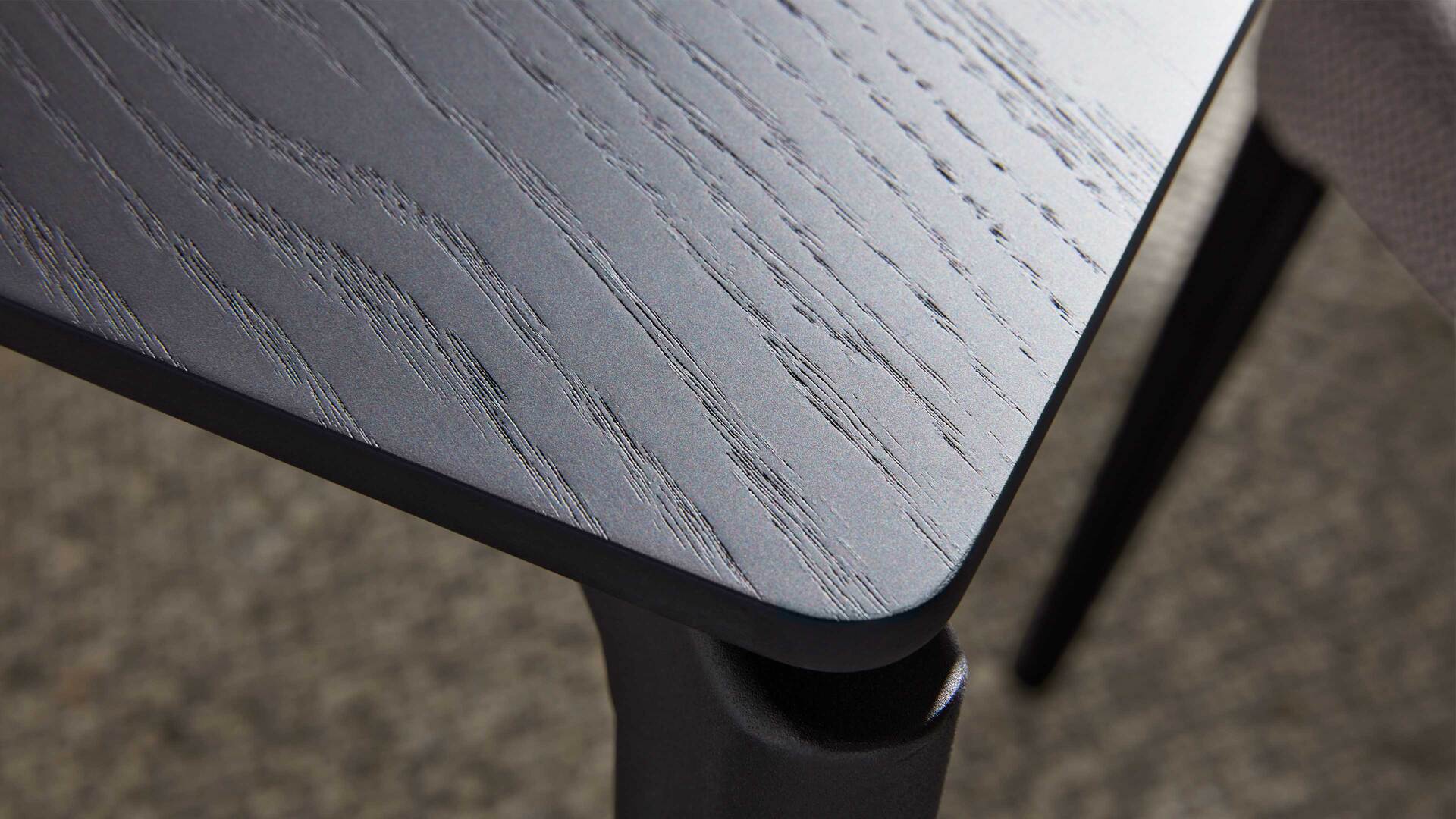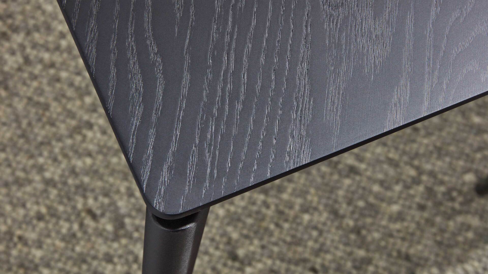 Hergestellt aus mattschwarzem Eichenholzfurnier, verströmt er extravagantes Flair. Füße aus mattschwarz pulverbeschichtetem Metall runden den Look harmonisch ab. Auch qualitativ weiß der Tisch zu überzeugen. Die Materialien sind robust, widerstandsfähig und langlebig.