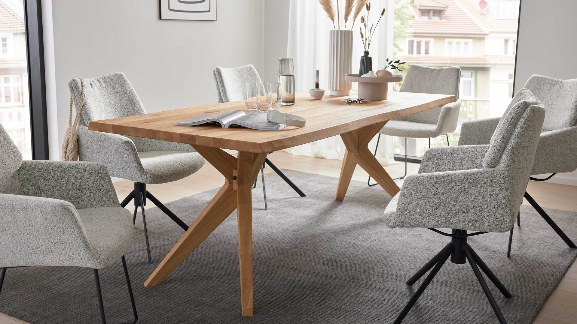 Ein Massivholztisch wie der Esstisch 6923 passt ideal in ein naturnahes oder skandinavisch inspiriertes Wohnkonzept. Kombinieren Sie ihn mit Armlehnstühlen in sanften Naturtönen oder warmem Anthrazit, um Kontraste zu schaffen und die Holzmaserung besonders zur Geltung zu bringen. Die Y-Gestell-Variante setzt ein stilvolles Statement – besonders in großzügigen Räumen mit offener Gestaltung.