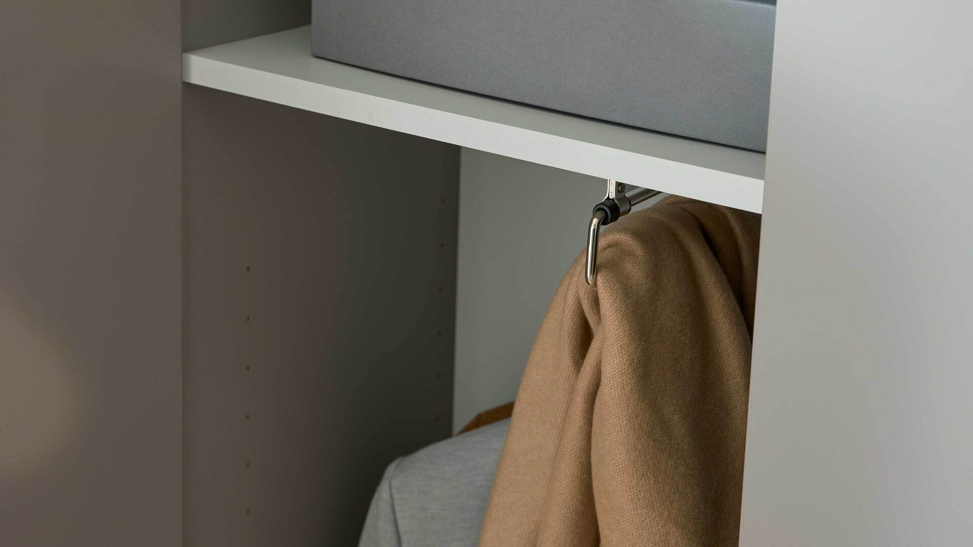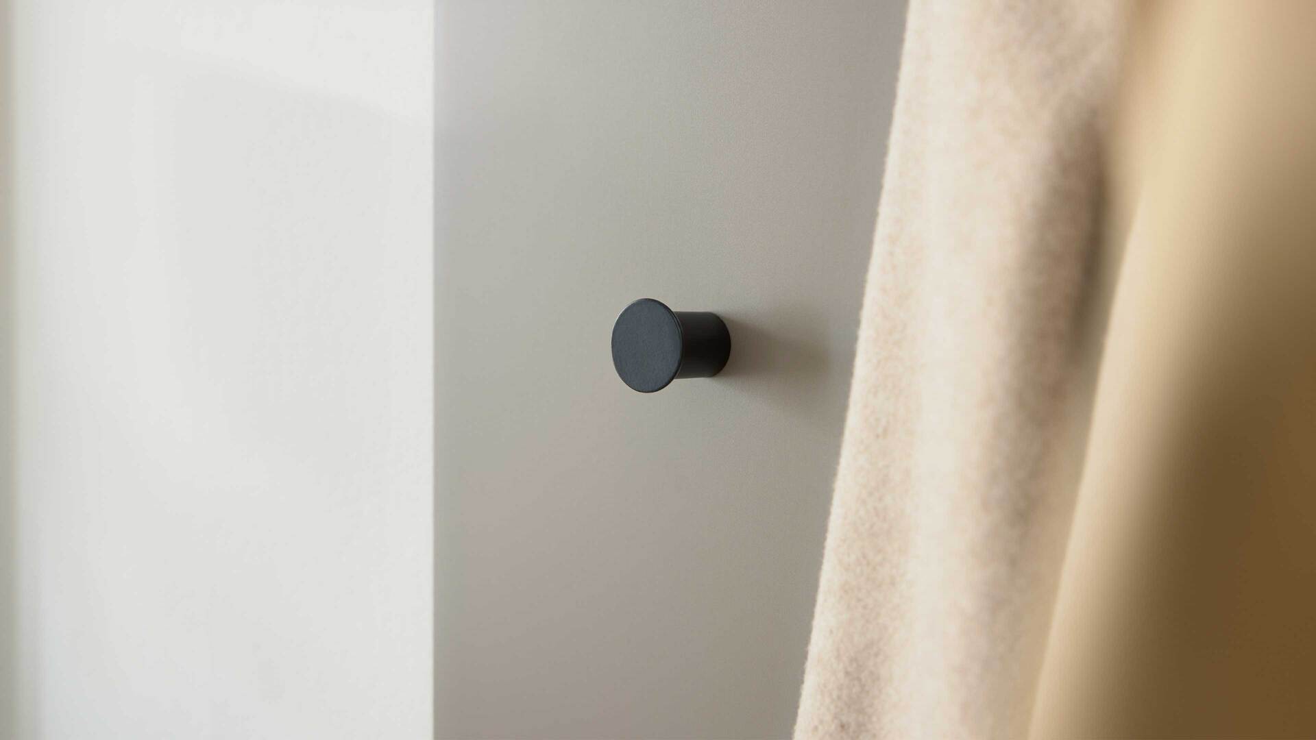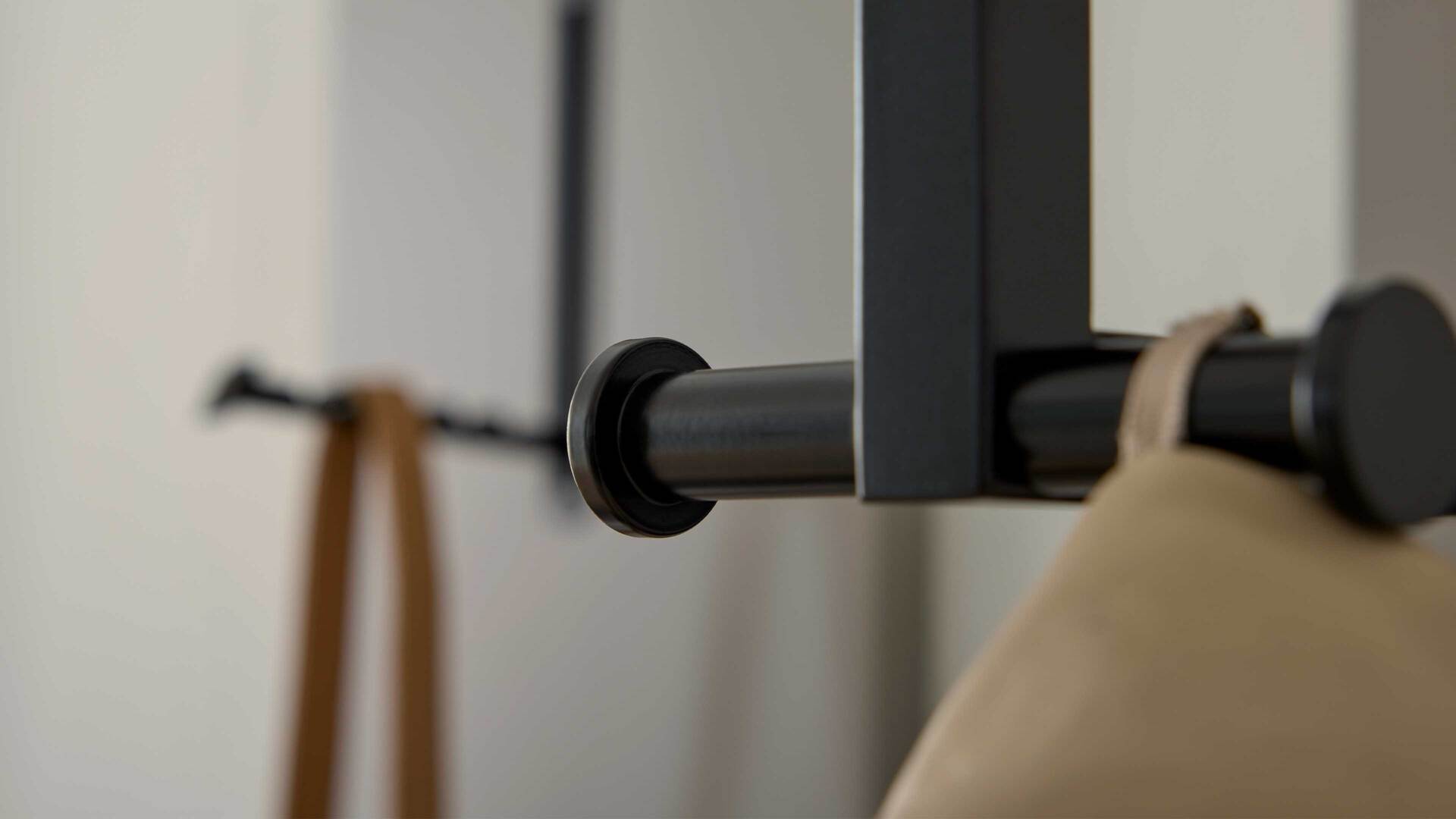 Dieses Paneel ist mit einer Kleiderstange und zwei stabilen Haken ausgestattet. Es bietet flexible Aufhängemöglichkeiten für Jacken, Mäntel oder Accessoires und ergänzt das Ensemble sowohl funktional als auch optisch.