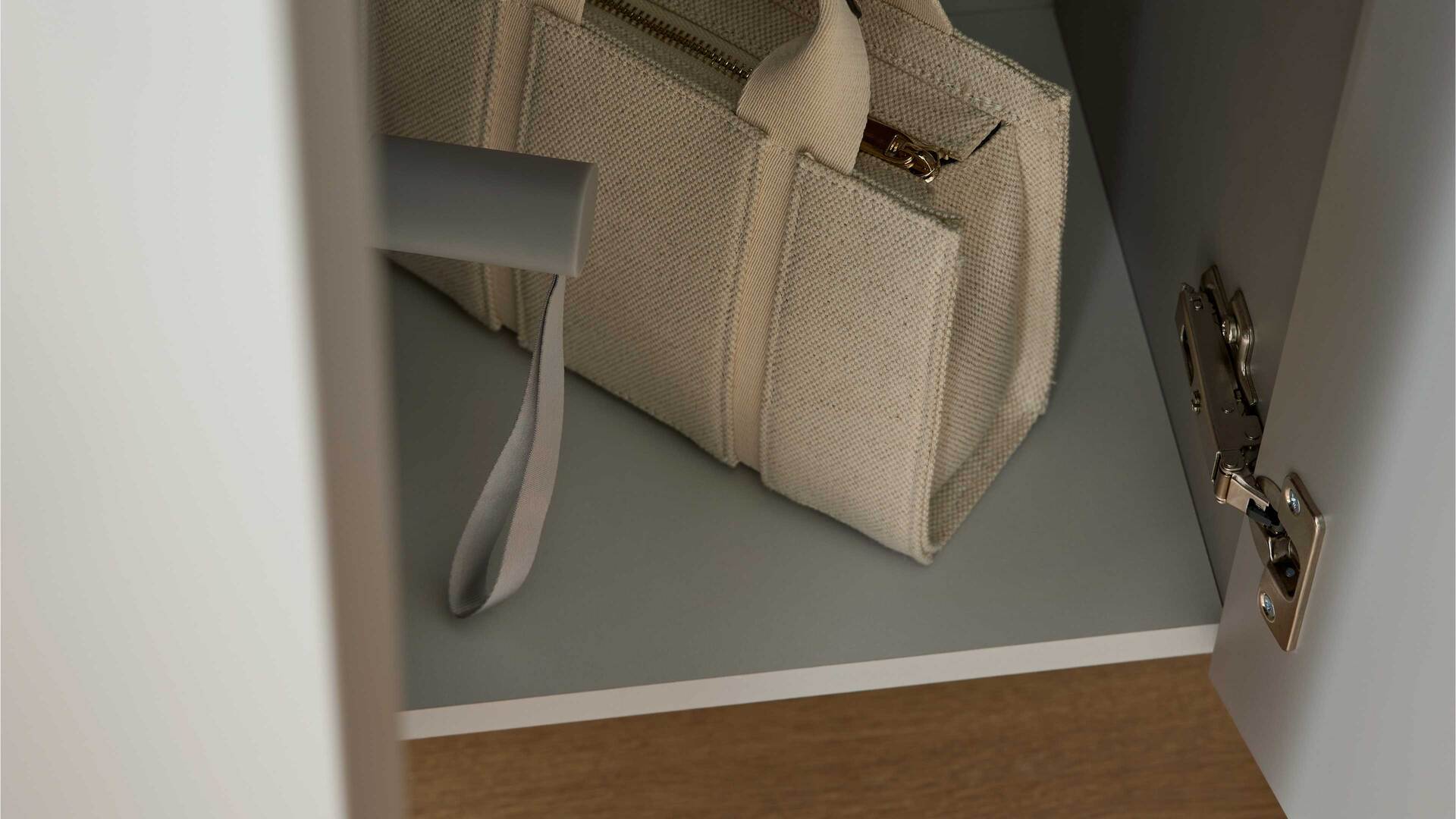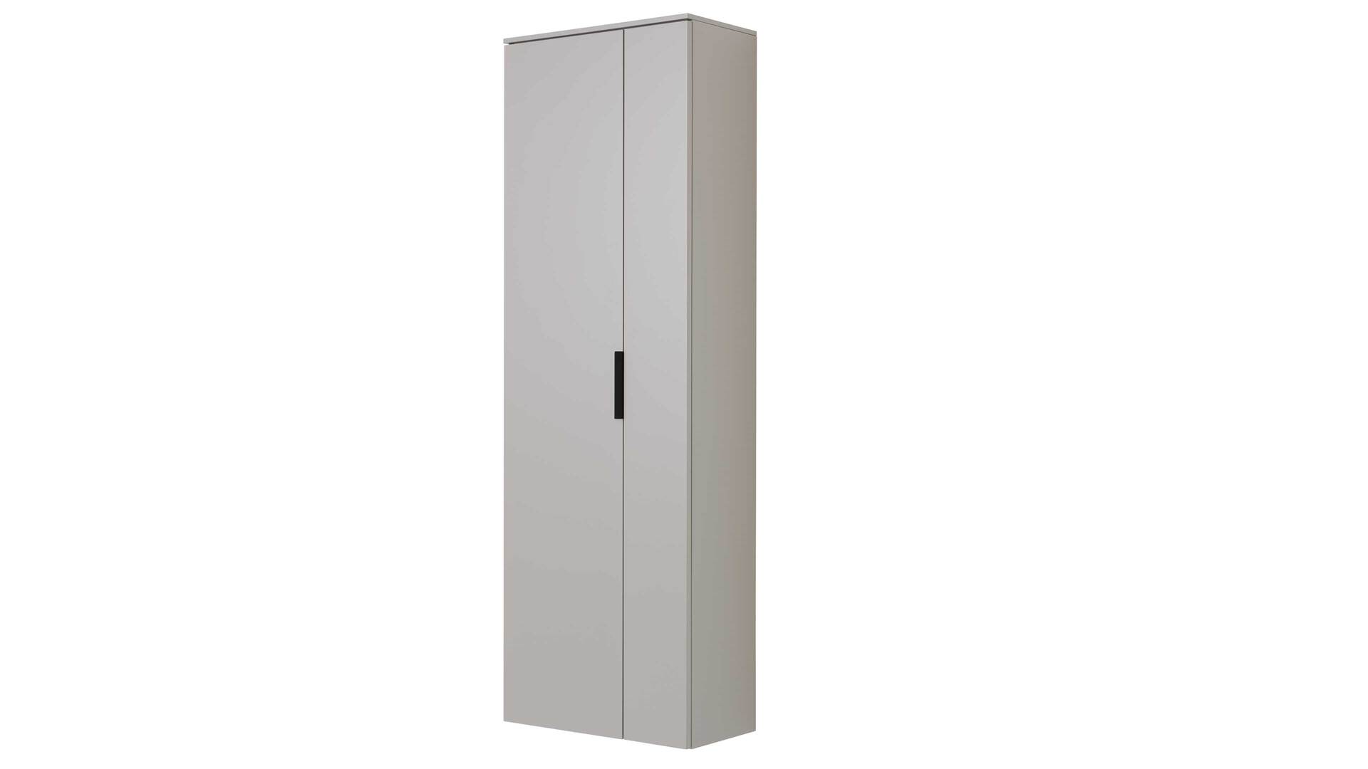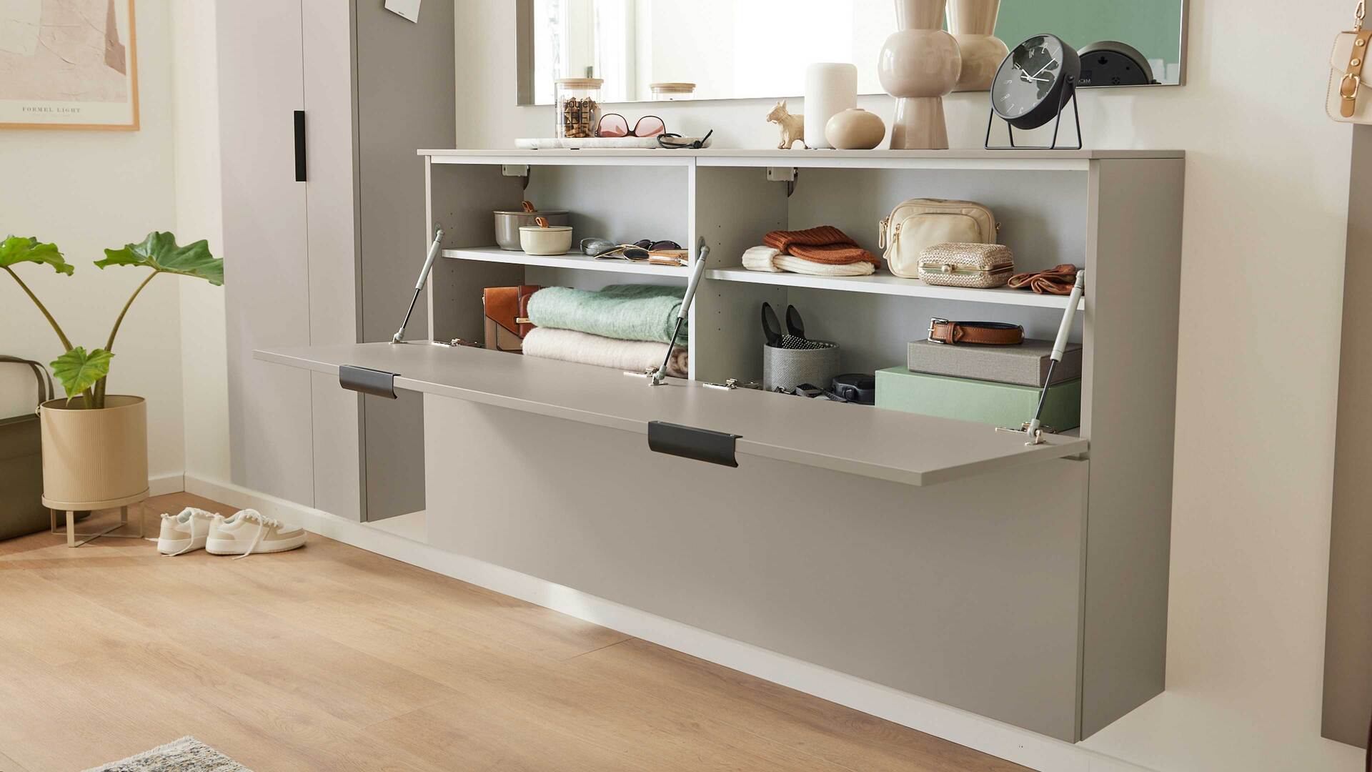 Der wandmontierte Dielenschrank bietet hinter zwei Drehtüren eine intelligente Innenaufteilung mit Einlegeboden und Kleiderstange – ideal für Jacken, Mäntel oder Taschen. Die schwebende Optik verleiht dem Raum Leichtigkeit und erleichtert die Bodenreinigung.