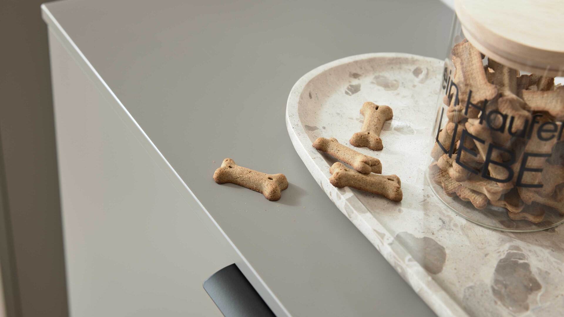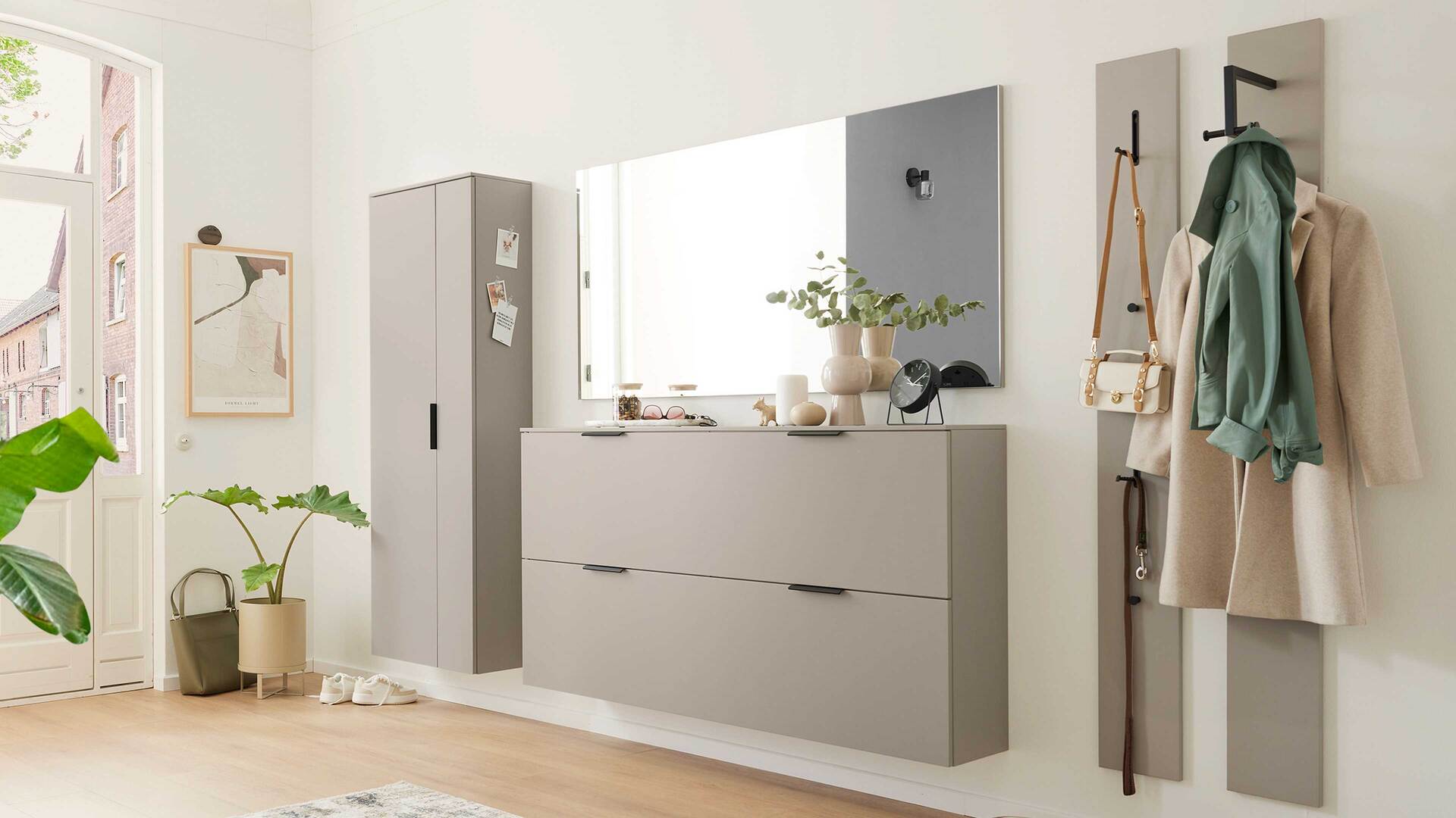 Der rahmenlose Wandspiegel mit Rückwand in graubeigem Mattlack bringt optische Weite und Helligkeit in den Flur. Ideal über der Schuhkommode platziert, unterstützt er den freundlichen Gesamteindruck des Sets.