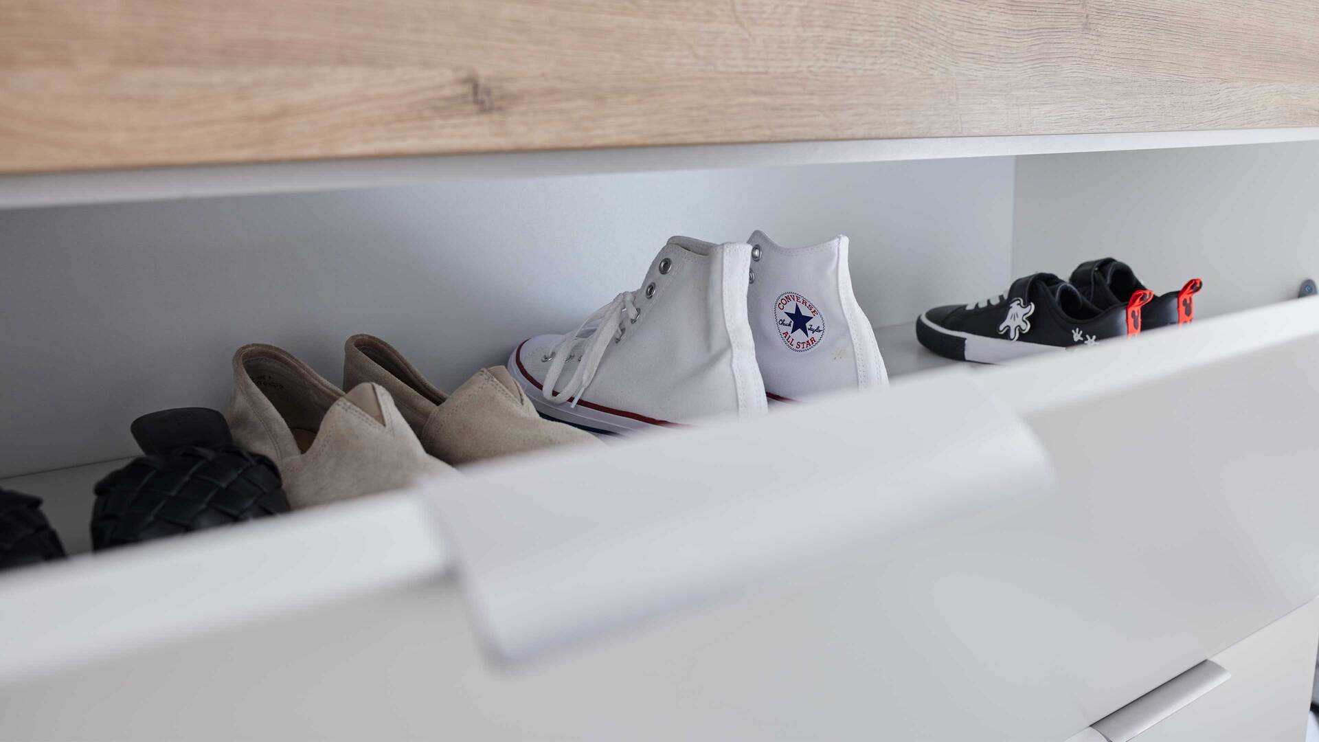 Hinter den beiden großzügigen Klapptüren verbirgt sich eine clevere Innenaufteilung: Vier Einlegeböden bieten reichlich Platz für Sneaker, Stiefeletten, Sandalen oder Sportschuhe. Die leichtgängige Klappmechanik sorgt dafür, dass du jederzeit bequem an deine Lieblingspaare kommst – besonders praktisch bei häufigem Schuhwechsel oder für Familien mit vielen Schuhen.