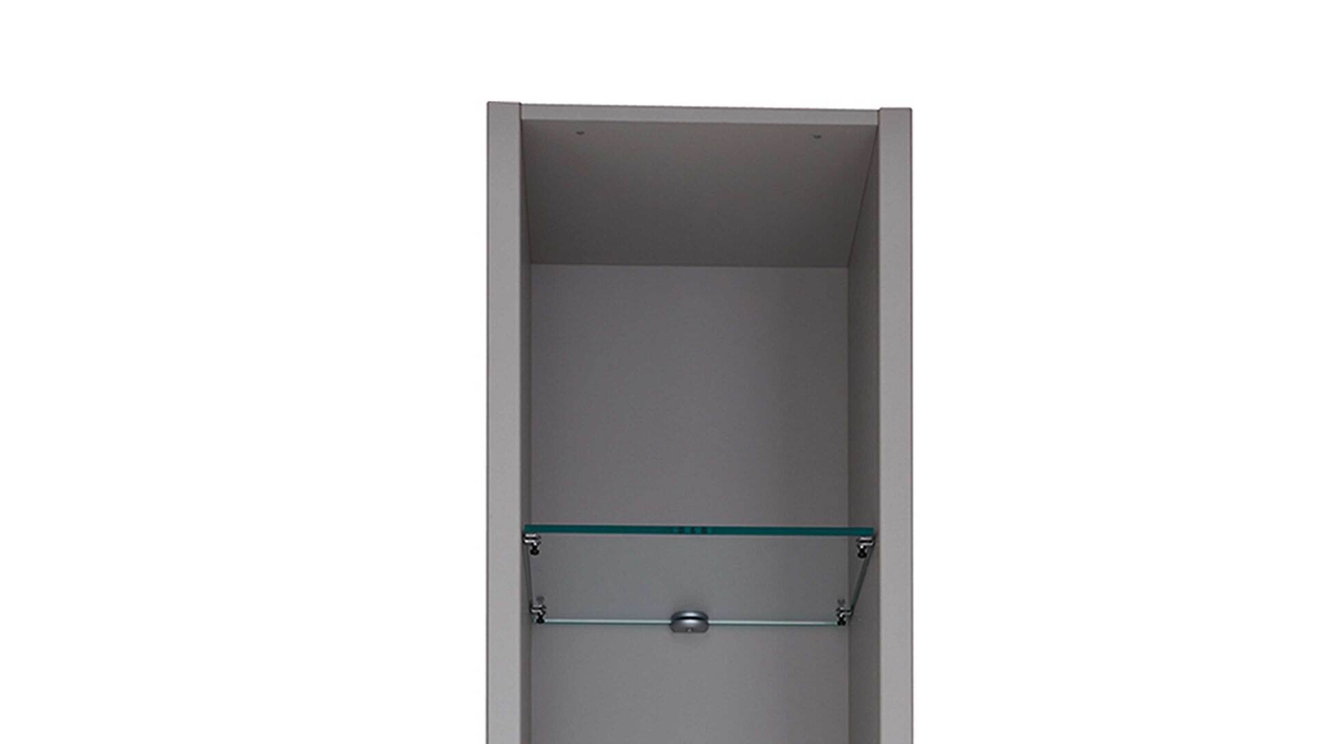 Die kieselgrauen Kunststoffoberflächen sorgen für eine zurückhaltend-edle Optik mit angenehm samtiger Haptik. Das schlichte, geradlinige Design fügt sich harmonisch in unterschiedliche Wohnkonzepte ein – von minimalistisch bis elegant. Die fünf Klarglasböden sorgen für optische Transparenz und bieten eine leichte, fast schwebende Anmutung.