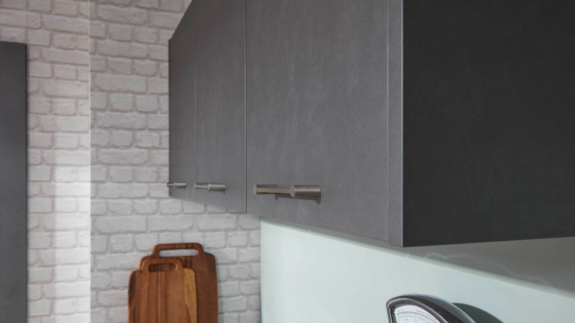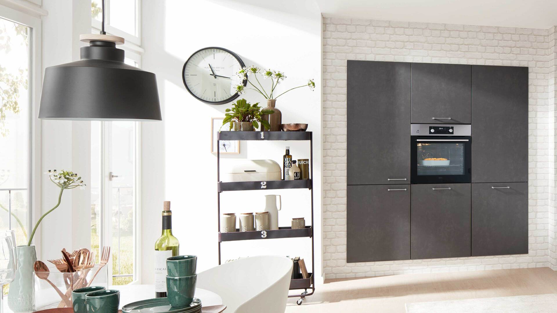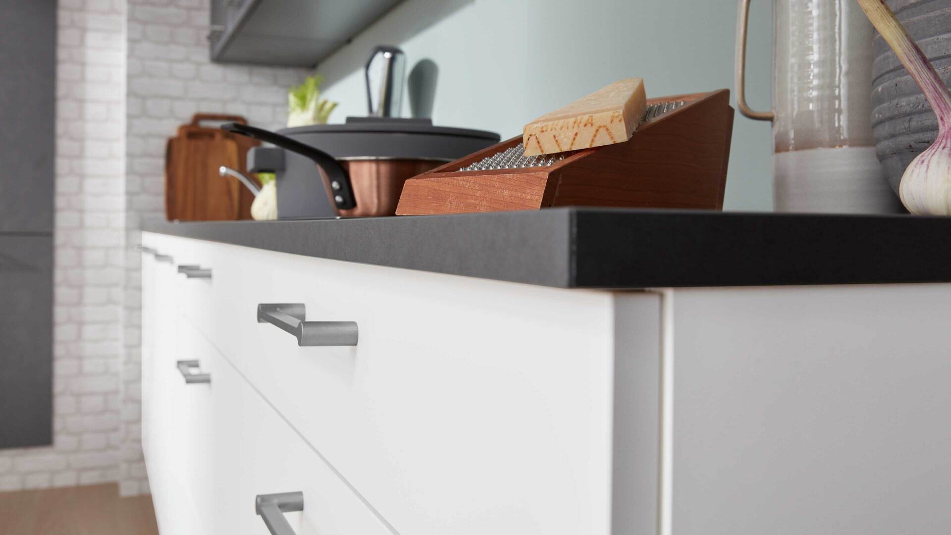 Die Interliving Küche Serie 3019 bringt moderne Eleganz in dein Zuhause. Ihr Design lebt vom spannenden Kontrast: quarzgraue Korpusse treffen auf softmatte weiße und stahlgraue Kunststoffoberflächen. Ergänzt wird das Farbkonzept durch weiße Sockelblenden und stahlgraue Arbeitsplatten, die der Küche eine ruhige, edle Ausstrahlung verleihen. Praktische Metall-Bügelgriffe runden den Look funktional und formschön ab.
