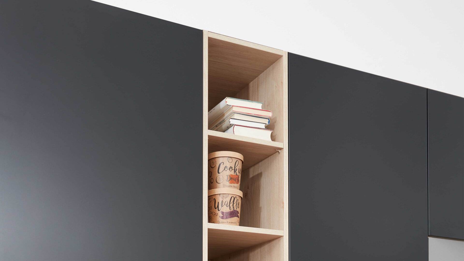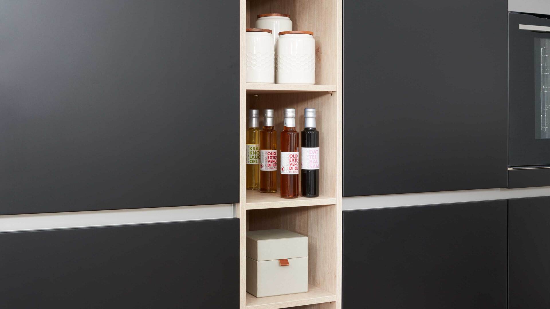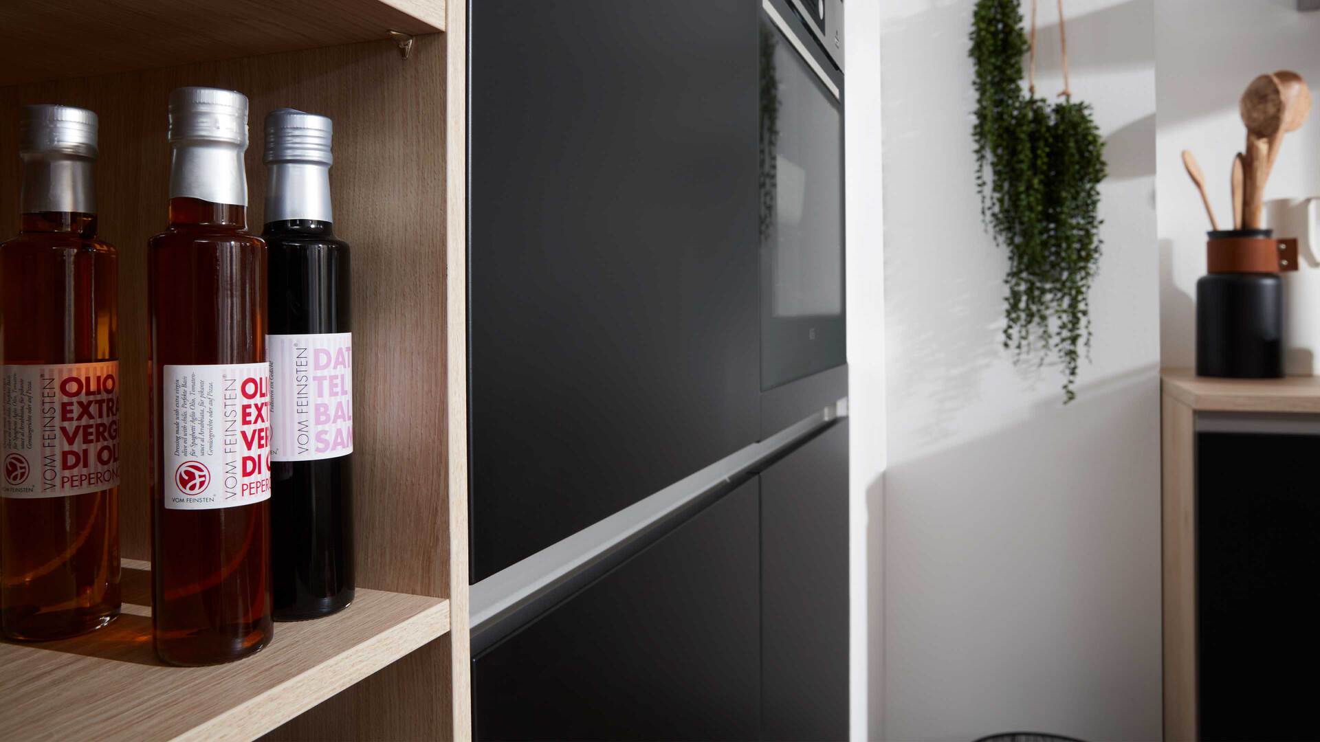 Die Interliving Küche Serie 3024 verbindet modernes Design mit natürlicher Wärme. Ihre grifflosen mattschwarzen Lackfronten wirken edel und elegant, während Regale, Arbeitsplatten und Sockelblenden in Asteiche-Nachbildung für ein wohnliches Ambiente sorgen. Dieser markante Hell-Dunkel-Kontrast macht die Planküche zu einem echten Blickfang.
