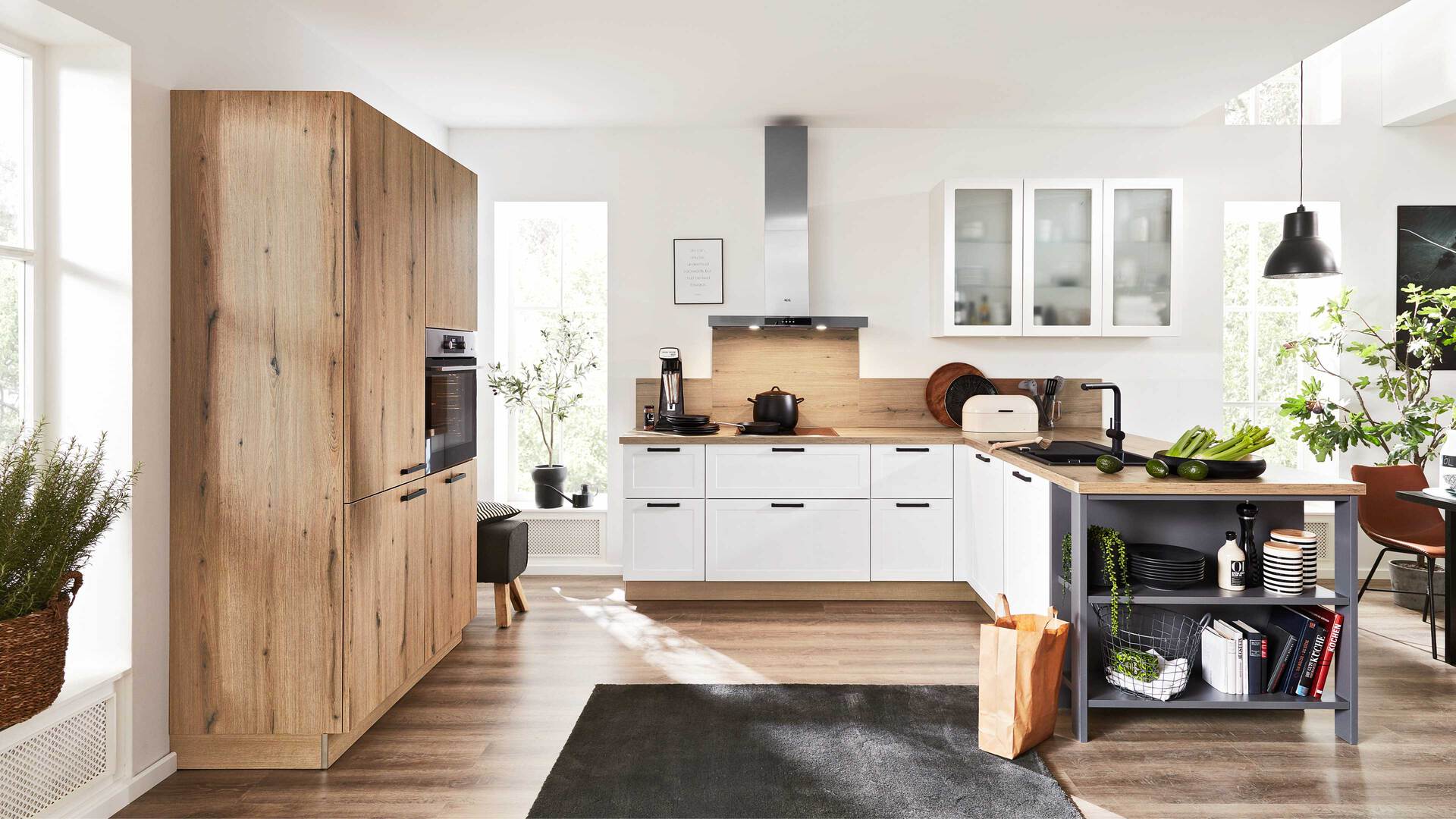 Interliving Küche Serie 3029 – stilvoller Mix aus Weiß, Quarzgrau und Vulkaneiche