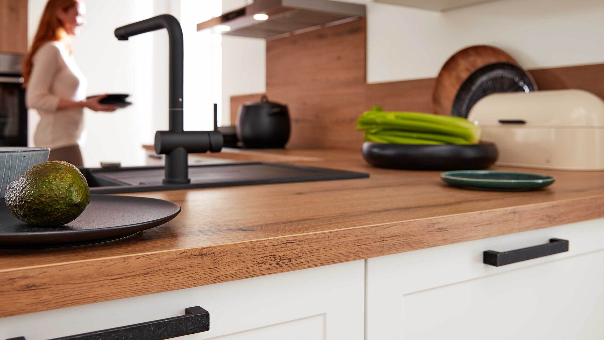 Im Lieferumfang enthalten sind hochwertige Geräte von AEG, die für Komfort und Langlebigkeit stehen: der autarke Steambake-Backofen BD31M (Energieeffizienzklasse A, Spektrum A+++ bis D), der Kühlschrank NSK5O88ES (Energieeffizienzklasse E, Spektrum A bis G), das autarke Kochfeld HD6460K (ca. 60 cm breit) sowie die Inselhaube DBB3951M (ca. 90 cm breit, Energieeffizienzklasse C, Spektrum A+++ bis D). Ergänzt wird die Küche durch eine mattschwarze Interliving Einbauspüle mit passender schwarzer Einhand-Mischbatterie.