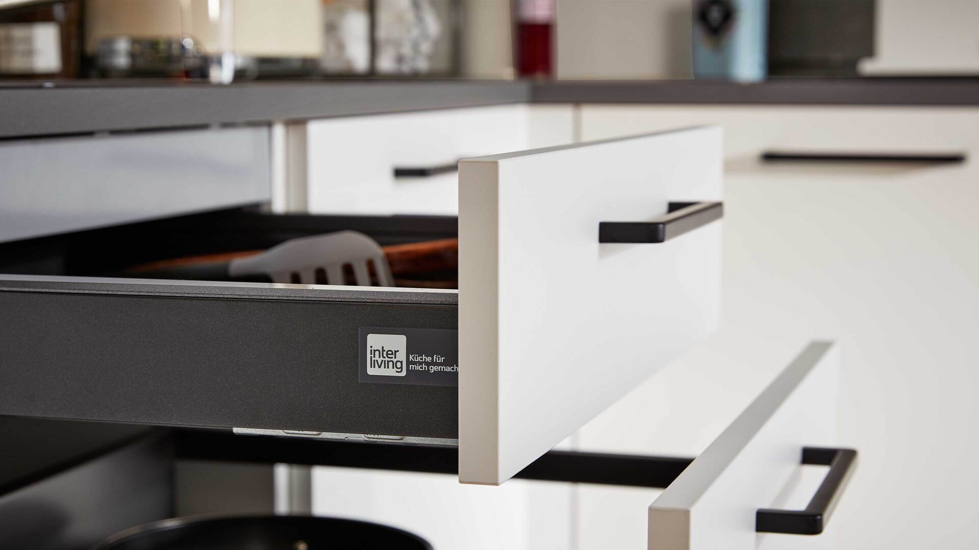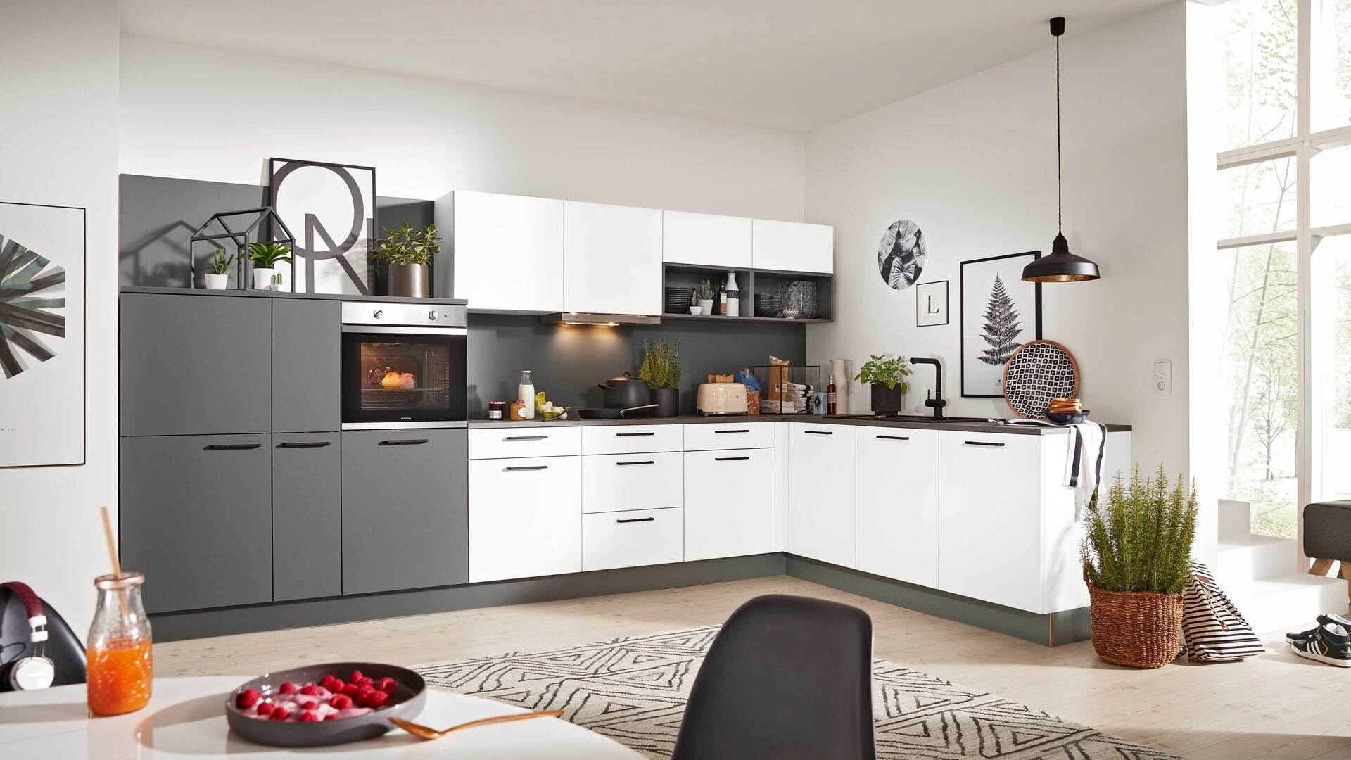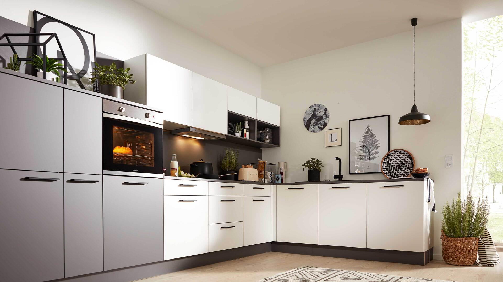 Die Interliving Küche Serie 3032 setzt auf schlichte Eleganz mit einem modernen Twist. Softmatte Lacklaminatfronten in Weiß und Quarzgrau prägen den harmonischen Look. Der premiumweiße Korpus bringt Helligkeit und Leichtigkeit in den Raum, während Arbeitsplatten und Sockelblenden den quarzgrauen Farbton wieder aufgreifen. Schwarze Metallgriffe setzen spannende Akzente und runden das Design stilvoll ab.