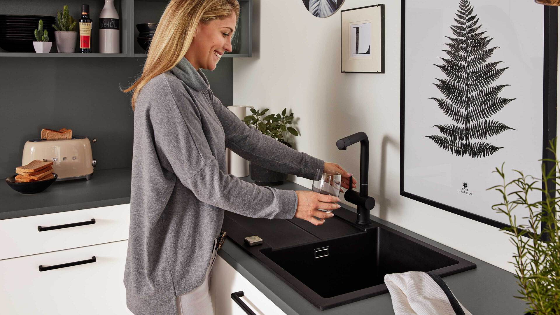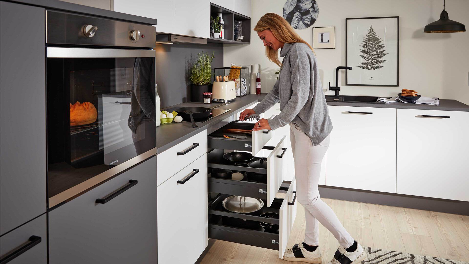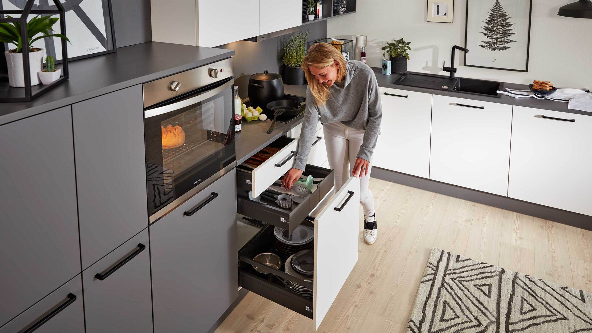 Die Interliving Küche Serie 3032 setzt auf schlichte Eleganz mit einem modernen Twist. Softmatte Lacklaminatfronten in Weiß und Quarzgrau prägen den harmonischen Look. Der premiumweiße Korpus bringt Helligkeit und Leichtigkeit in den Raum, während Arbeitsplatten und Sockelblenden den quarzgrauen Farbton wieder aufgreifen. Schwarze Metallgriffe setzen spannende Akzente und runden das Design stilvoll ab.