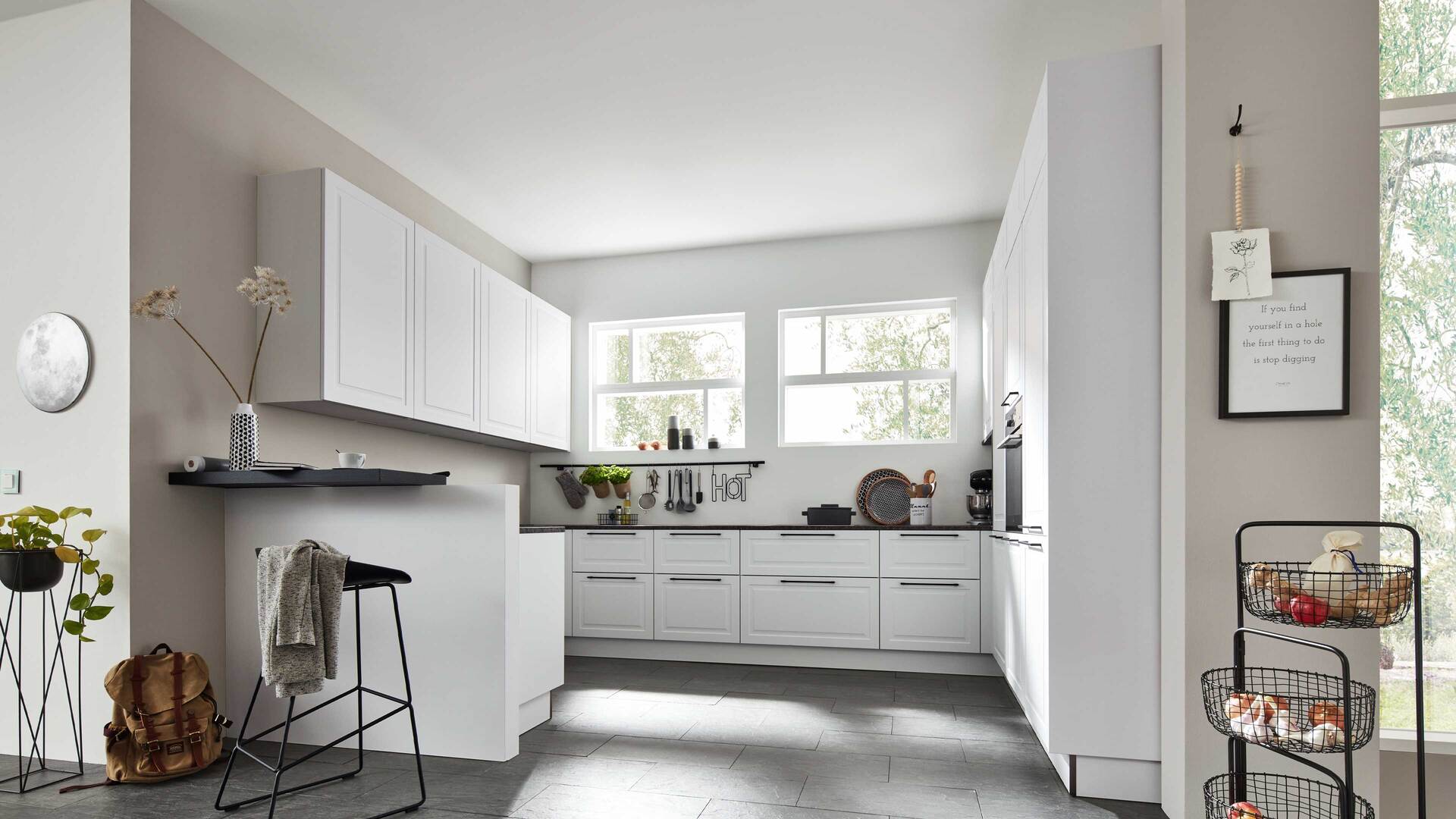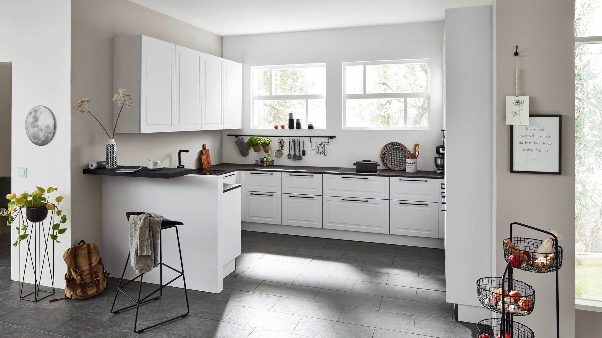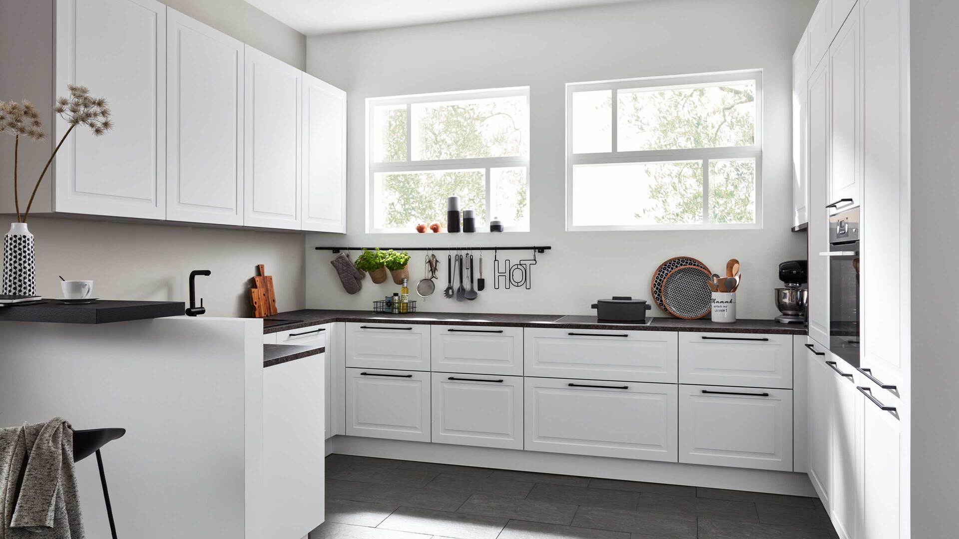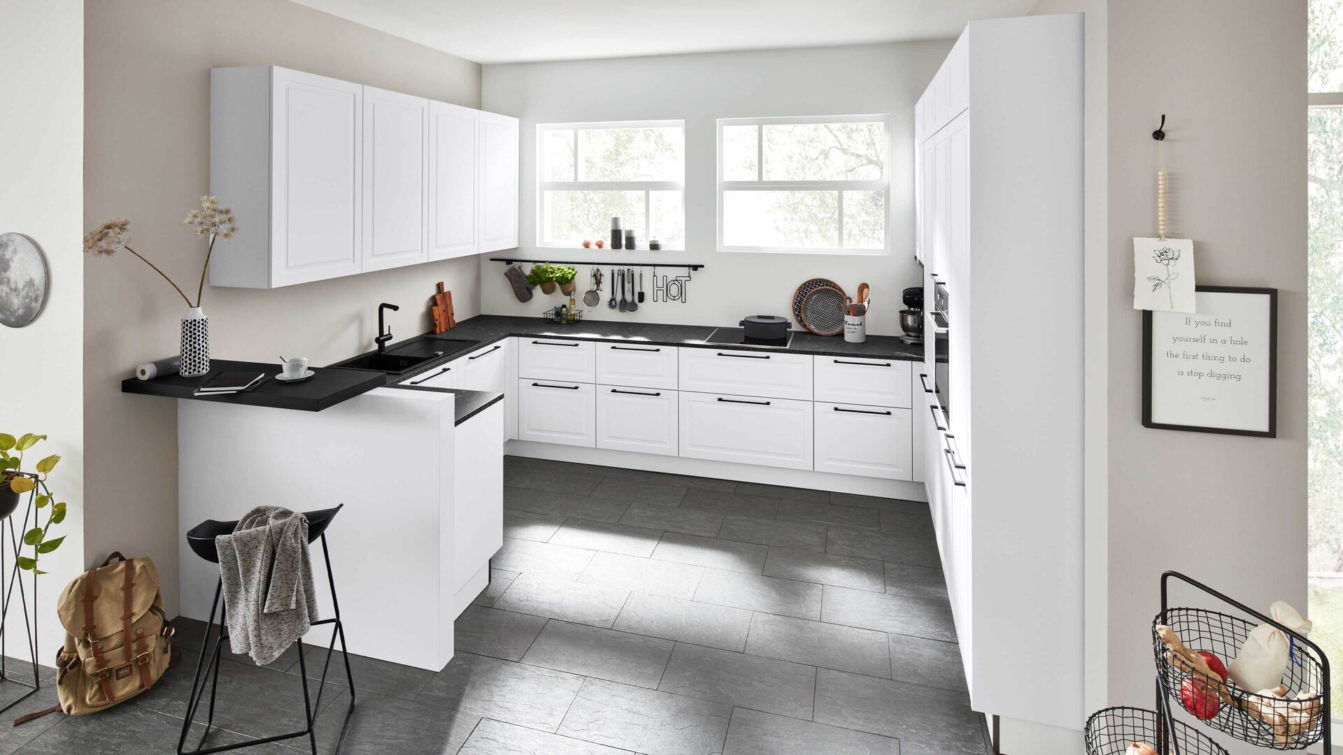 Interliving Küche Serie 3045 – moderne U-Küche in Weiß mit schwarzem Akzent
