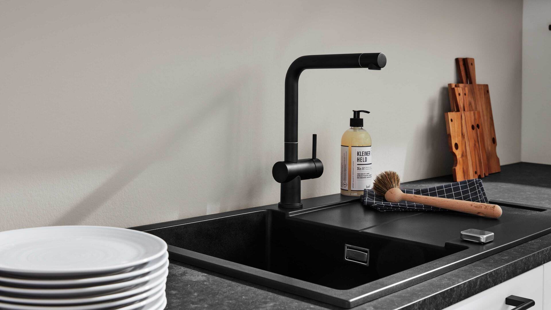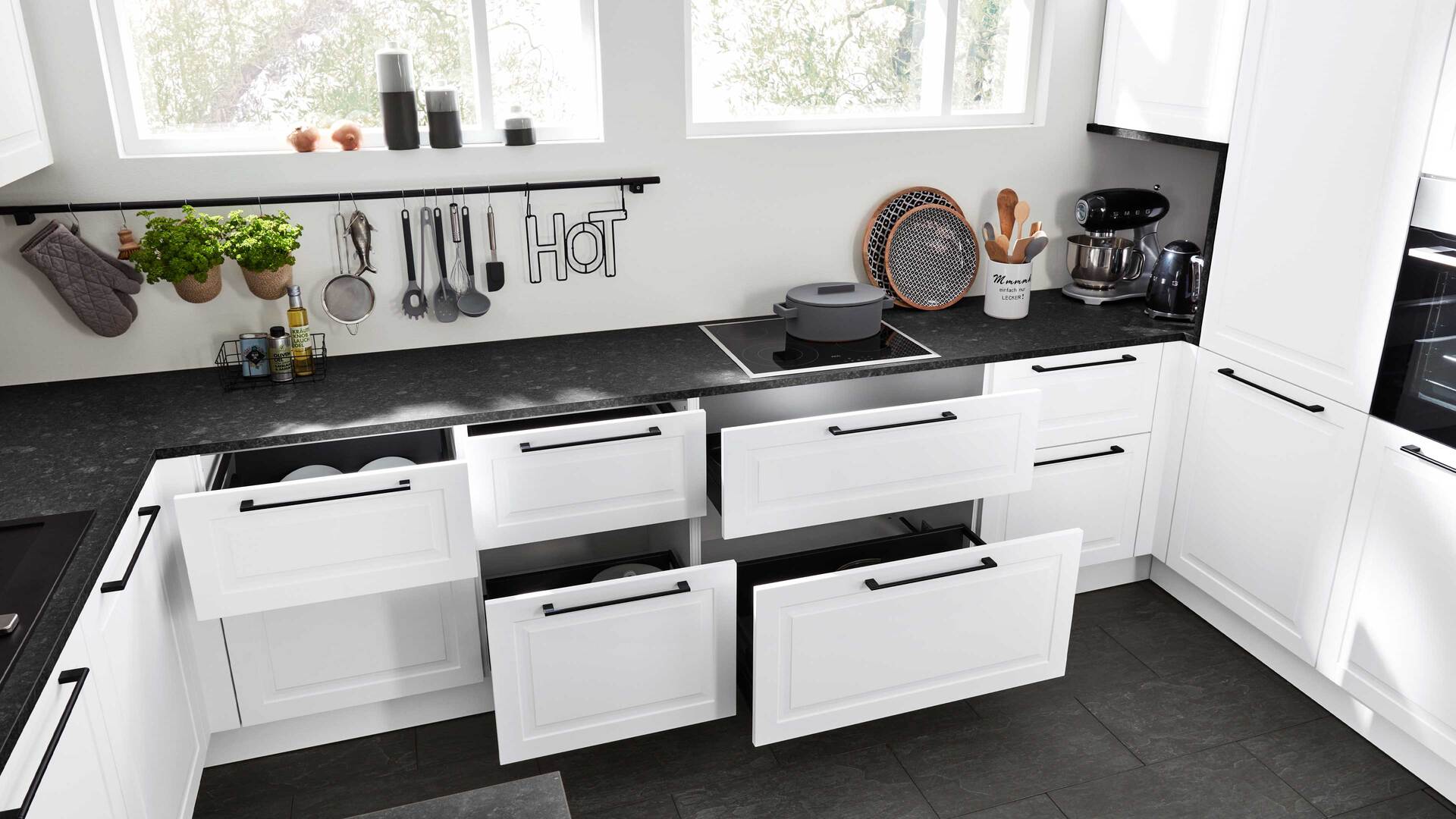 Auch funktional überzeugt die Küche auf ganzer Linie. Die U-Form bietet reichlich Platz für Küchenutensilien, Geschirr und Vorräte. Mit einer Stellfläche von ca. 285 x 400 cm (BxL) und Schenkelmaßen von ca. 285 x 400 x 247,5 cm (BxLxB, von links nach rechts) ist sie großzügig dimensioniert. Eine edel-mattschwarze Interliving Einbauspüle mit passender schwarzer Einhebel-Mischbatterie ist ebenfalls Teil der Ausstattung und fügt sich harmonisch ins Gesamtbild ein.
