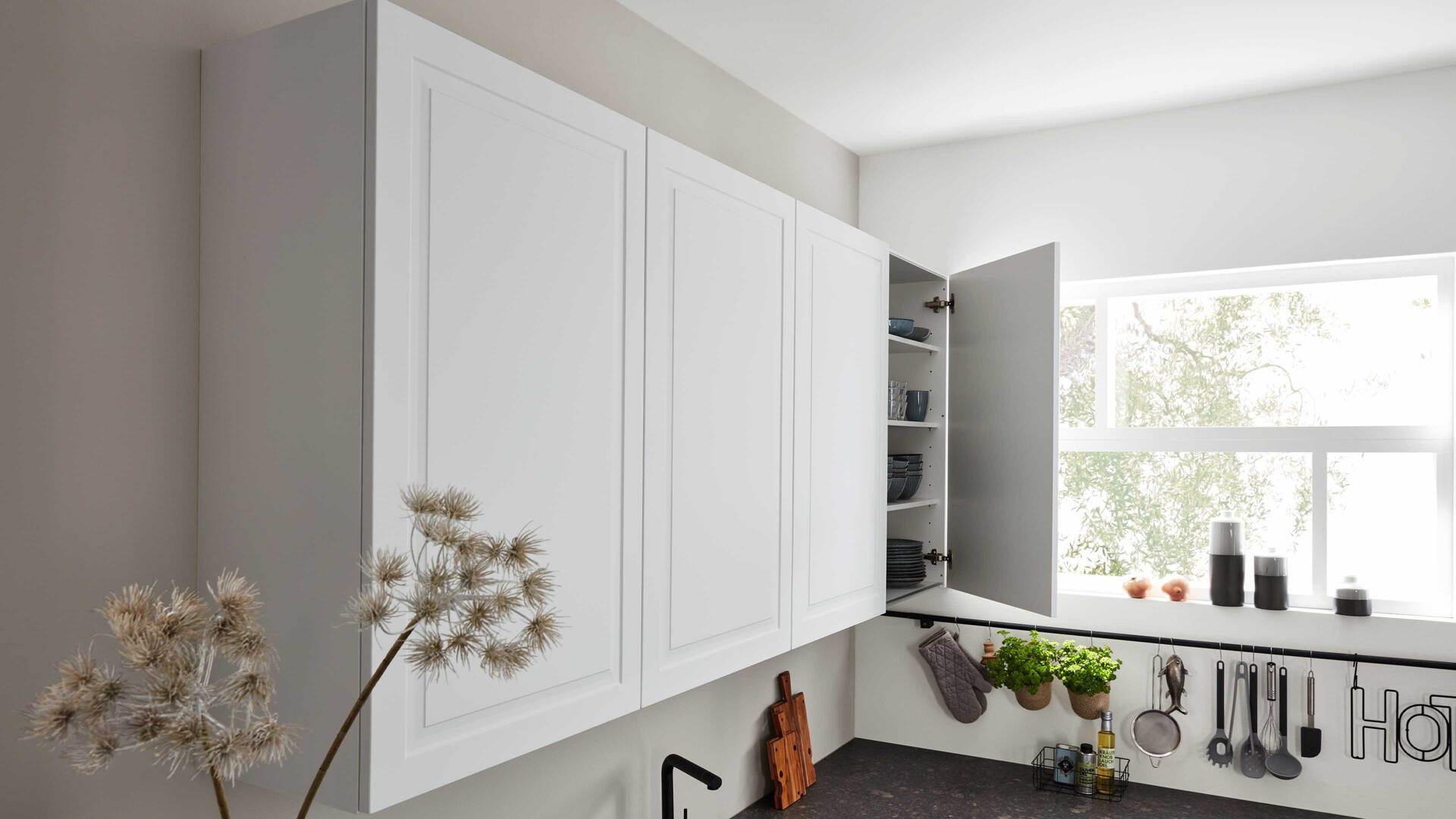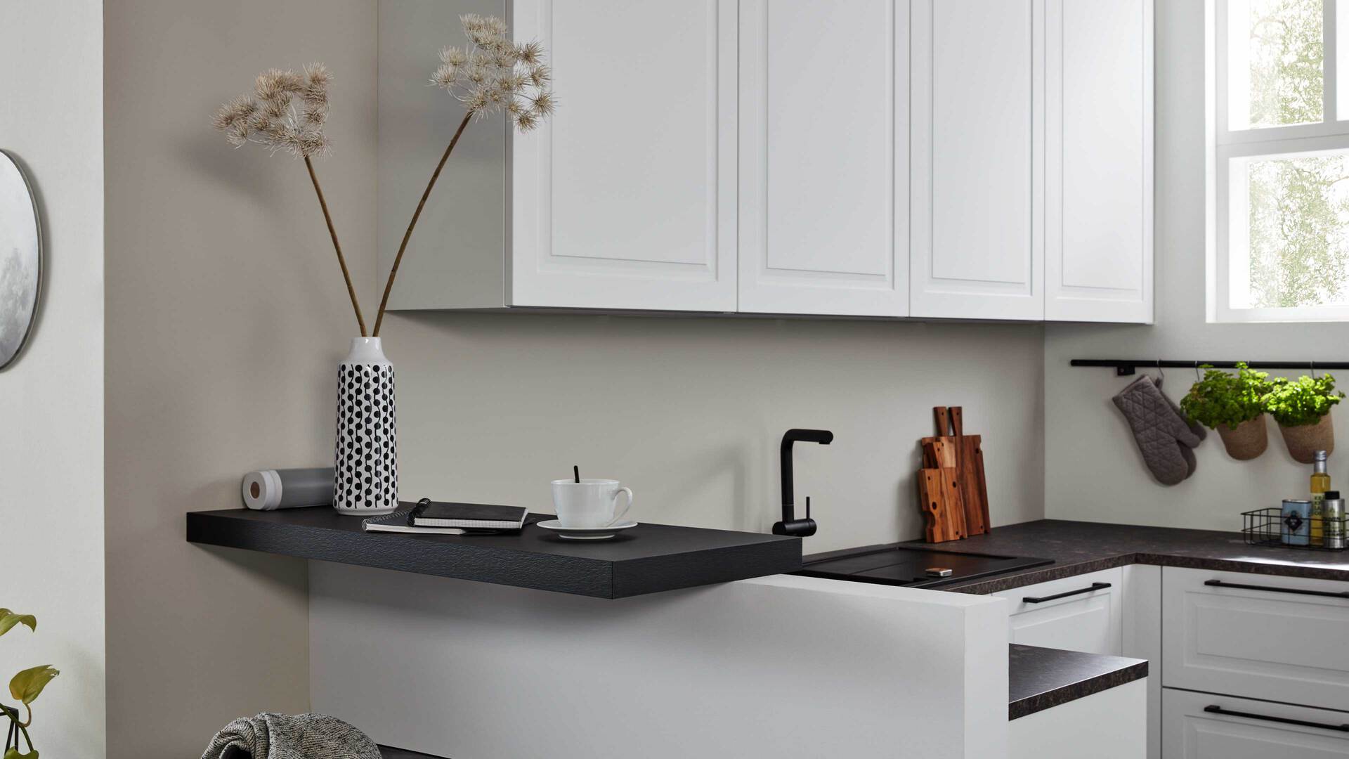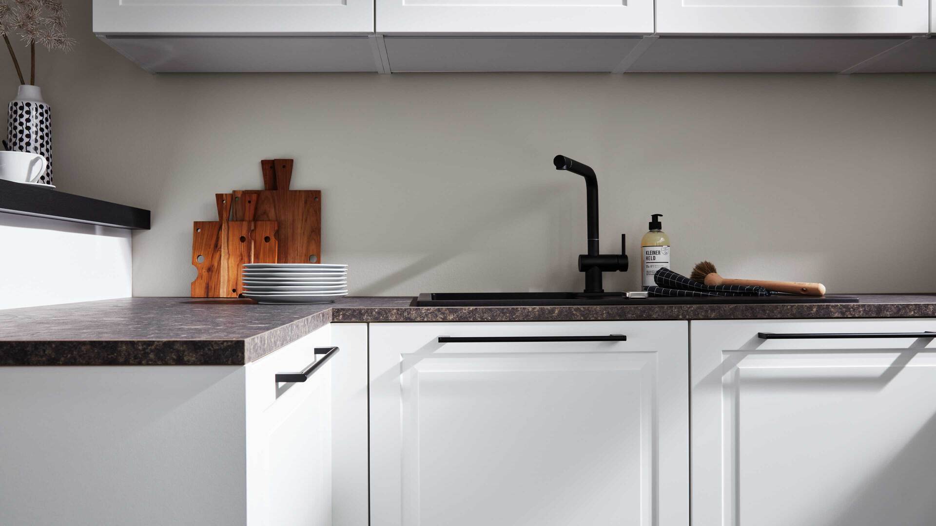 Die Interliving Küche Serie 3045 verbindet klassische Schlichtheit mit modernen Details. Ihre softmatten weißen Fronten wirken zeitlos elegant und harmonieren perfekt mit den premiumweißen Korpussen und Sockelblenden. Für spannende Kontraste sorgen die Arbeitsplatten im Farbton Terra Mare sowie die schwarzen Griffe und der schwarze Tresen, die dem Design eine stilvolle Landhausnote verleihen.