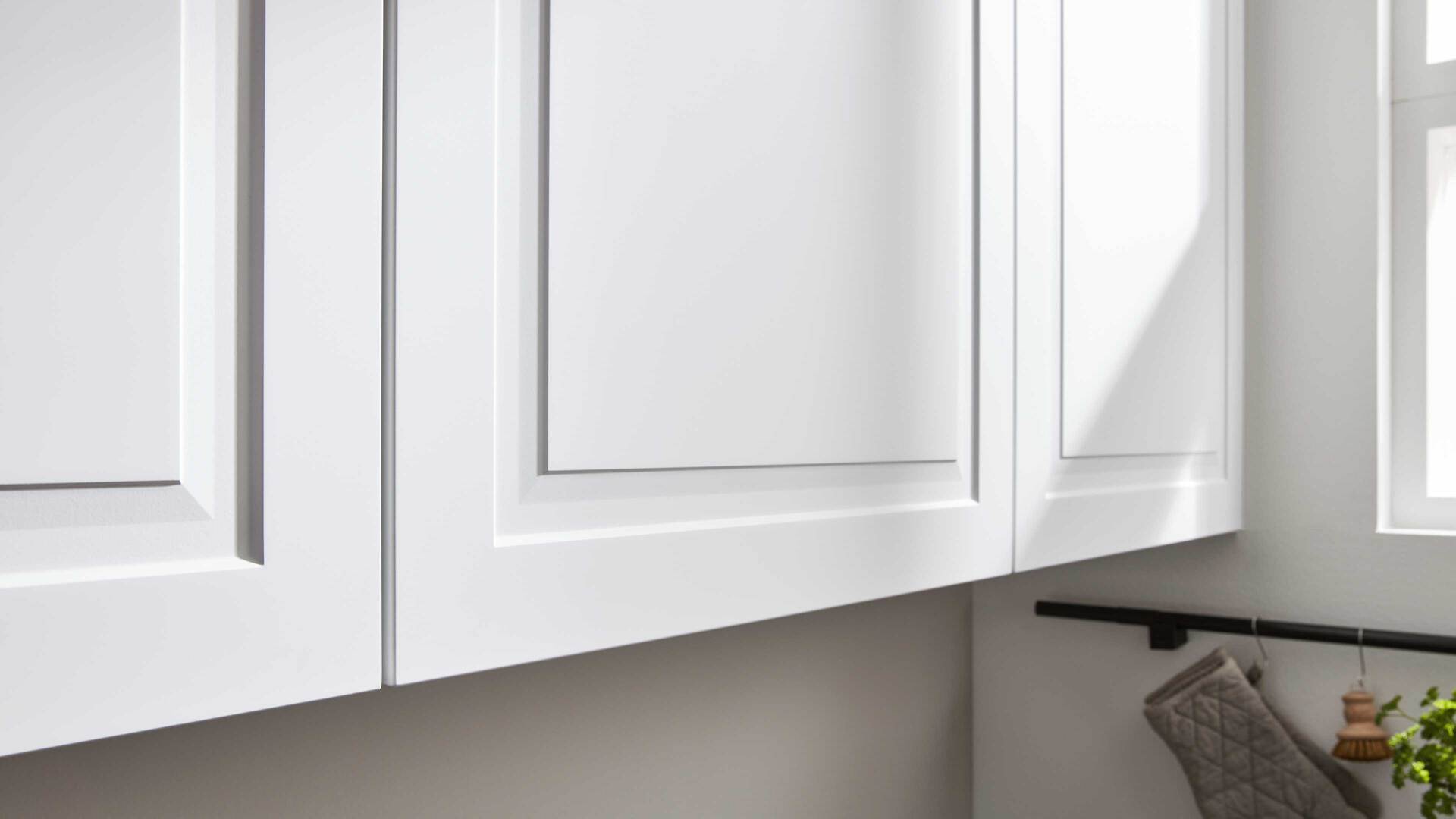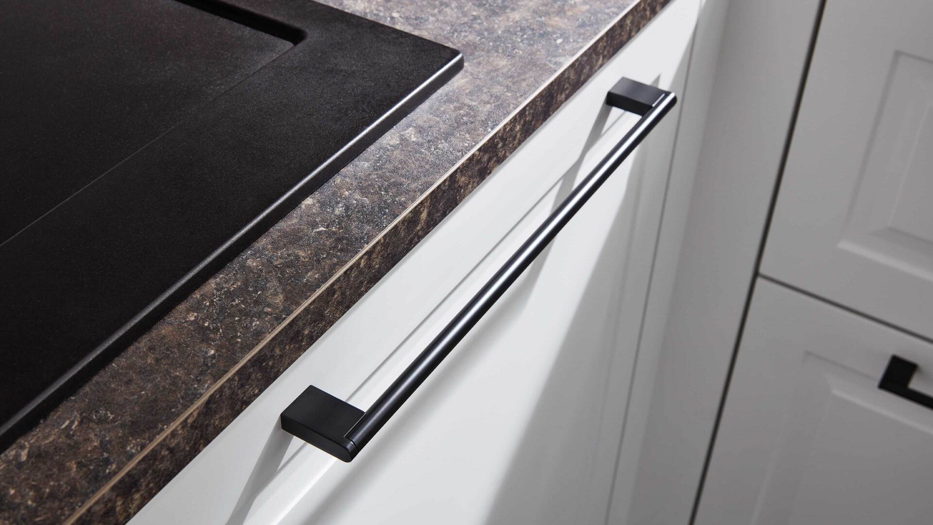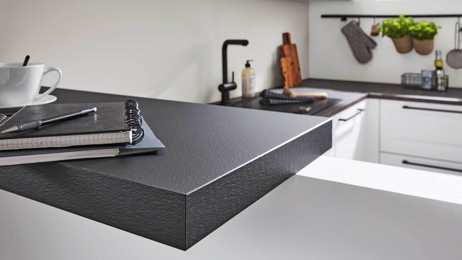 Die Interliving Küche Serie 3045 verbindet klassische Schlichtheit mit modernen Details. Ihre softmatten weißen Fronten wirken zeitlos elegant und harmonieren perfekt mit den premiumweißen Korpussen und Sockelblenden. Für spannende Kontraste sorgen die Arbeitsplatten im Farbton Terra Mare sowie die schwarzen Griffe und der schwarze Tresen, die dem Design eine stilvolle Landhausnote verleihen.
