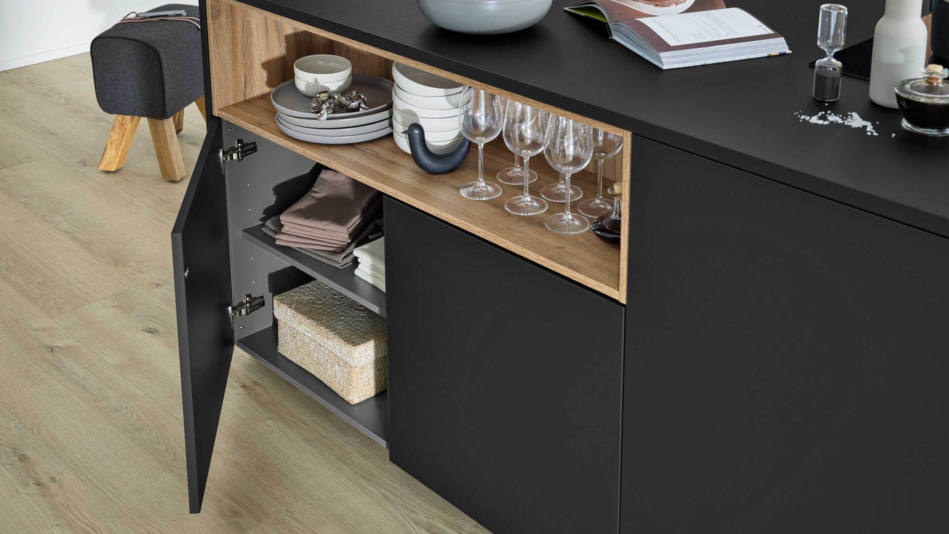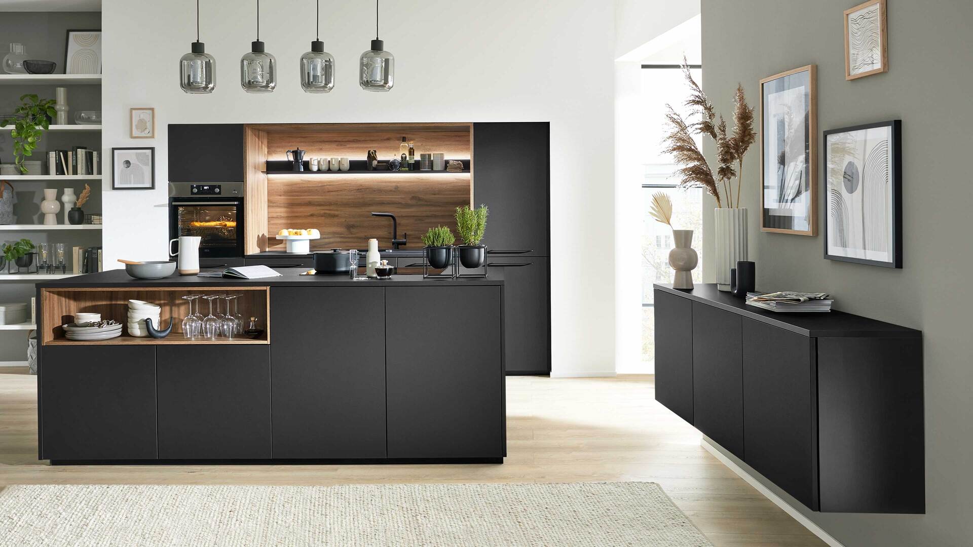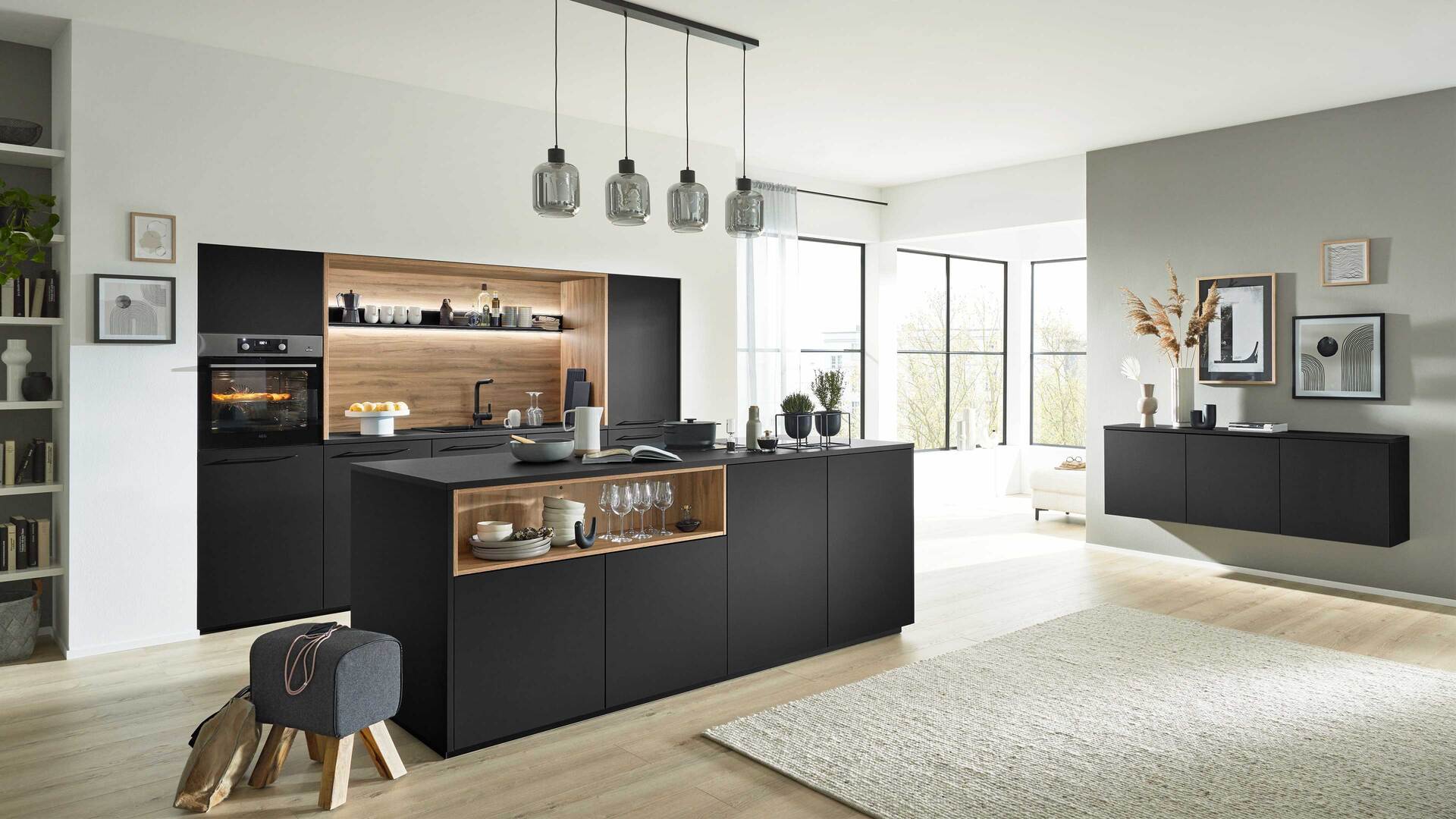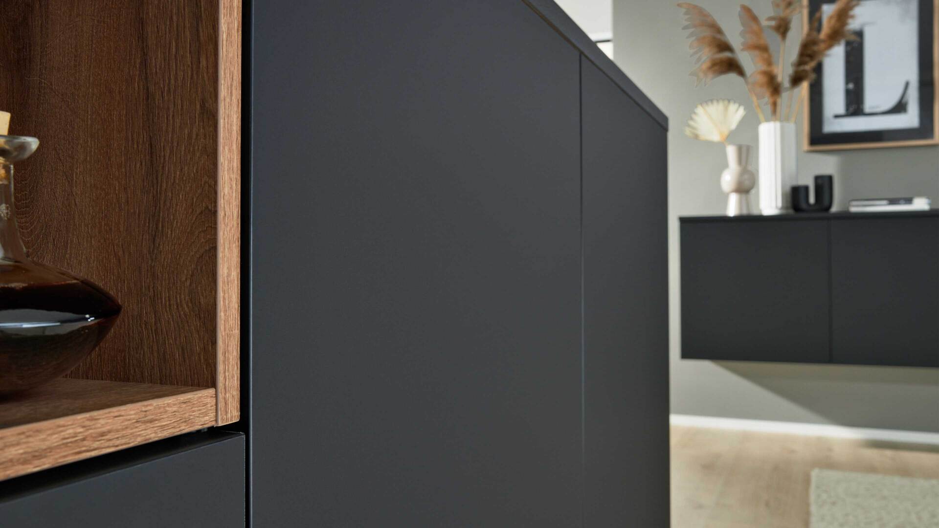 Interliving Küche Serie 3055 – elegante Systemküche in Schwarz und Vulkaneiche mit AEG Einbaugeräten