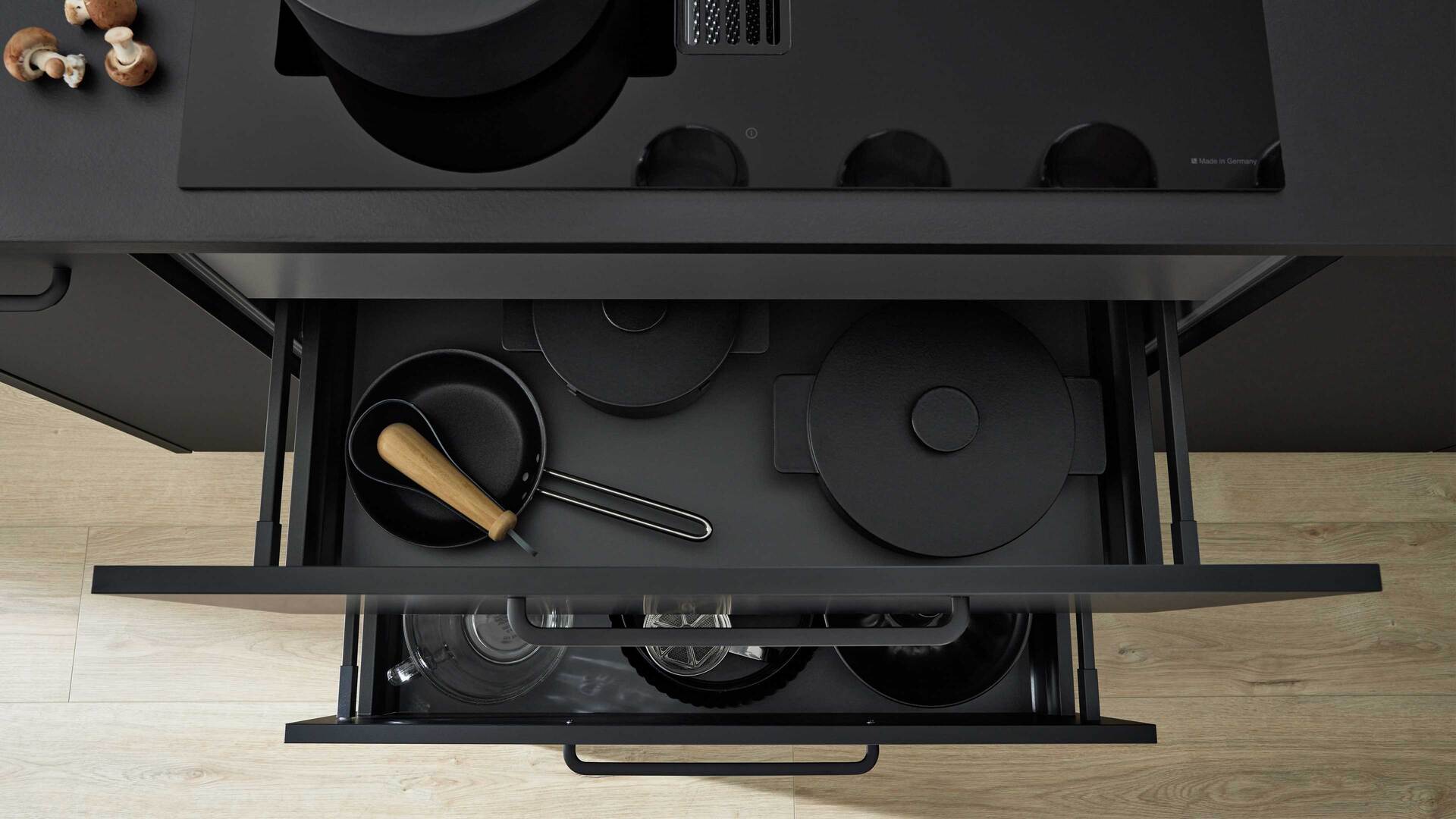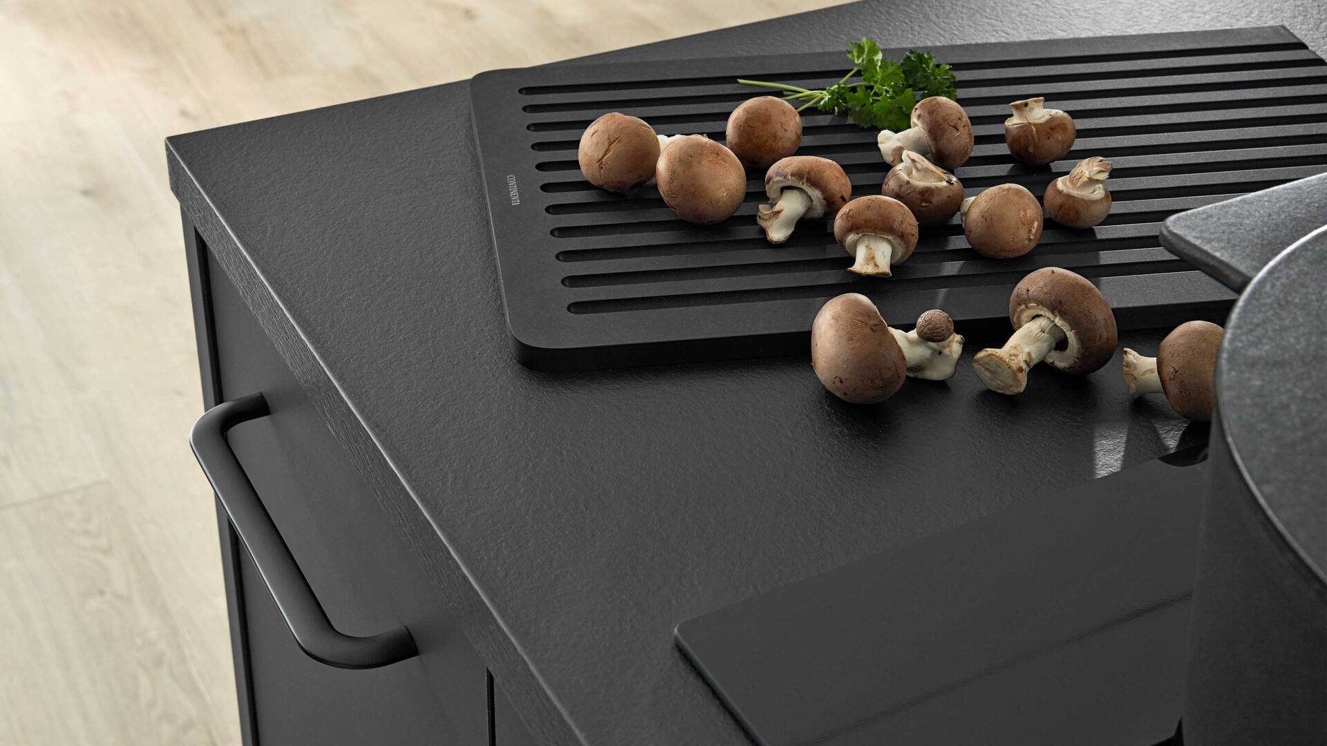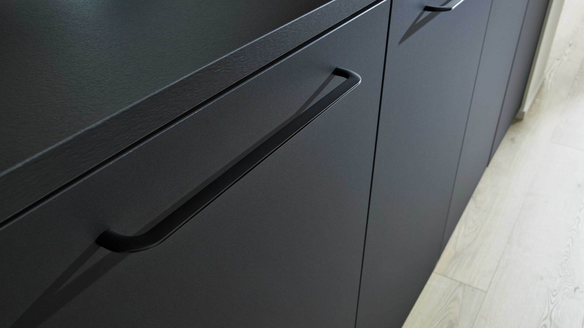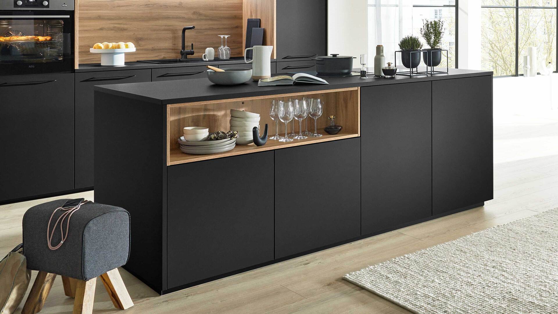 Interliving Küche Serie 3055 – elegante Systemküche in Schwarz und Vulkaneiche mit AEG Einbaugeräten