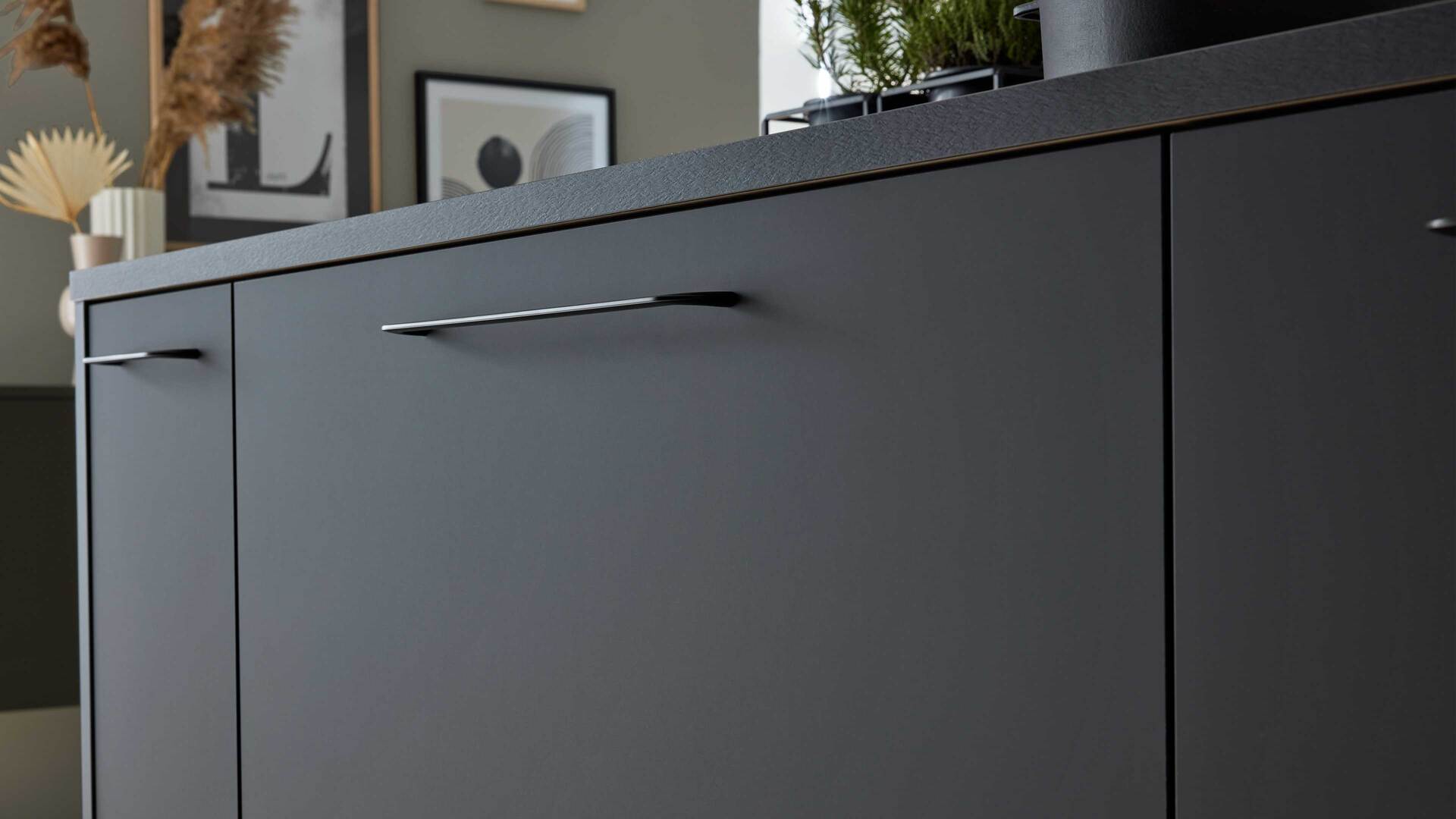 Die Interliving Küche Serie 3055 kombiniert modernes Design mit durchdachter Ausstattung – perfekt, wenn du eine Einbauküche mit klarer Linienführung, cleverem Stauraum und zuverlässiger Technik suchst. Softmatte schwarze Fronten, quarzgraue Korpusse, Akzente in Vulkaneiche-Nachbildung und schwarze Metallgriffe ergeben ein markantes Gesamtbild. Ergänzt wird der Look durch schwarze Arbeitsplatten und eine Nischenverkleidung in Vulkaneiche-Nachbildung, die den edlen Charakter der Küche unterstreichen.