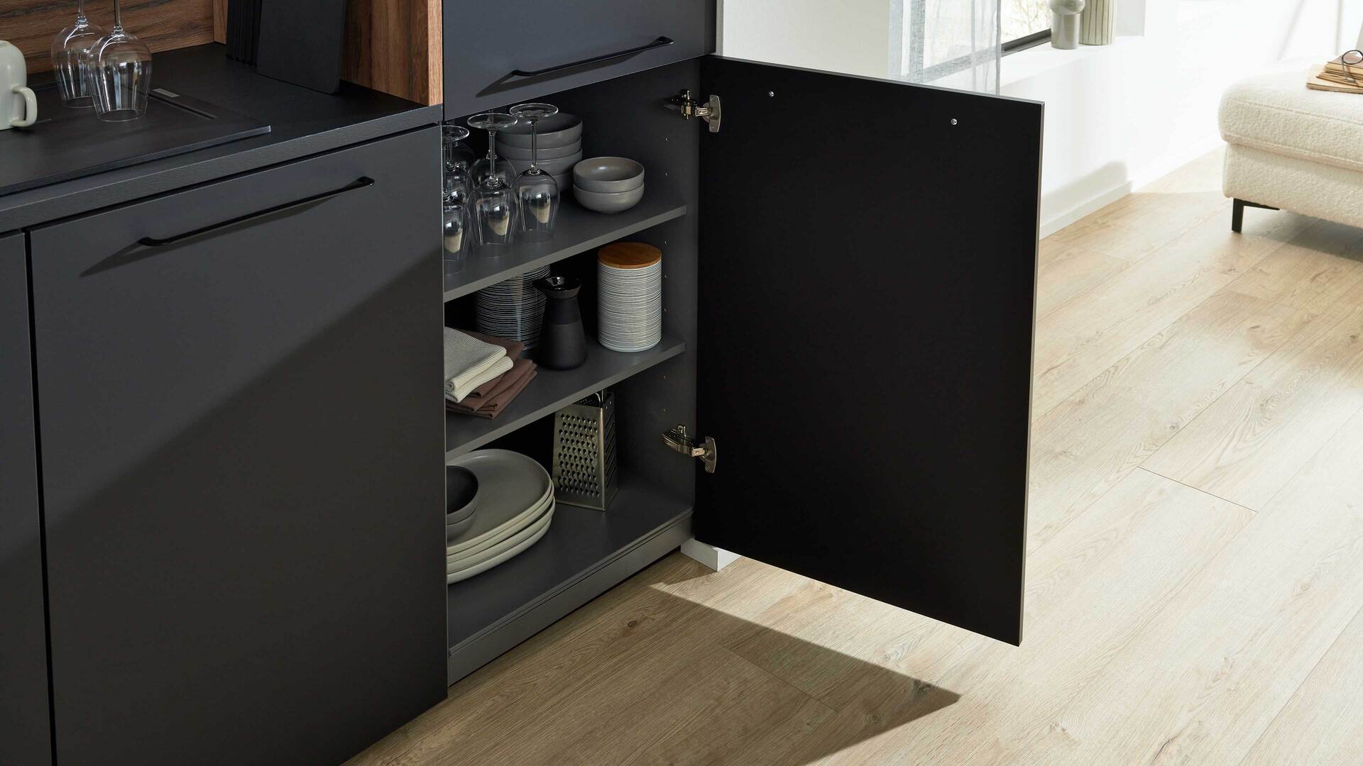 Die Planküche besteht aus drei perfekt abgestimmten Bereichen. Die ca. 300 cm lange Küchenzeile bringt Hochschränke für Kühlschrank und Backofen, eine vulkaneichefarbene Nischenverkleidung, einen beleuchteten Regalboden sowie eine mattschwarze Einbauspüle mit Armatur mit. Die Kücheninsel mit ca. 243 cm Länge überzeugt mit integriertem Muldenlüfter, viel Stauraum und einer offenen Nische in Holzoptik – ideal als Mittelpunkt für gemeinsames Kochen und Genießen. Ergänzt wird das Ensemble durch ein Sideboard mit ca. 180 cm Länge, das mit drei Hängeschränken zusätzlichen Stauraum bietet und sich nahtlos ins Design einfügt.