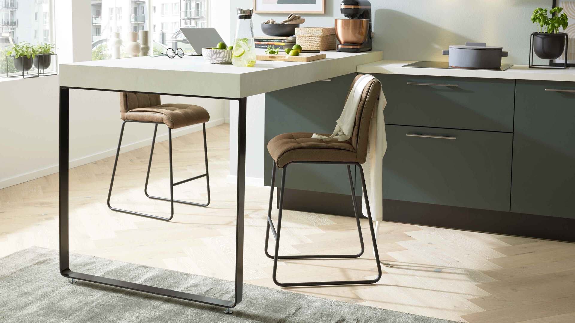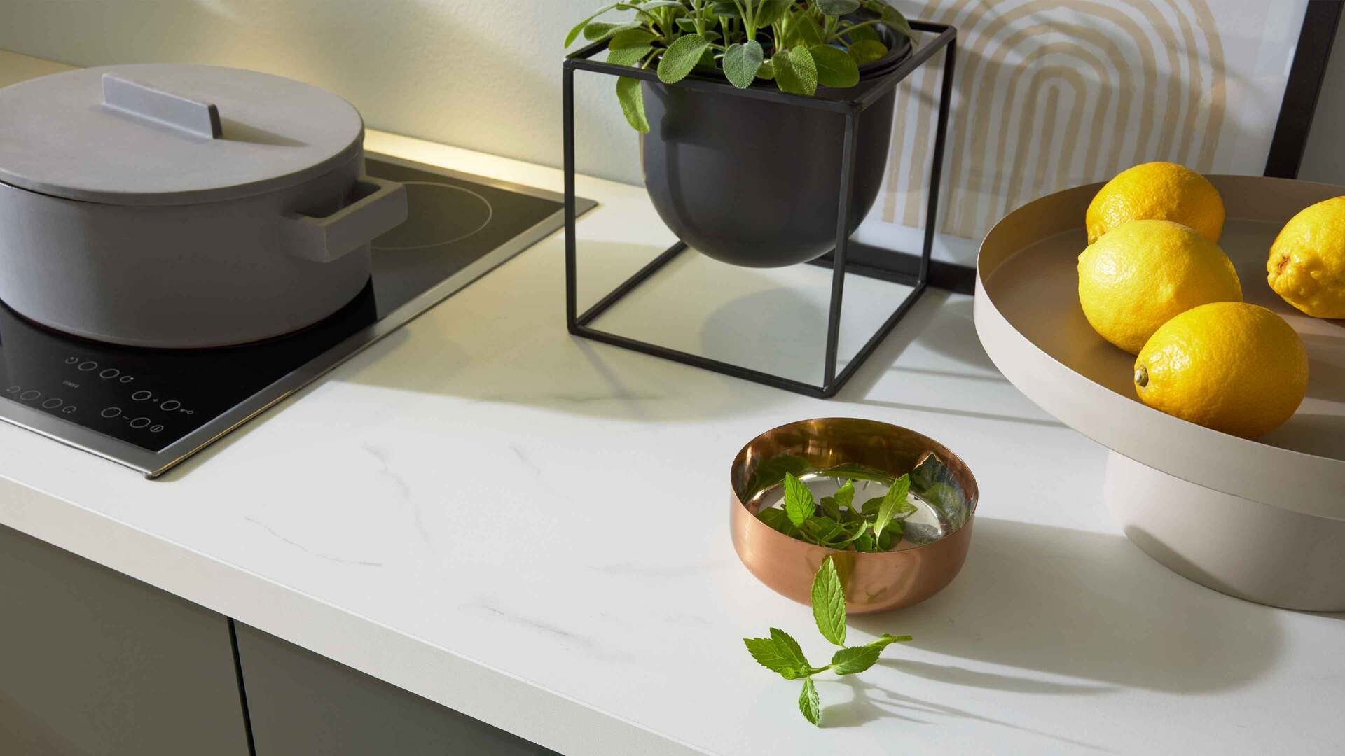 Für das gewisse Etwas sorgen die Platten in weißer Marmor-Nachbildung. Schwarze Sockelblenden runden das modern-elegante Design stimmig ab.