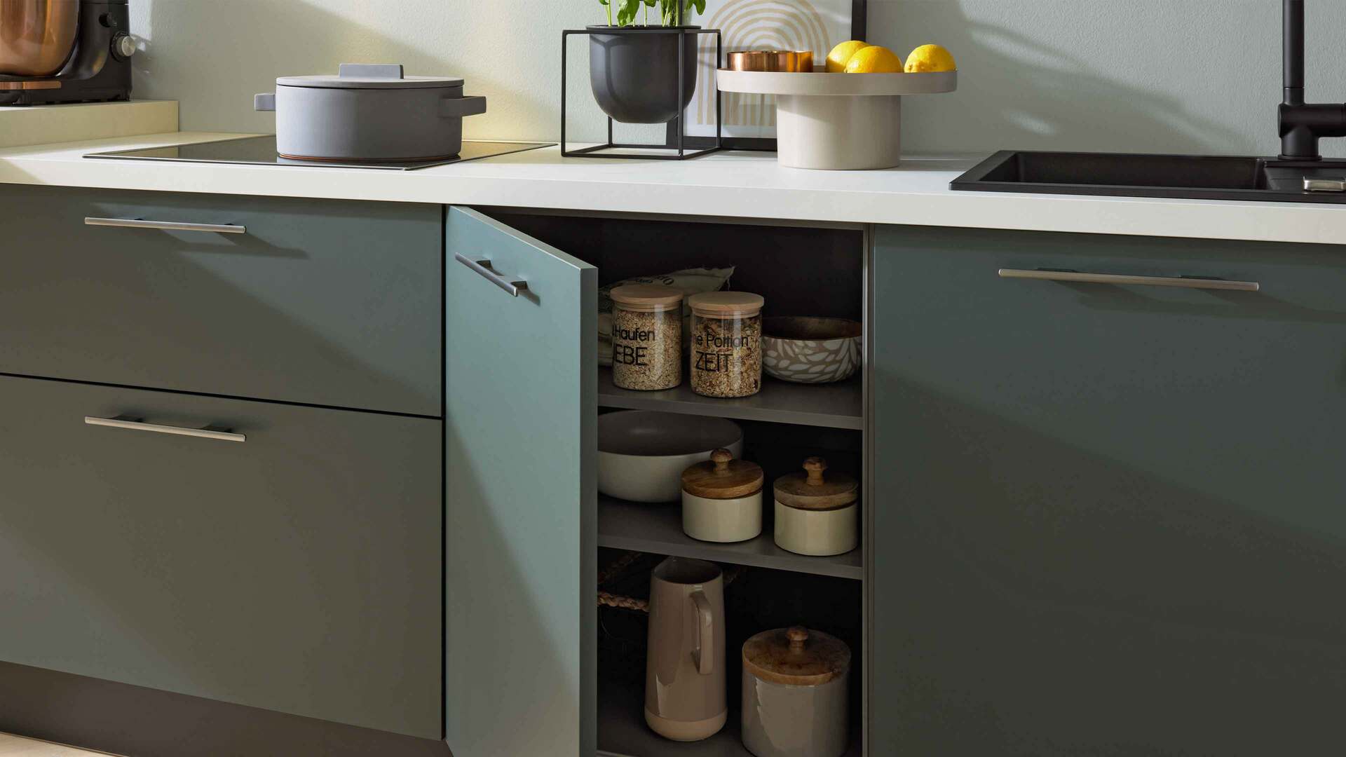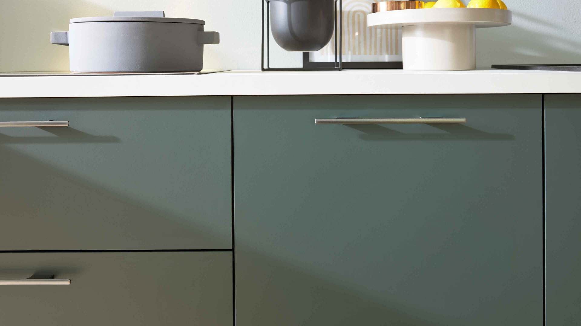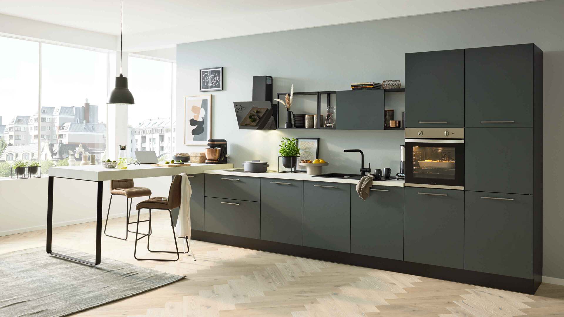 Die hochwertige Interliving Küche Serie 3059 kombiniert matte schwarzgrüne Fronten mit einem quarzgrauen Korpus und titanfarbenen Metallgriffen.