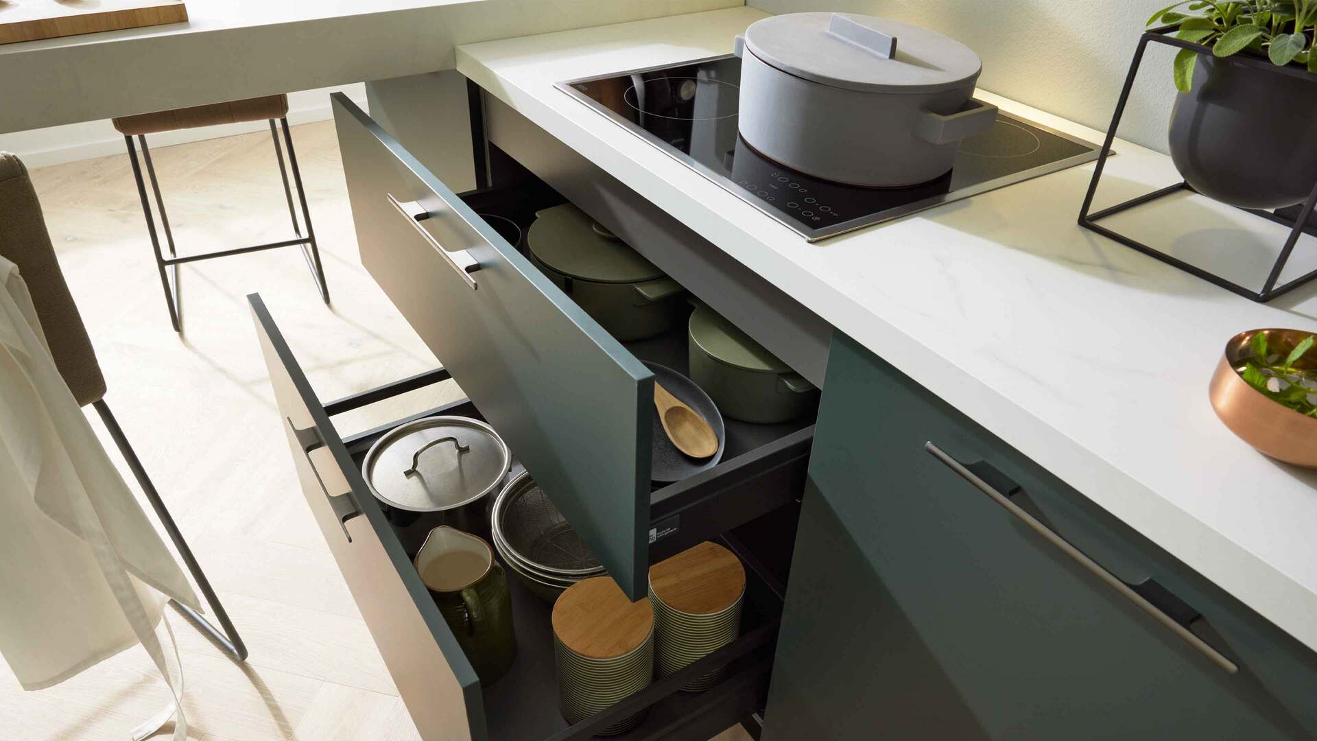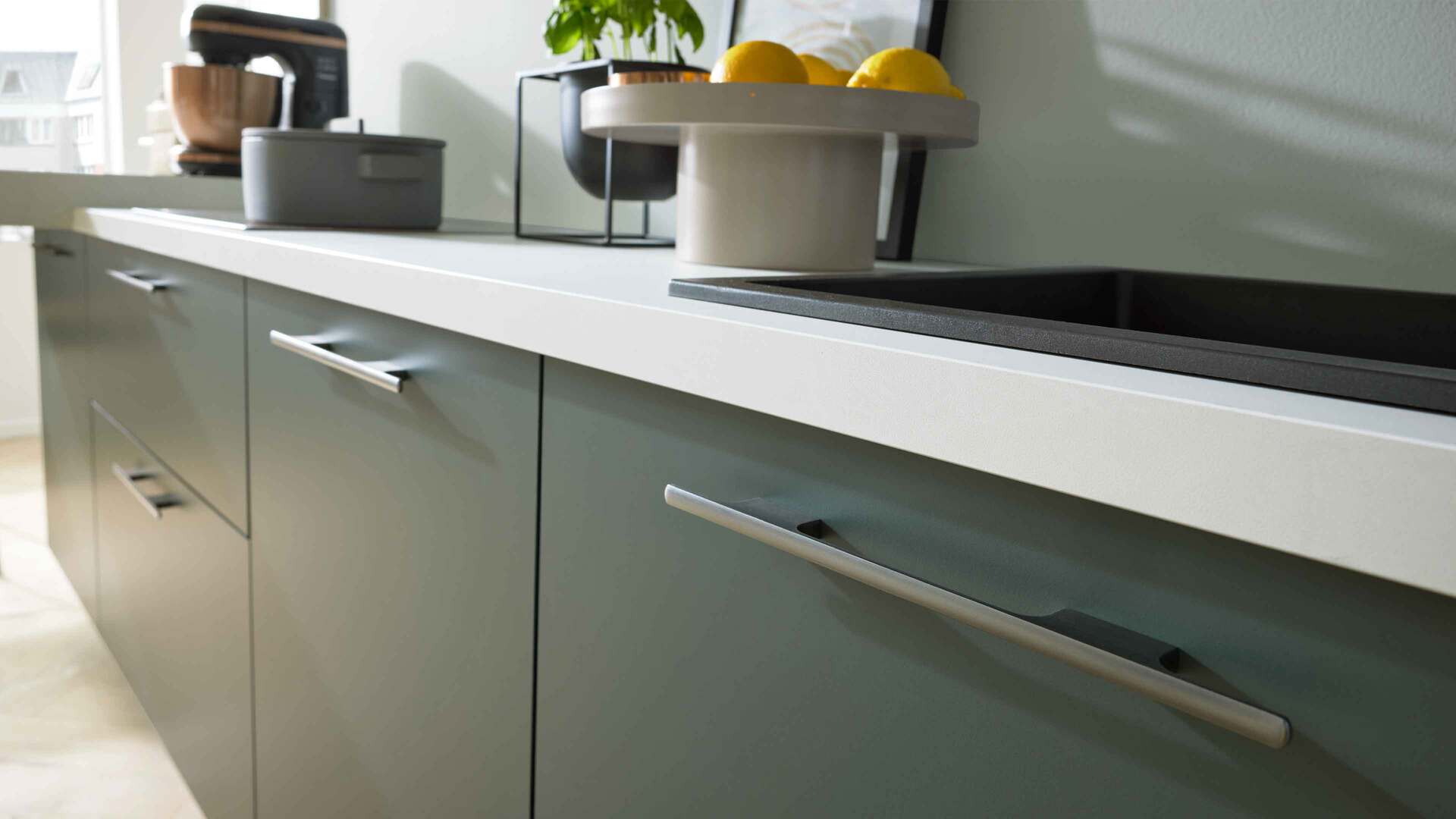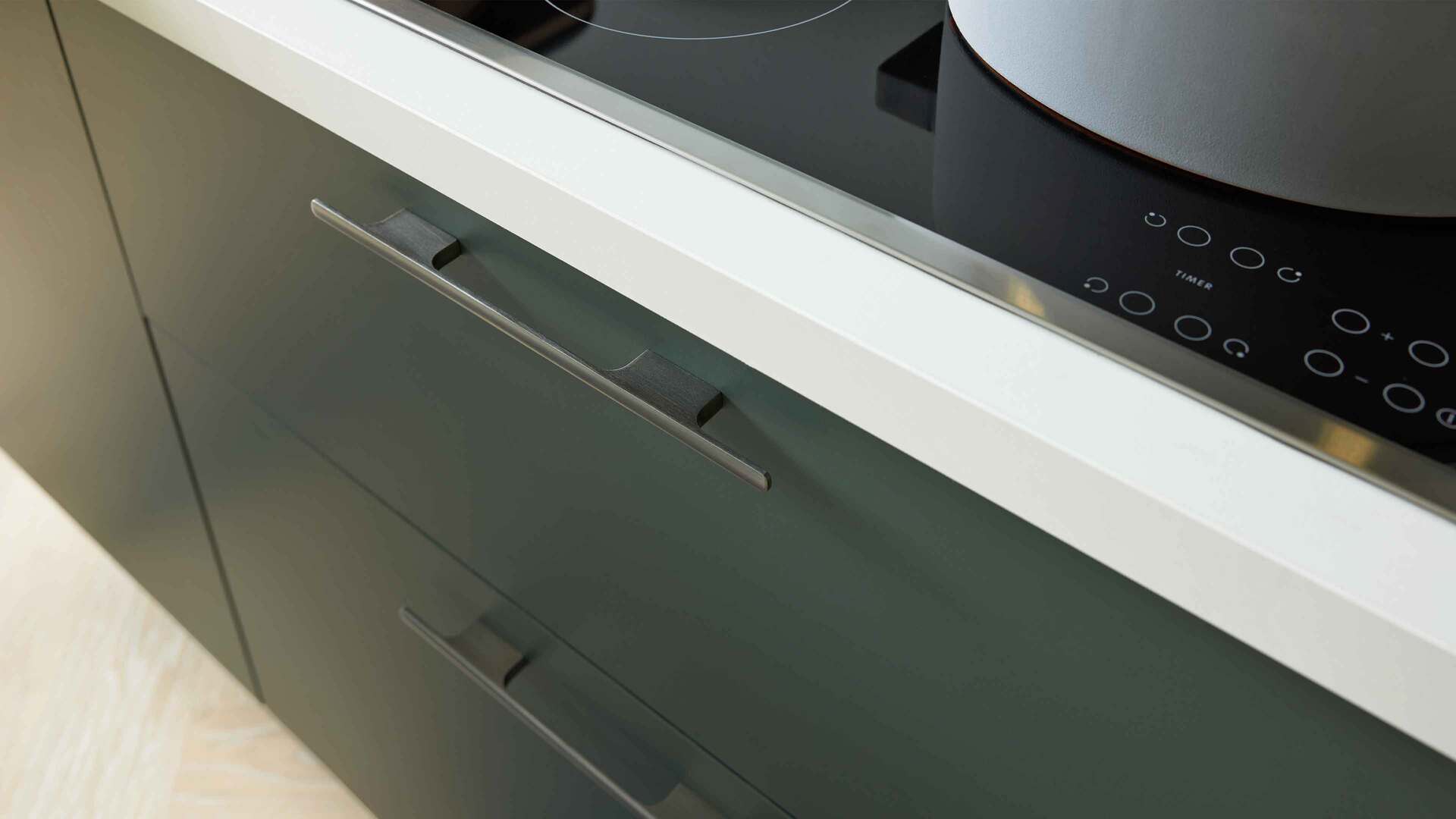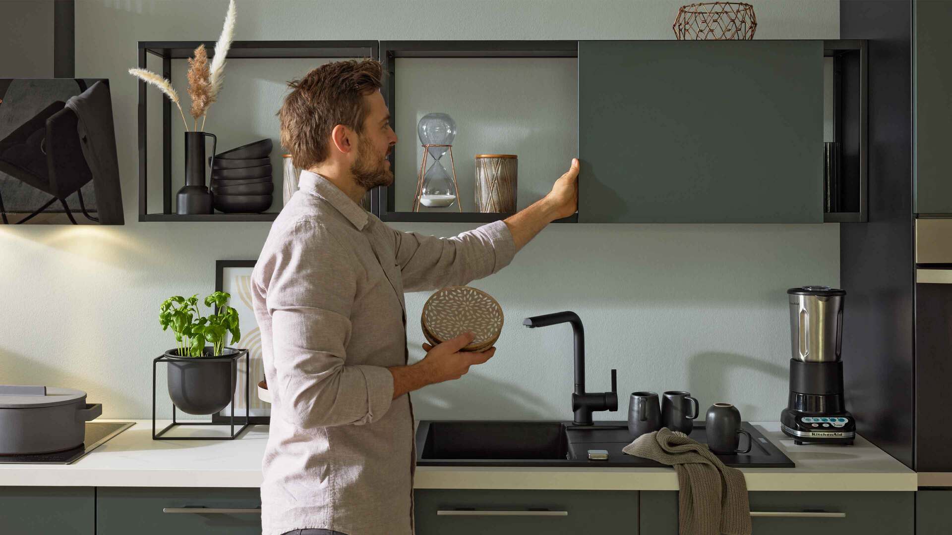 Die hochwertige Interliving Küche Serie 3059 kombiniert matte schwarzgrüne Fronten mit einem quarzgrauen Korpus und titanfarbenen Metallgriffen.