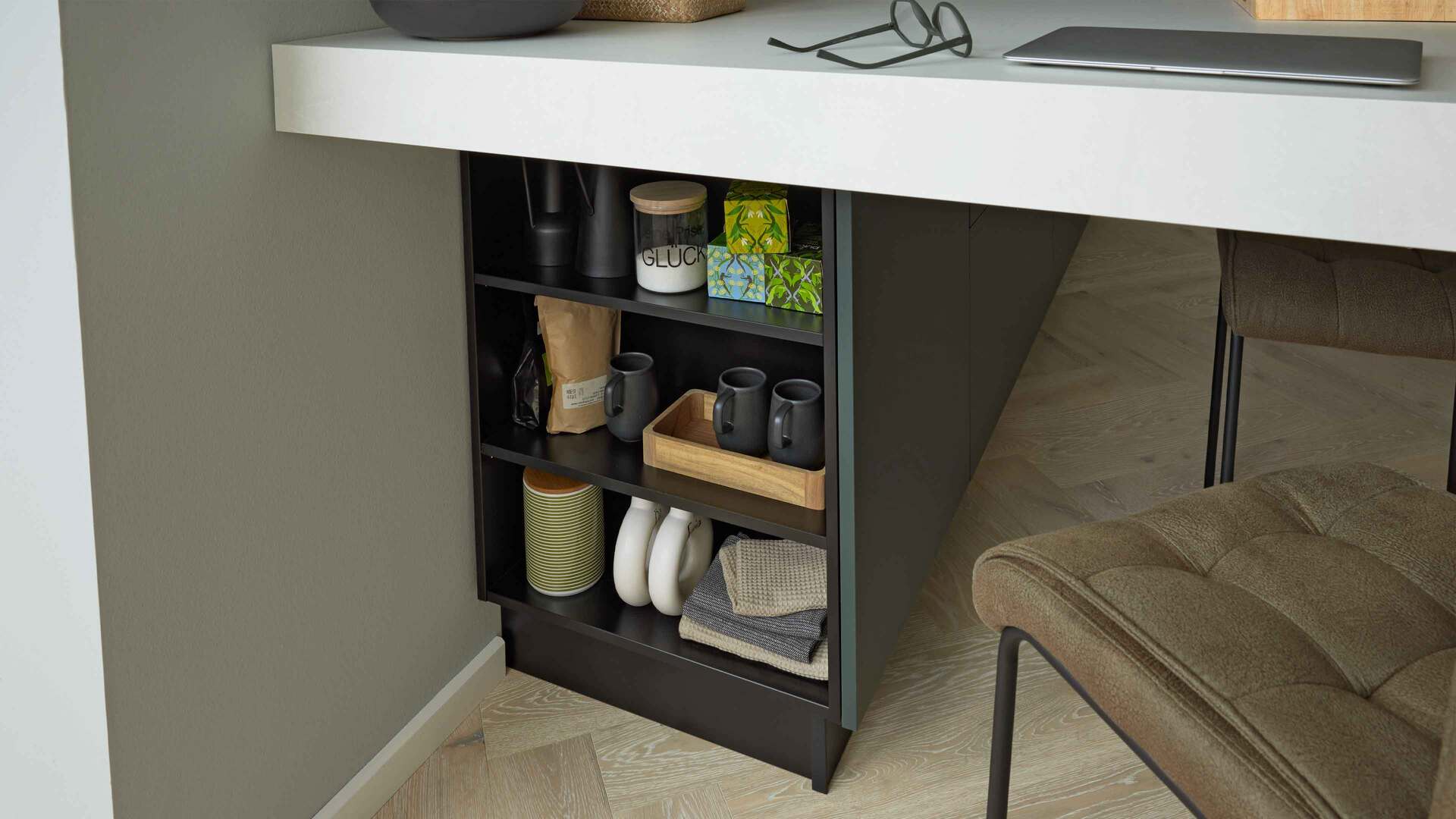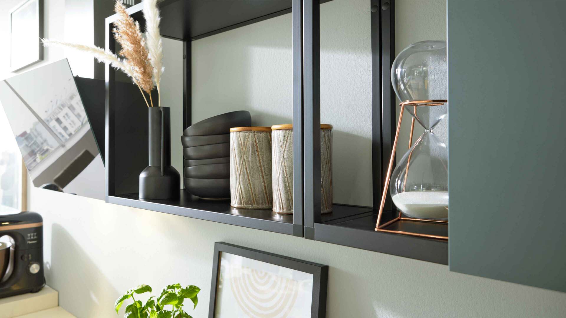 Die Hängeschränke mit Drehtüren, das Metallregal mit Schiebetür sowie die Unterschränke mit Auszügen und Drehtüren schaffen jede Menge praktischen Stauraum für Küchenutensilien und Lebensmittel.