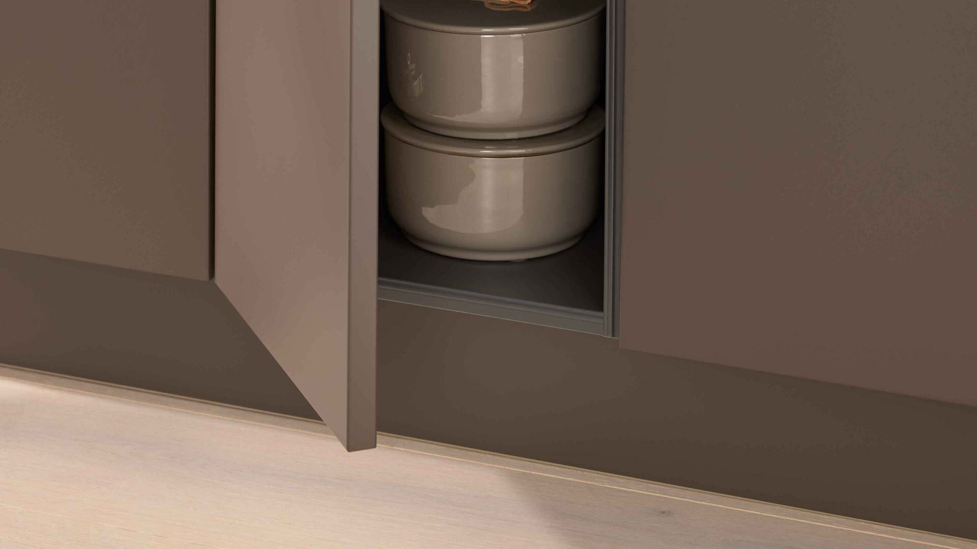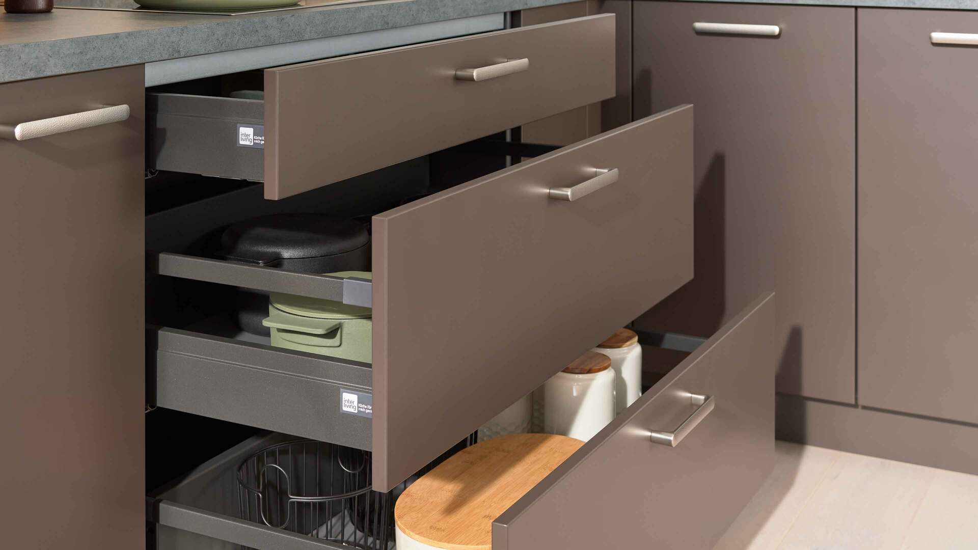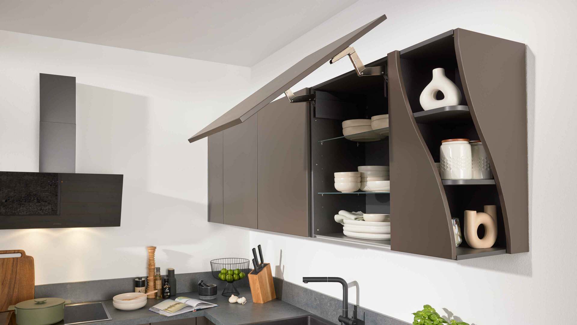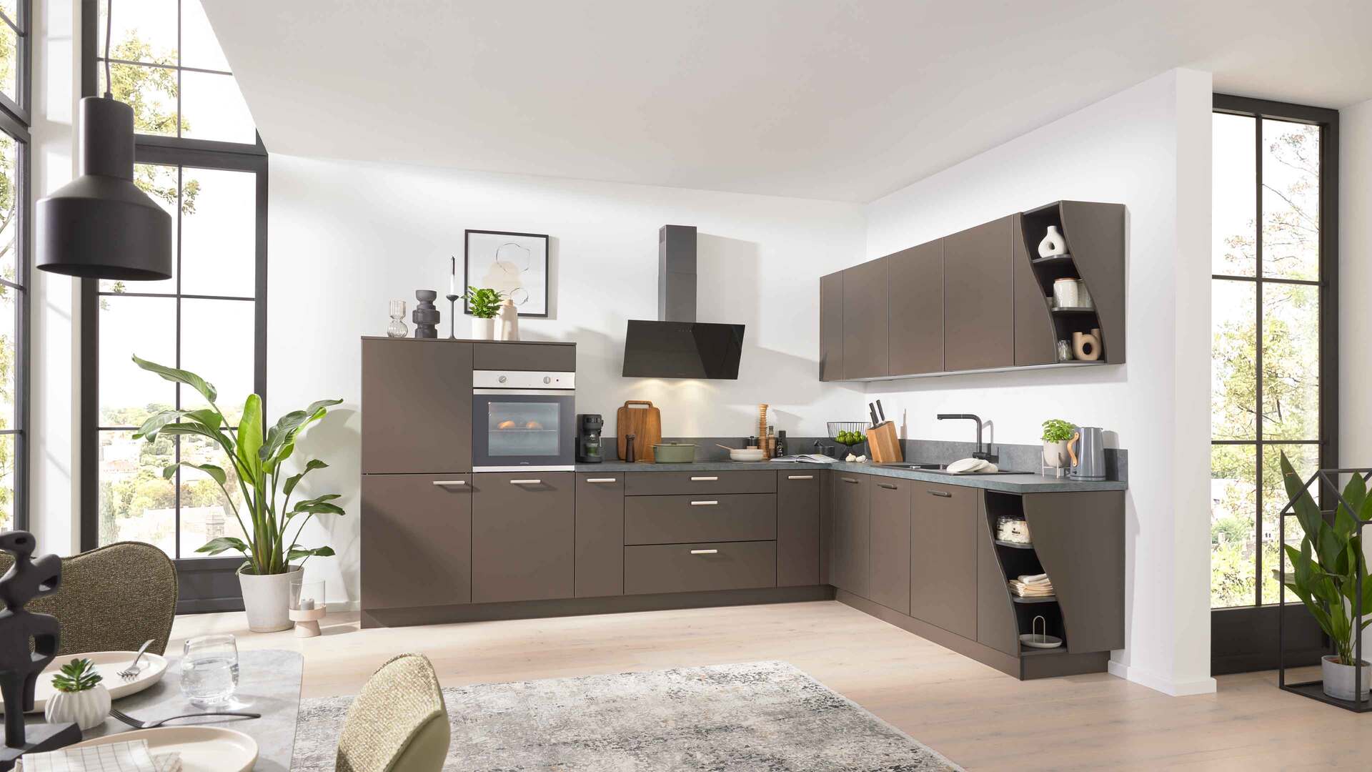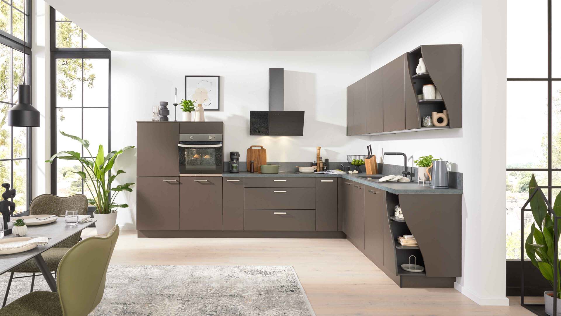 Mit den matten sepiabraunen Lackfronten und den graphitgrauen Korpussen zeigt sich die moderne Interliving Küche Serie 3064 in einer speziellen Farbkombination.