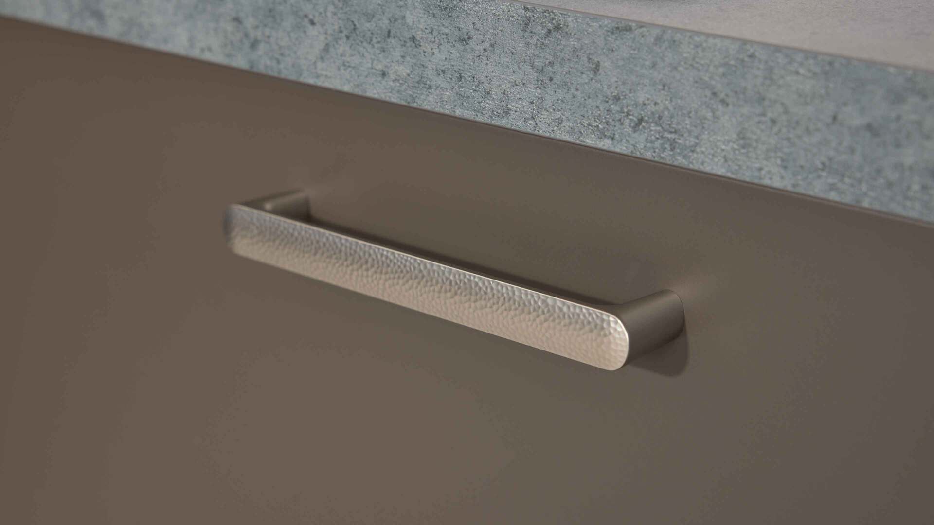 Gelungene Akzente setzen die Arbeitsplatten und Nischenverkleidung in lavagrauer Sandstein-Nachbildung. Edle Metallgriffe runden das Design stilsicher ab.