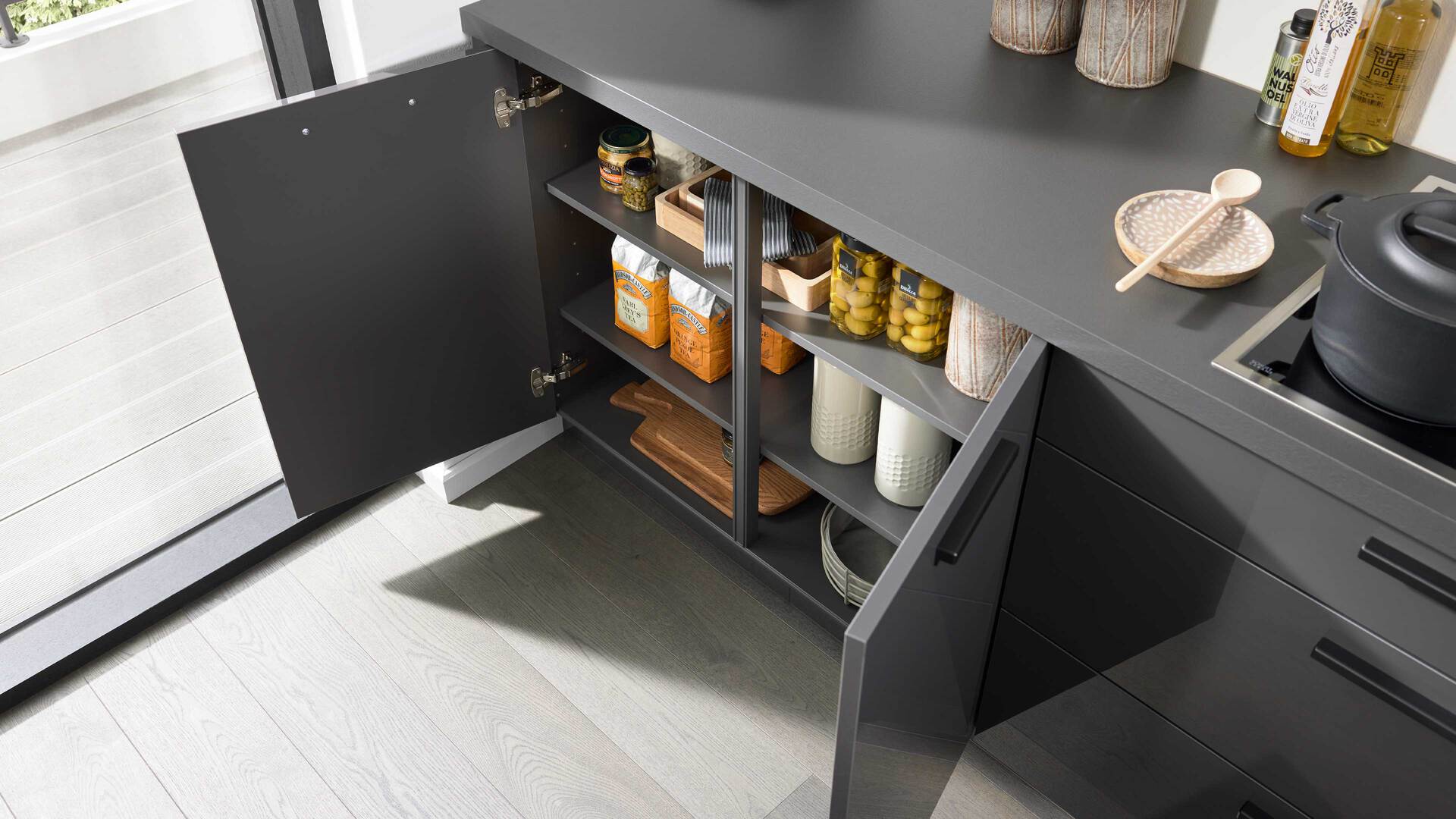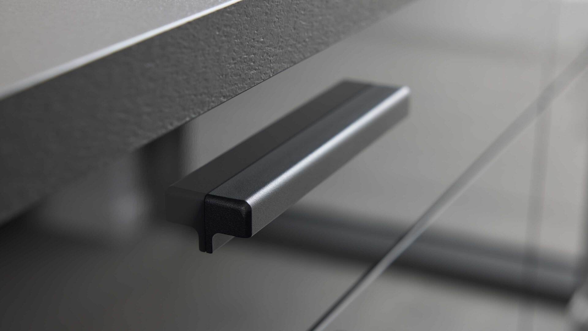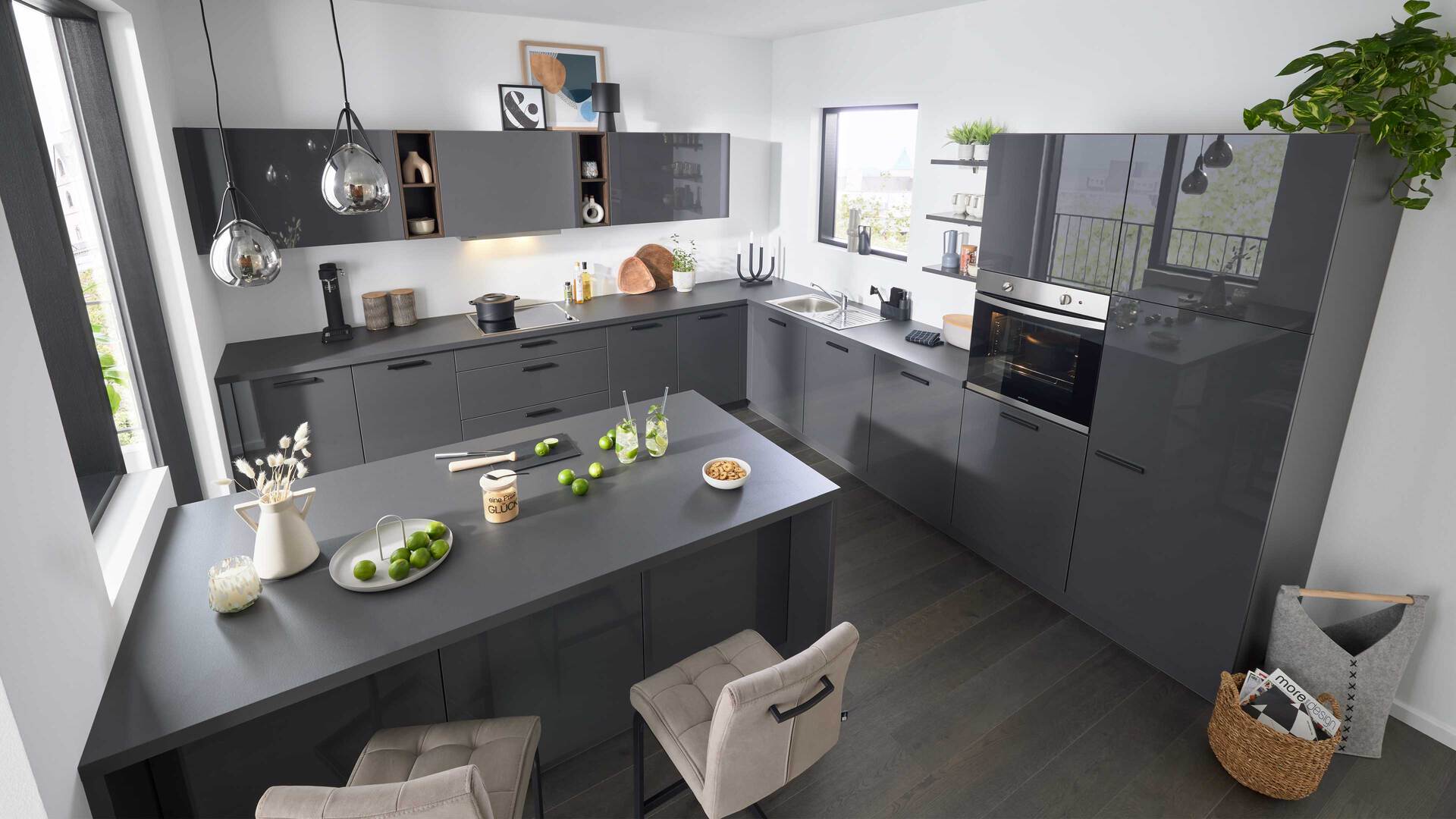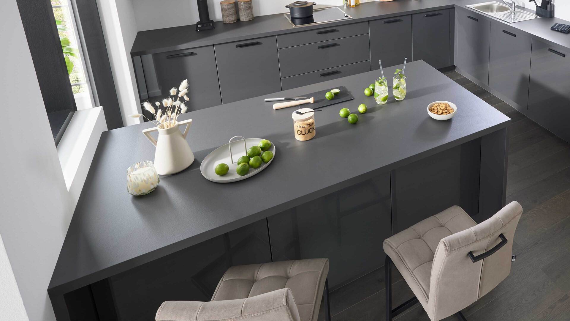 Auch die Korpusse, Arbeitsplatten und Sockelblenden sind graphitfarben gehalten. Schwarze Griffe runden das stilvolle Design harmonisch ab.