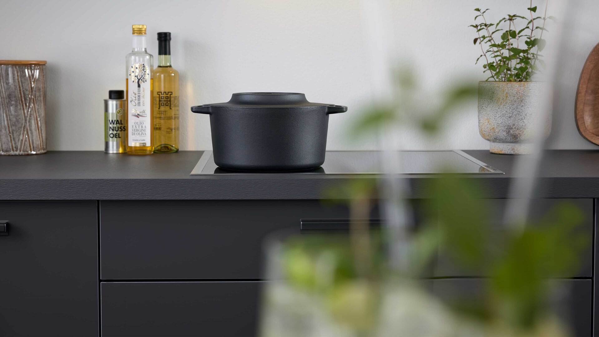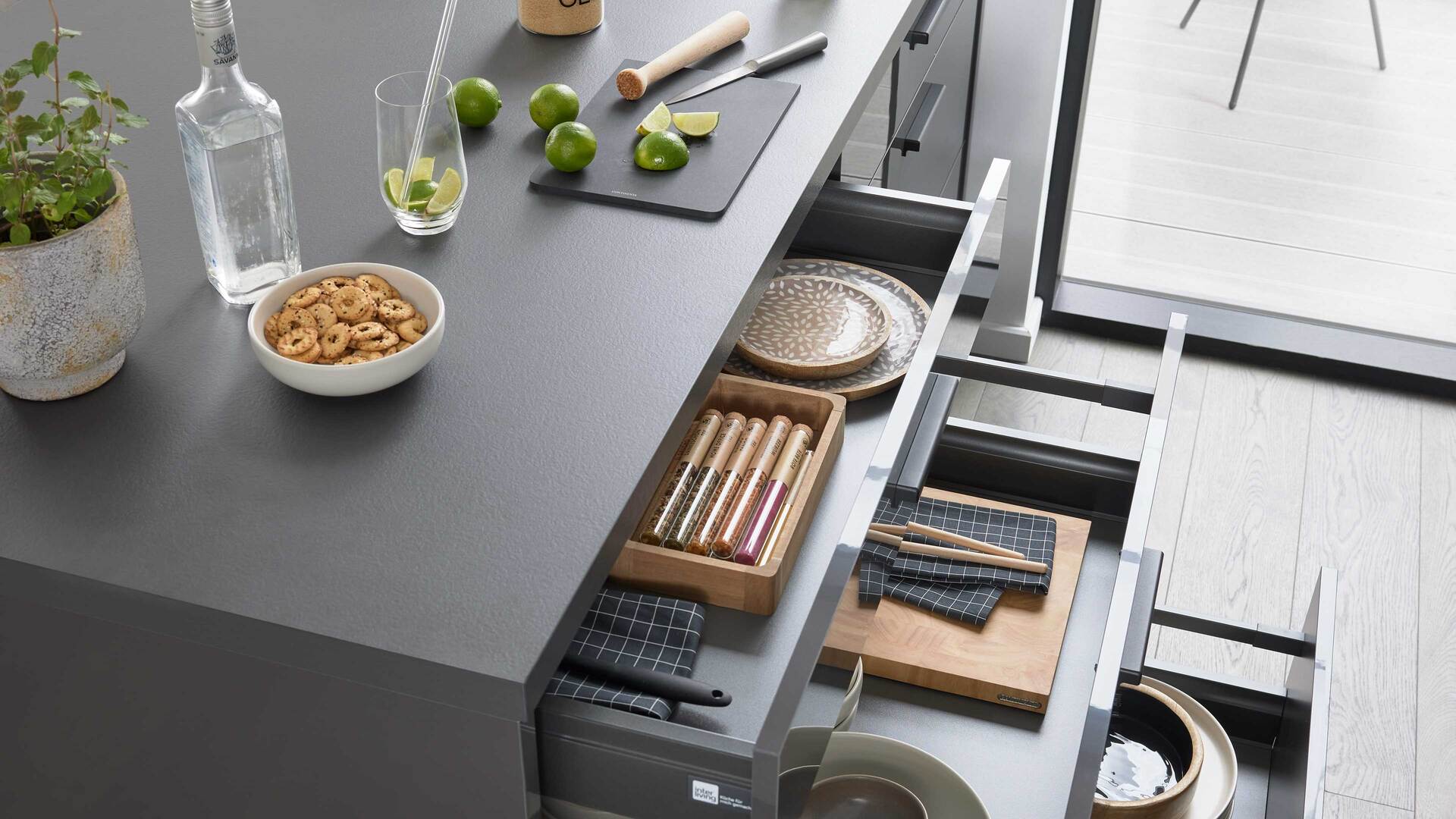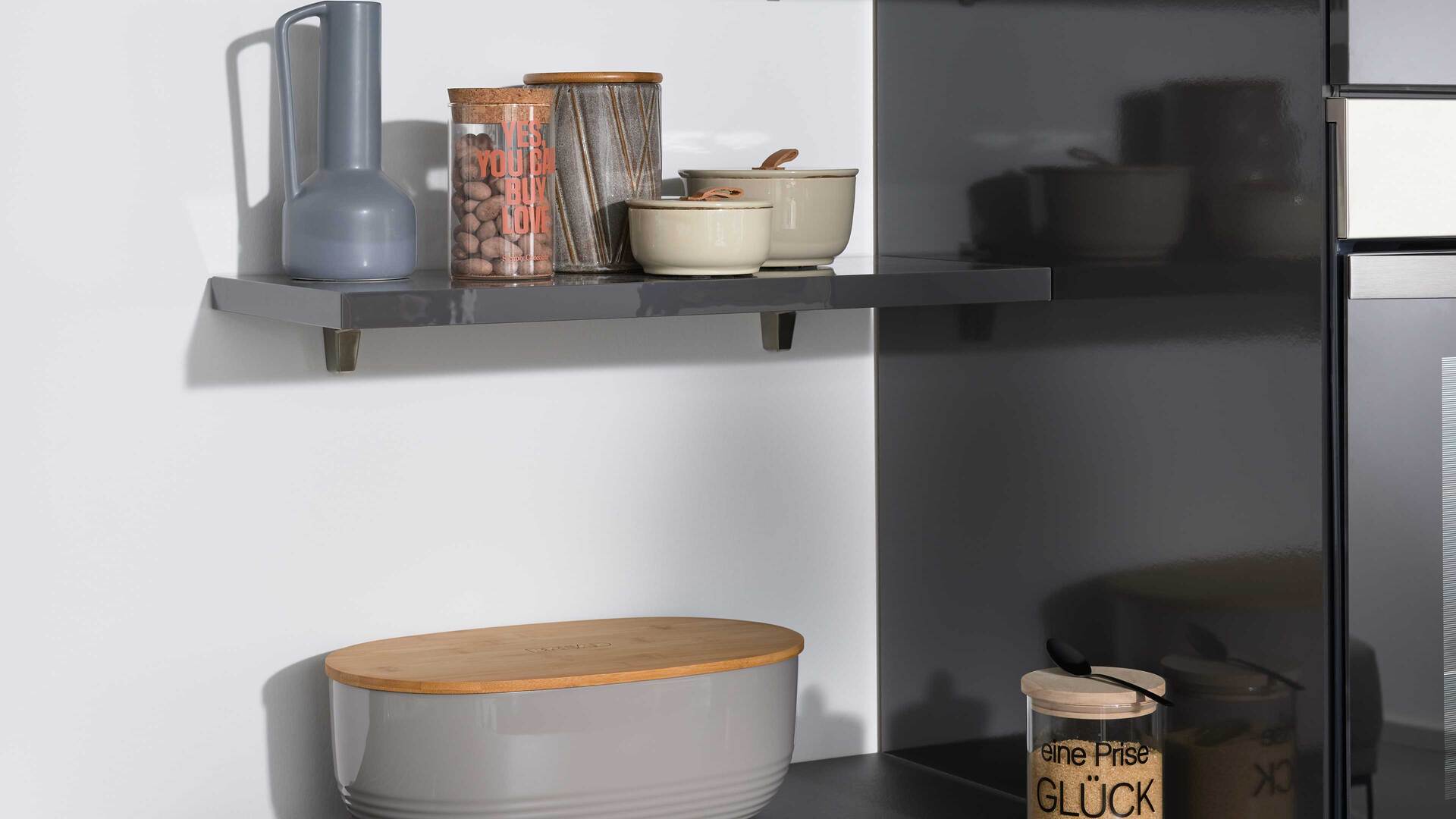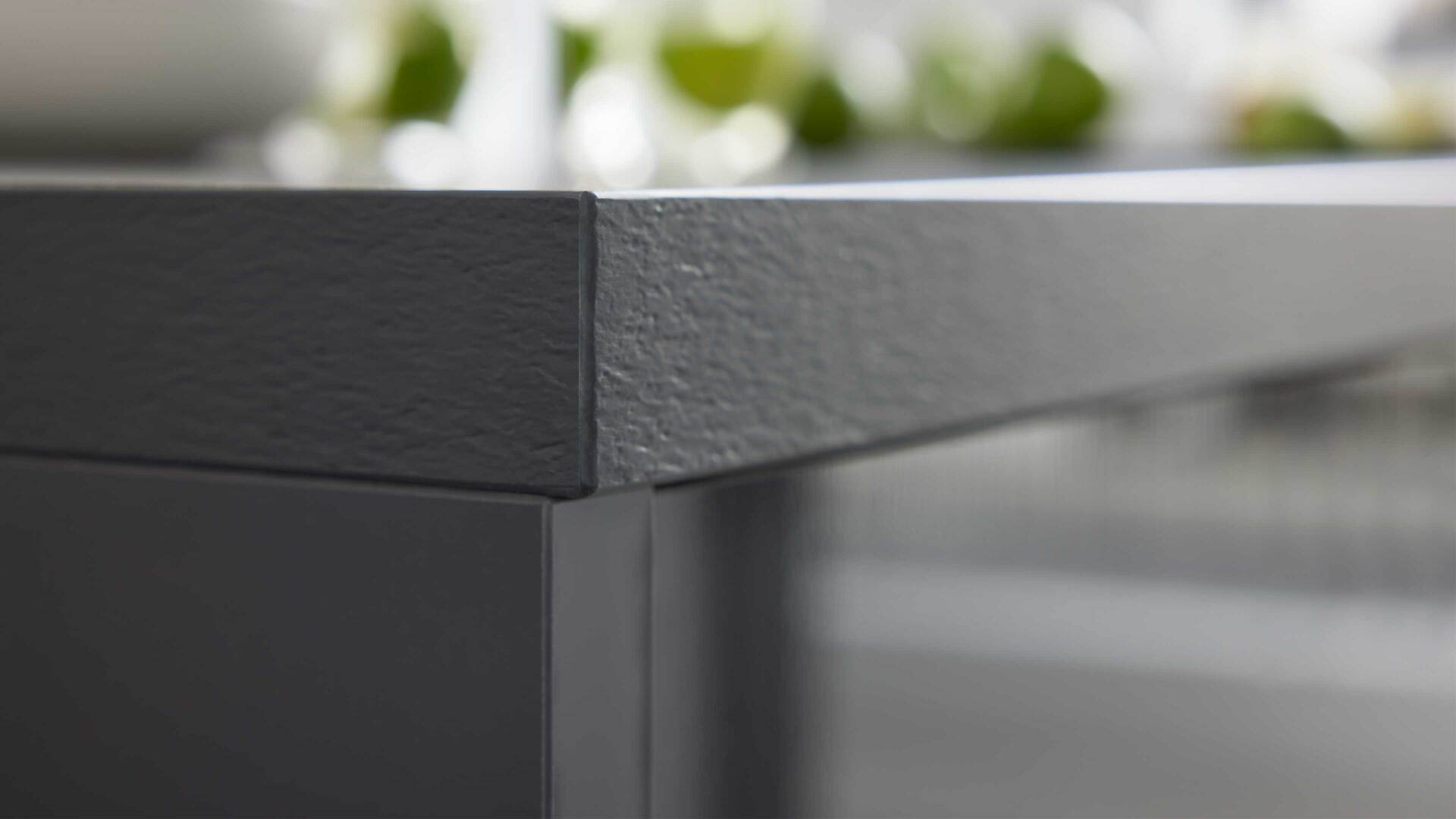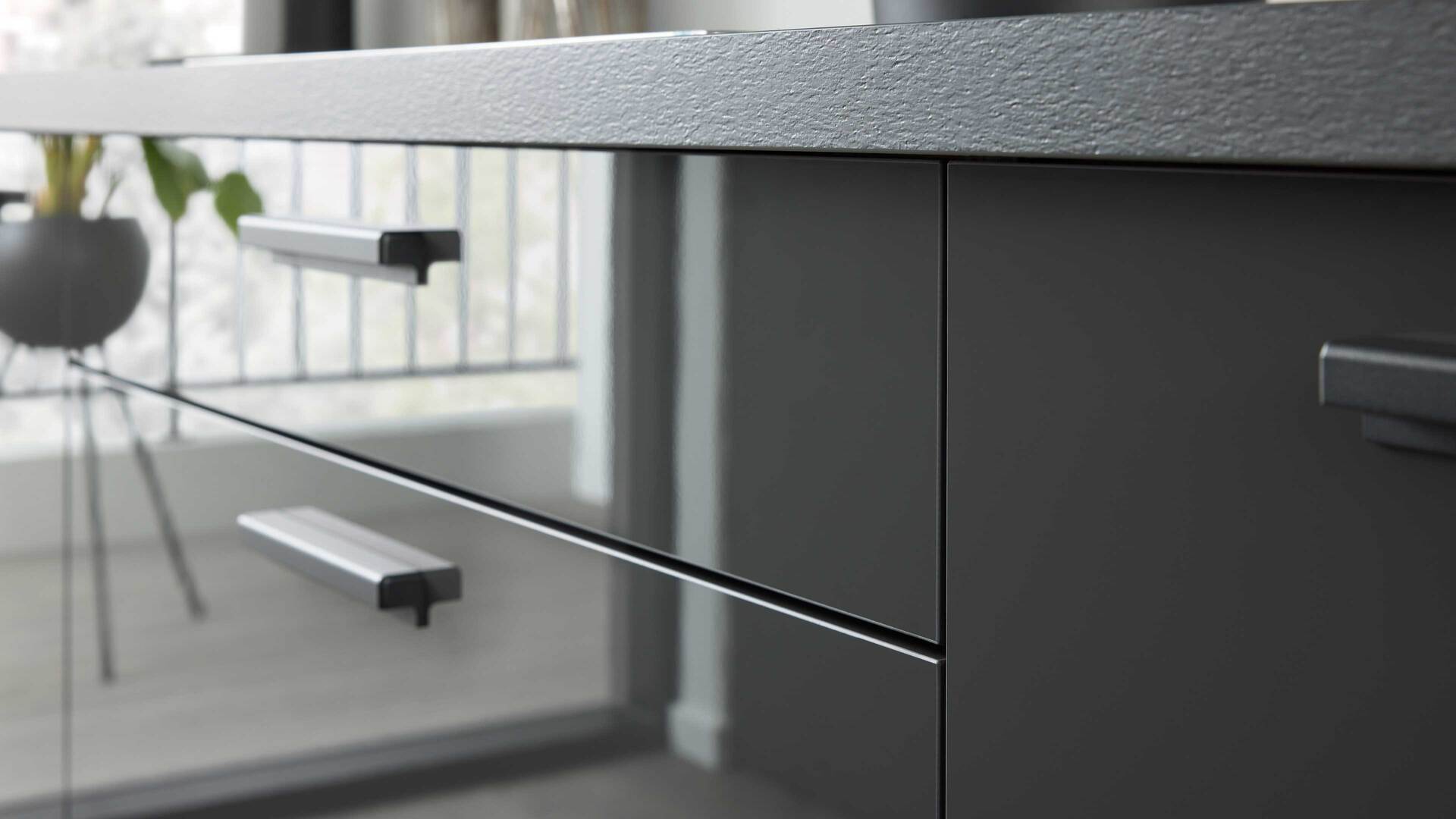 Auch die Korpusse, Arbeitsplatten und Sockelblenden sind graphitfarben gehalten. Schwarze Griffe runden das stilvolle Design harmonisch ab.