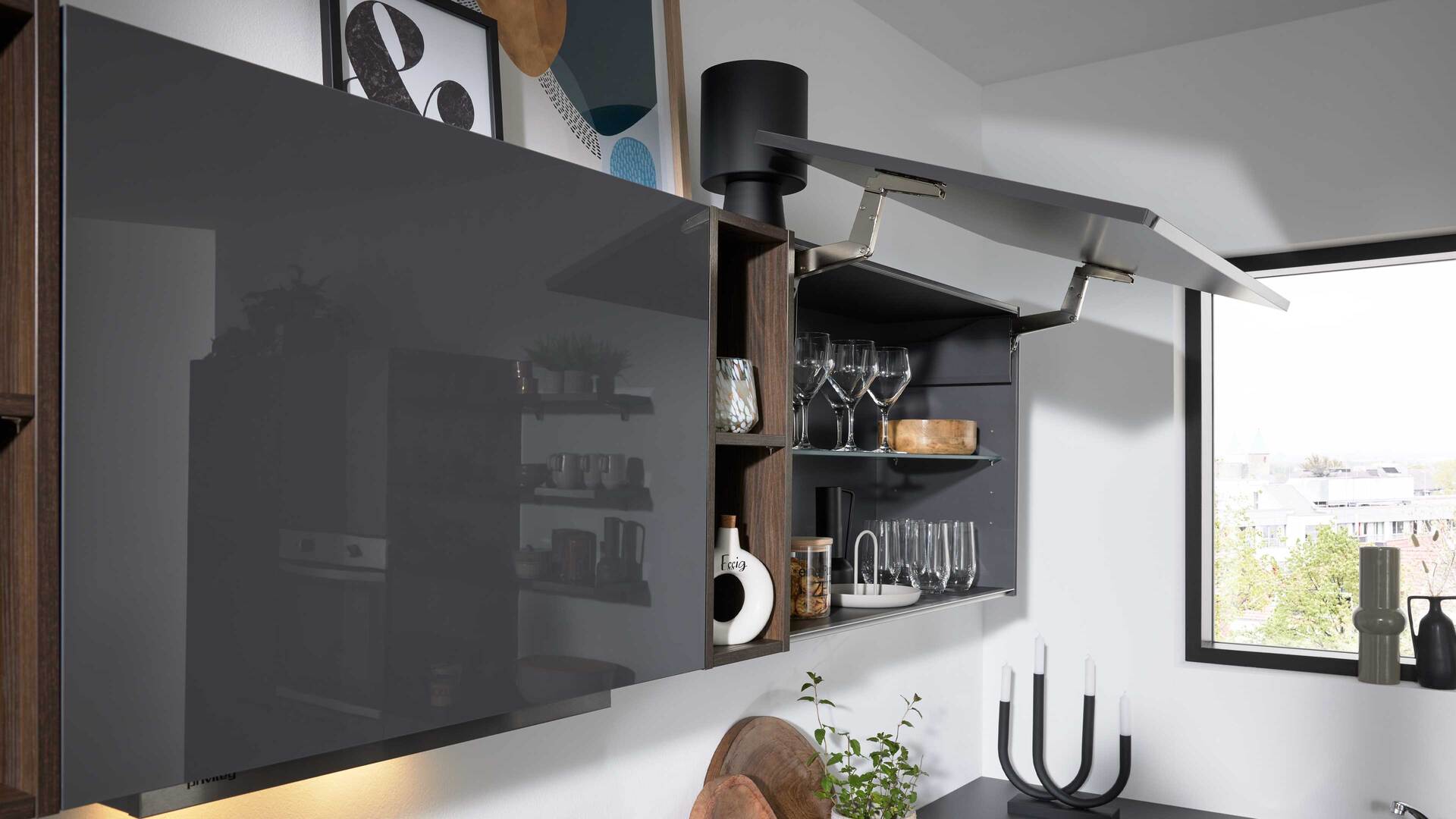 Ein Highlight bilden die Hängeschränke mit praktischen Lifttüren und Regal-Elementen.