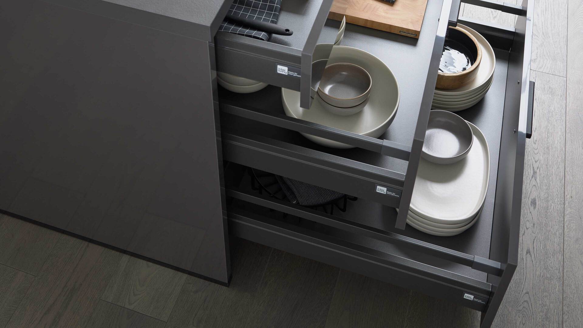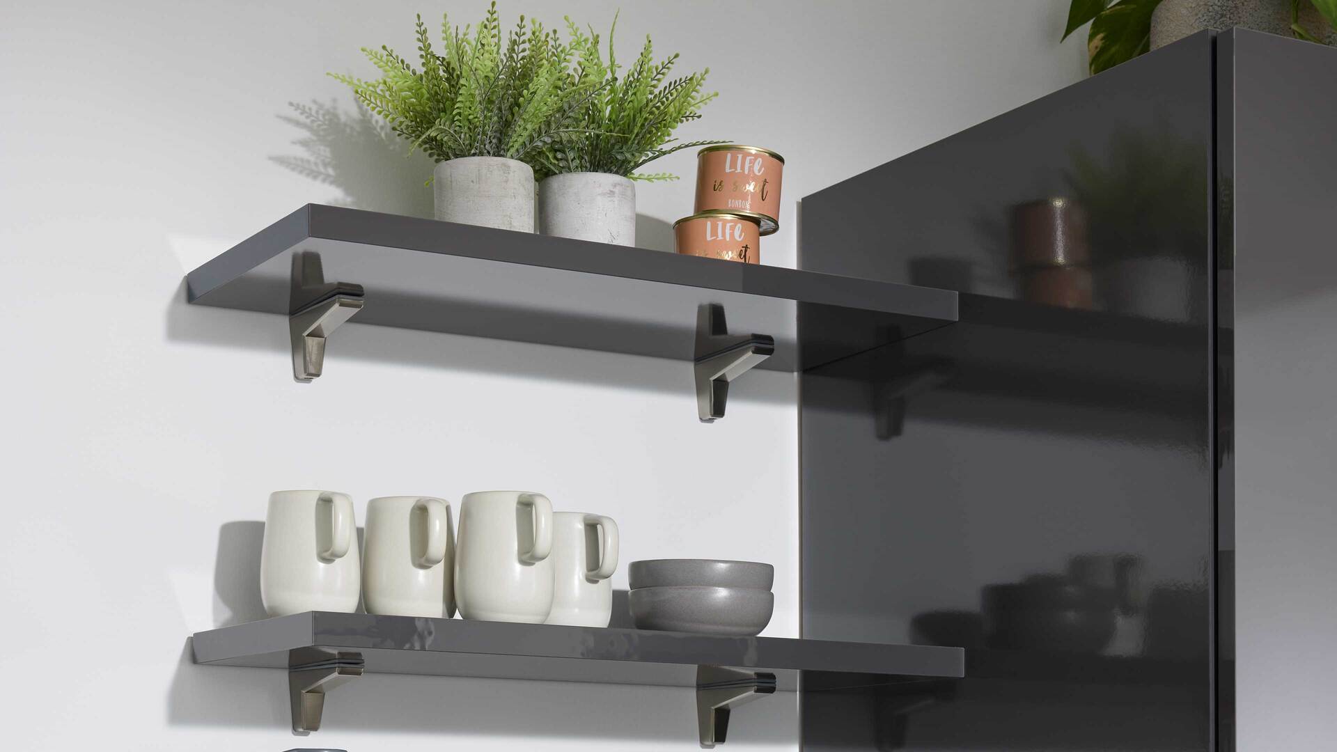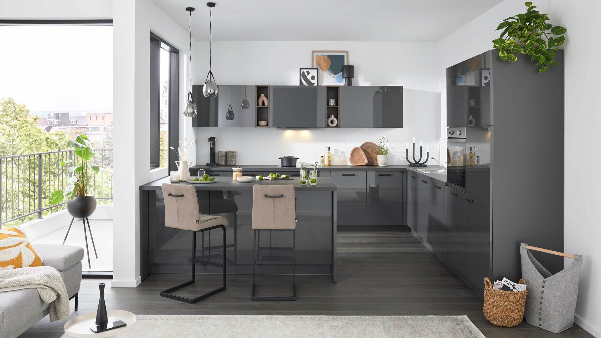 Die moderne Interliving Küche Serie 3068 zeichnet sich durch ihre graphitfarbenen Lacklaminat-Hochglanzfronten aus.