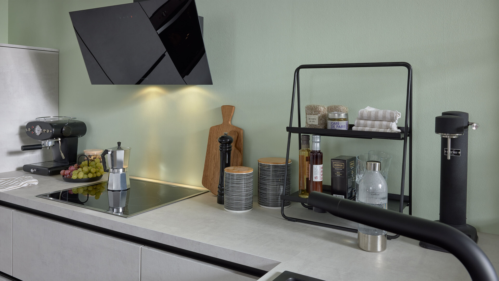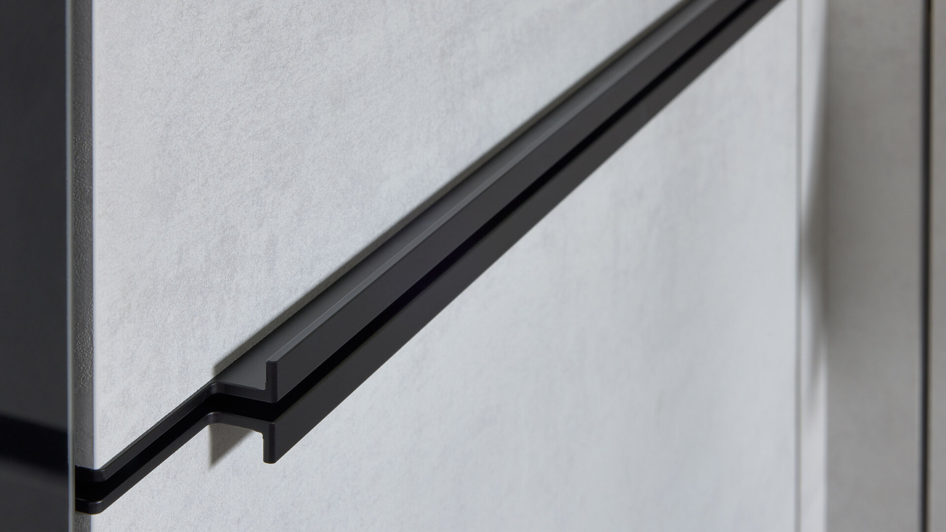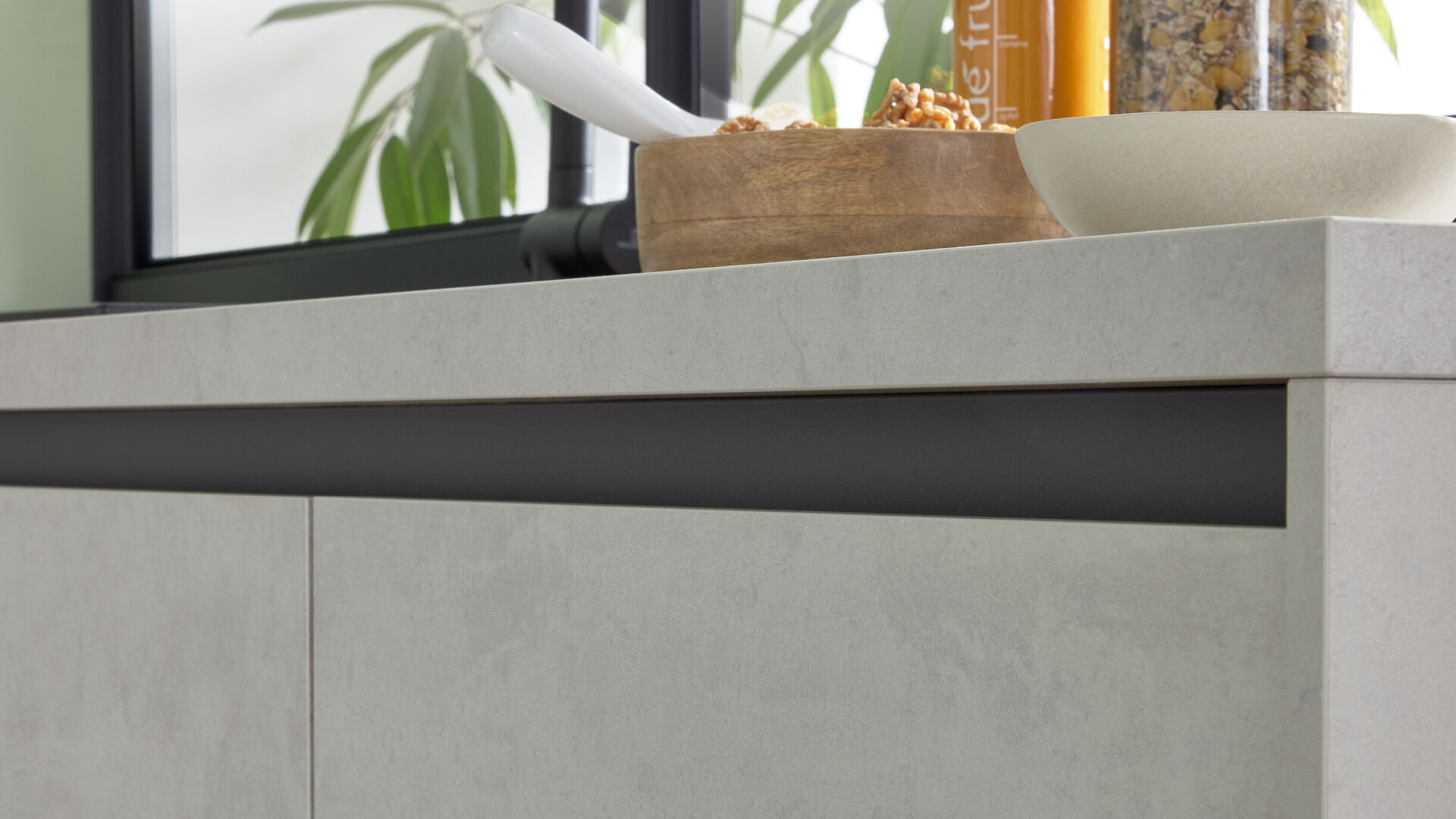 Die Interliving Küche Serie 3080 bietet modernes Küchendesign mit klaren Linien und funktionalen Details. Die Fronten in weißer Beton Nachbildung werden durch mattes Platingrau und mattschwarze Griffleisten stilvoll ergänzt. Das Ergebnis ist ein edler Materialmix mit urbanem Charakter – perfekt für eine moderne Küchenarchitektur.