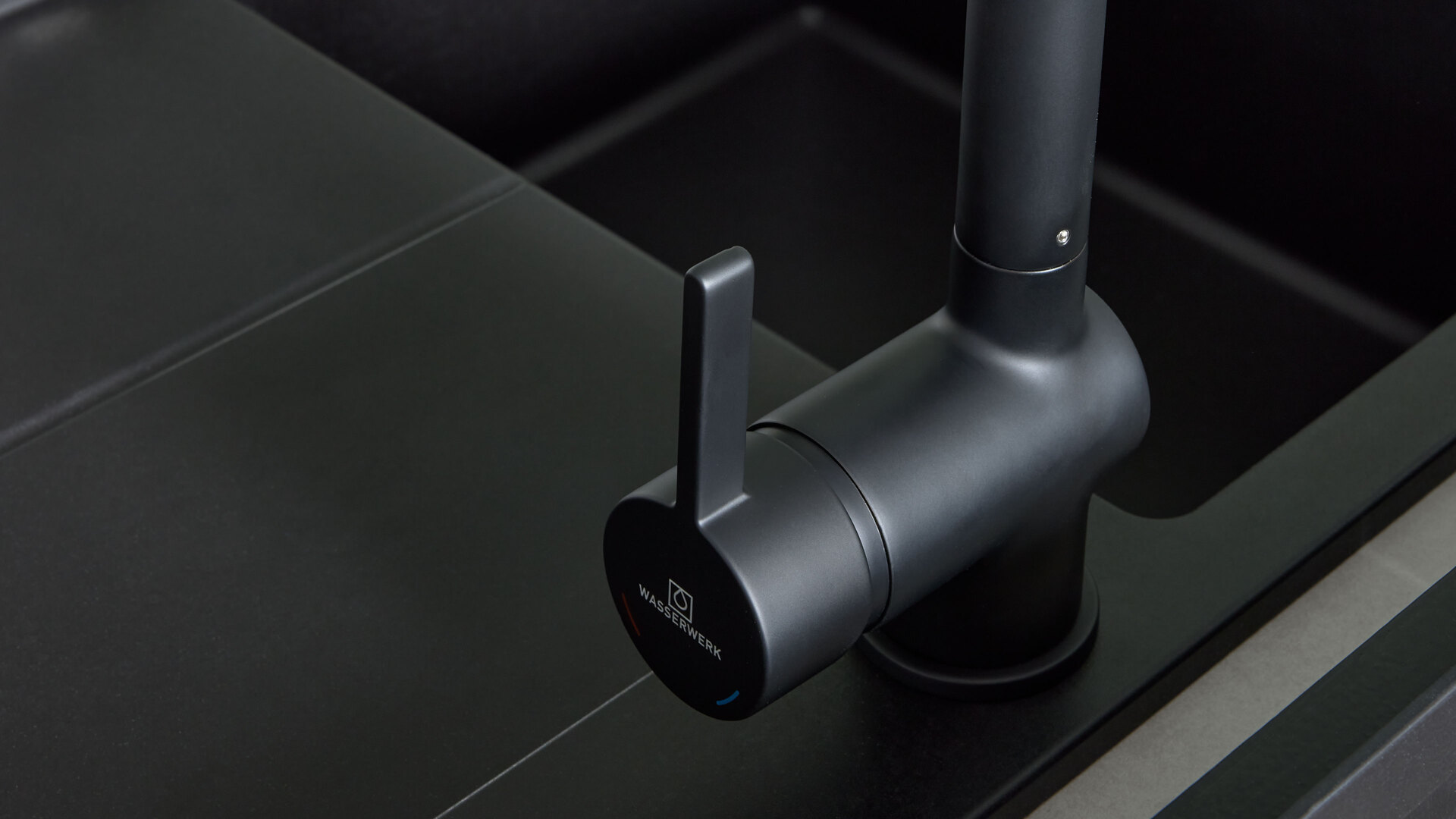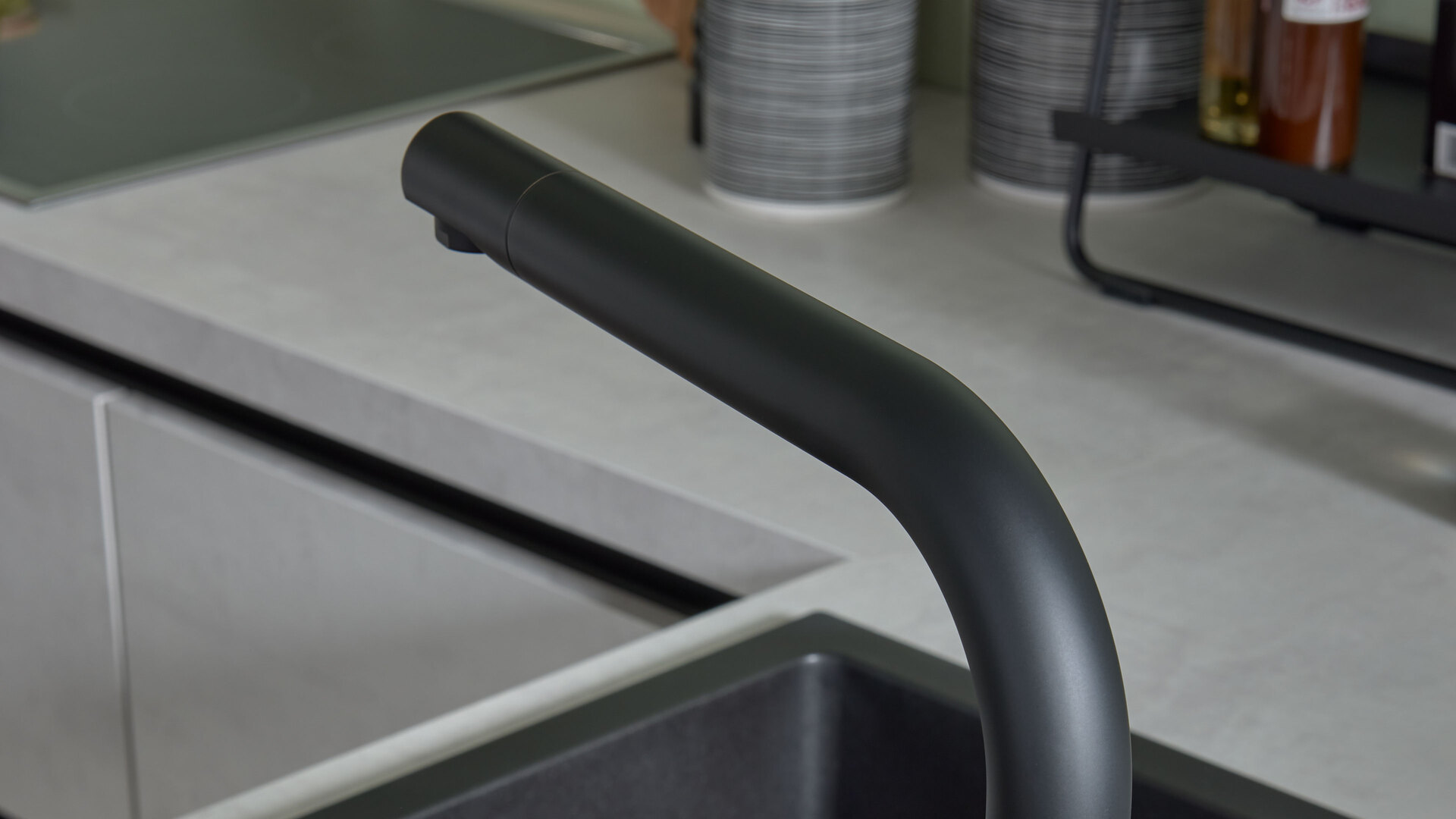 • Rechter Schenkel (ca. 247 cm): Stauraum kombiniert mit einem mattschwarzen Spülbecken und passender Armatur für stilvolle Kontraste und durchgängiges Design.