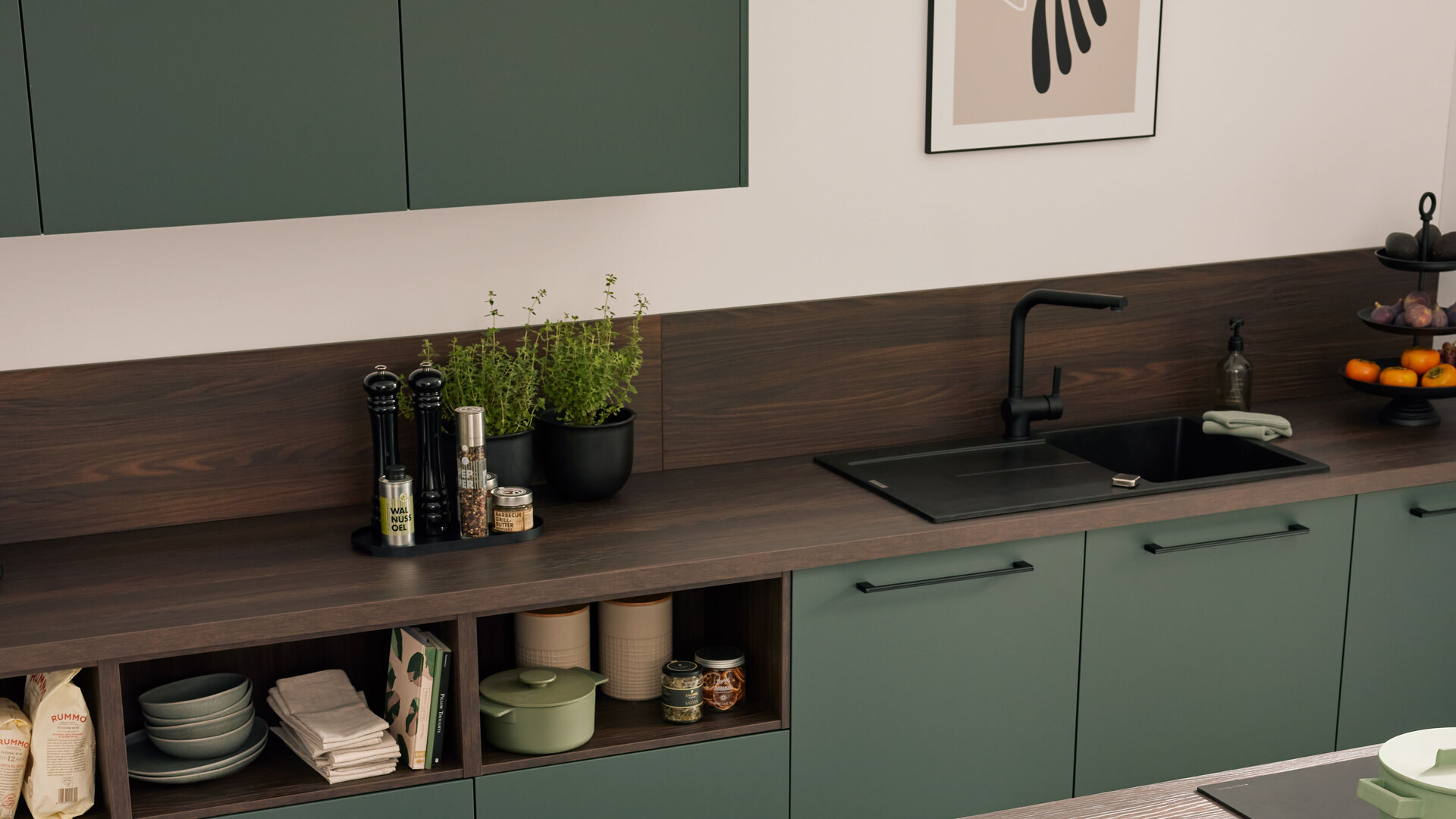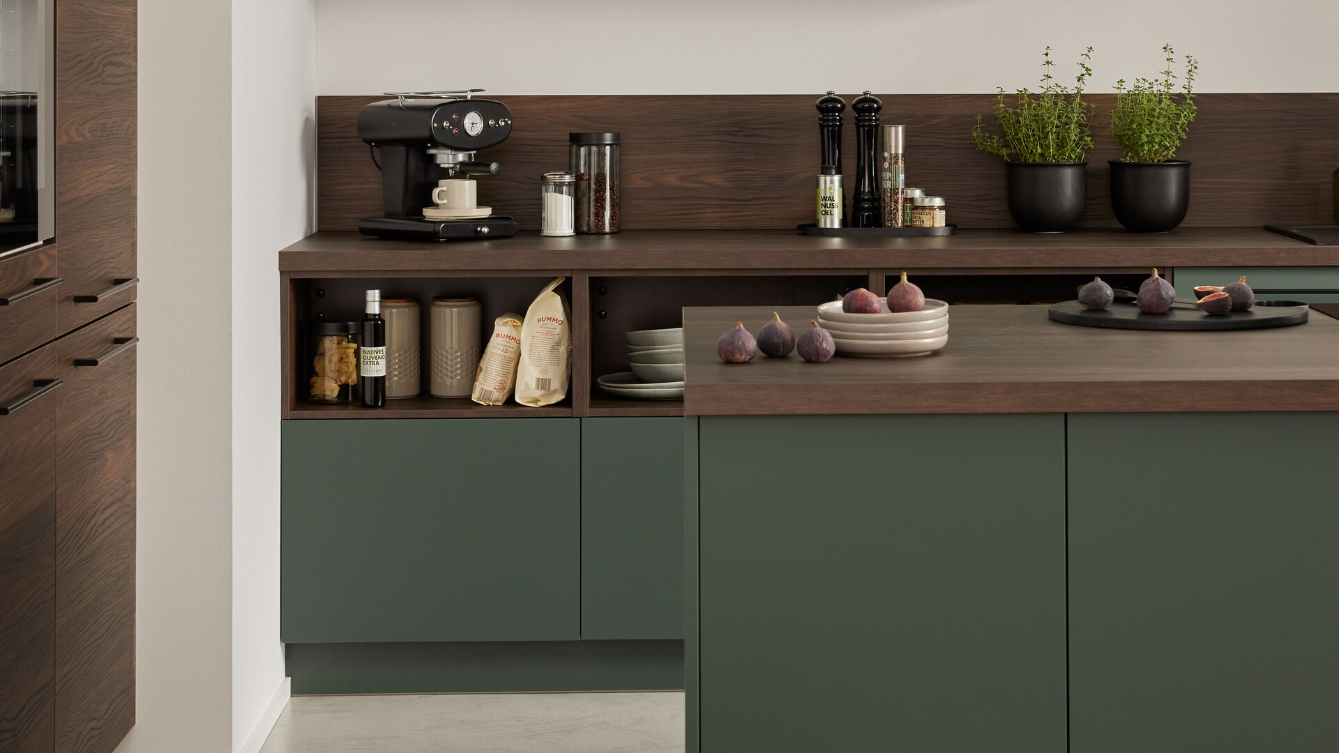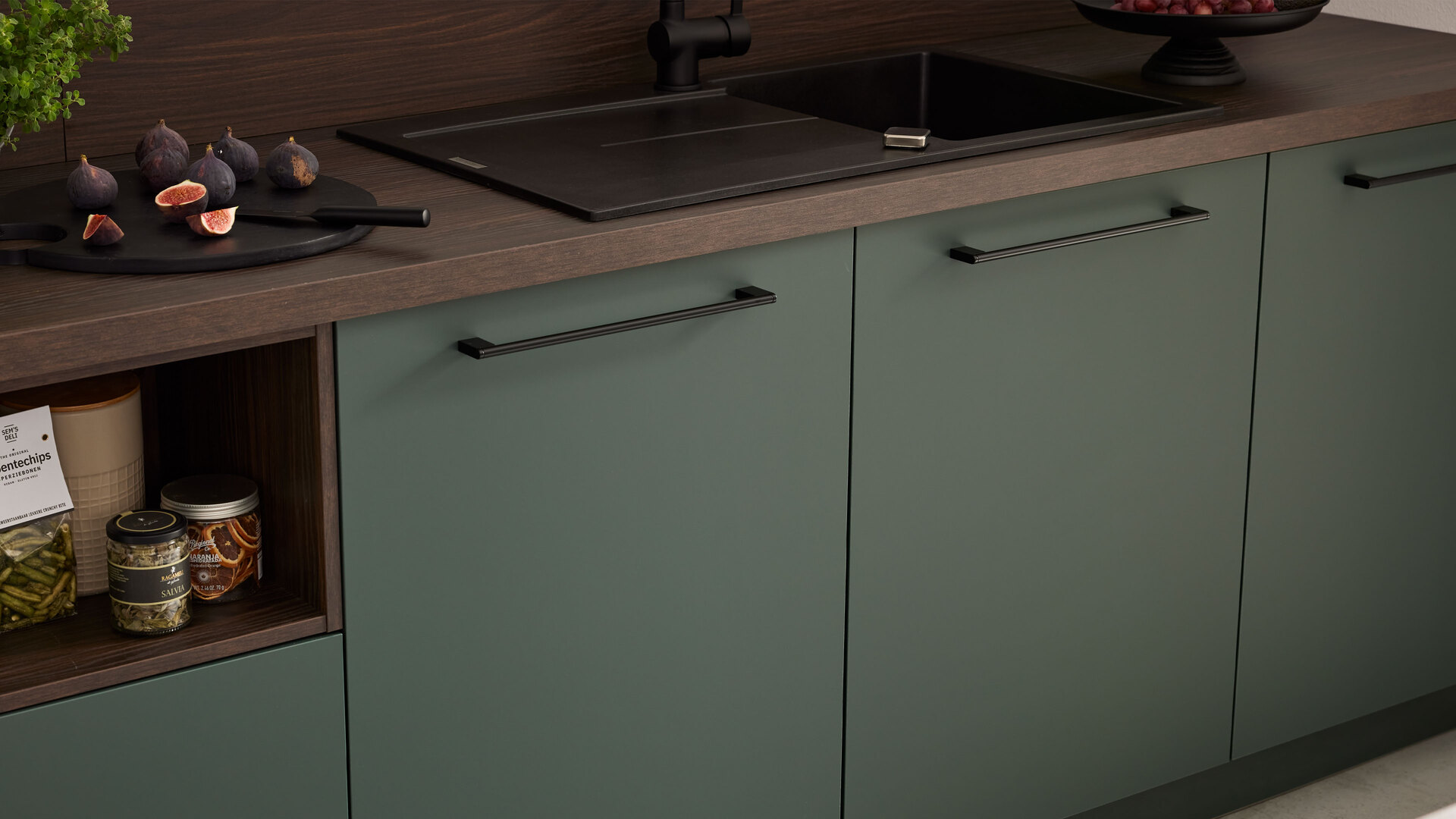 Die Interliving Küche Serie 3083 ist wie gemacht für alle, die ihrer Küche Persönlichkeit verleihen möchten. Matte Fronten in Schwarzgrün treffen auf edle Nussbaum Kuba Nachbildung und werden durch schwarze Metallgriffe vollendet. Das Zusammenspiel dieser Materialien sorgt für eine kraftvolle Optik mit wohnlicher Note – deine Küche wird zum echten Blickfang und zugleich zum gemütlichen Mittelpunkt des Zuhauses.