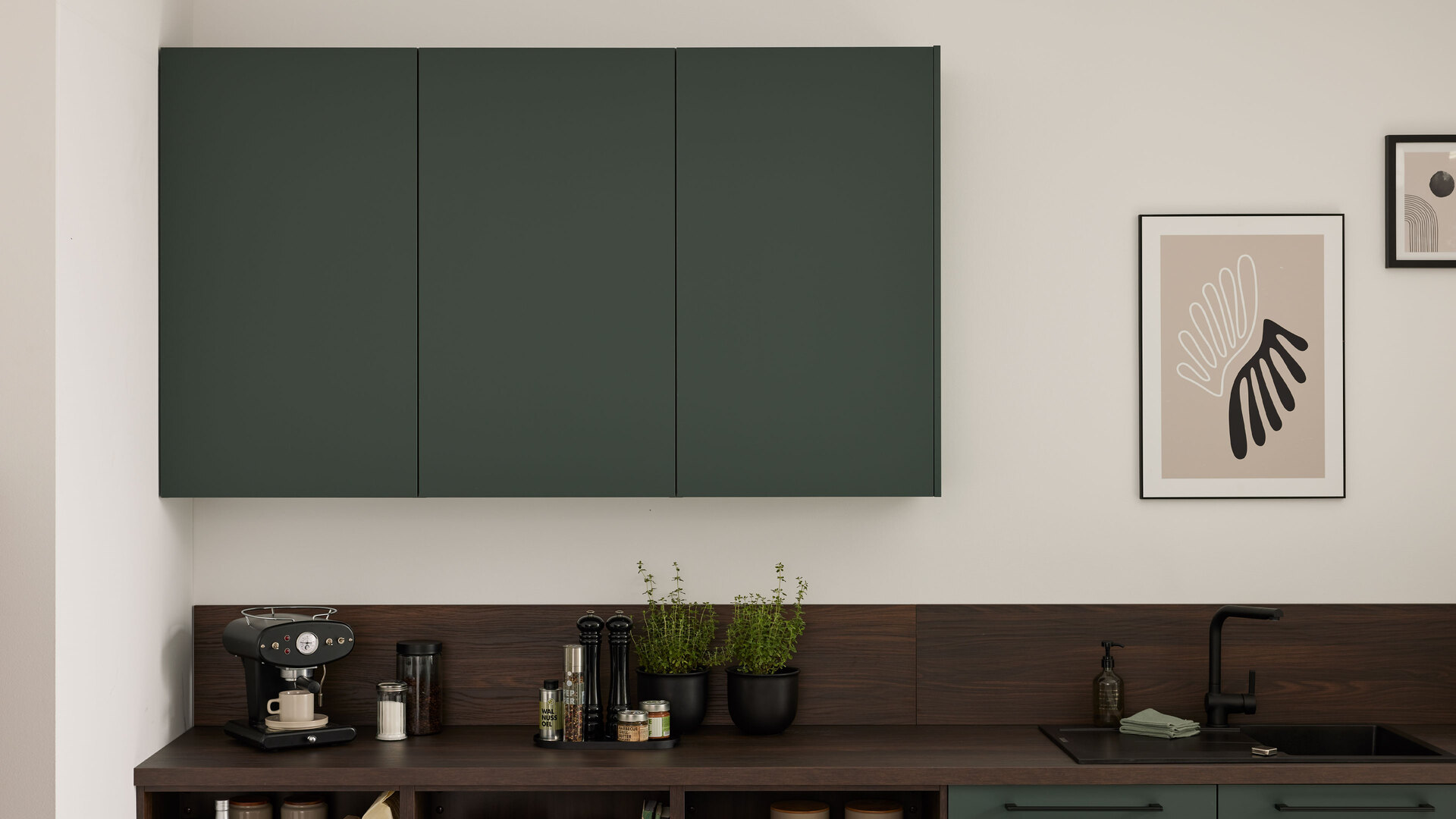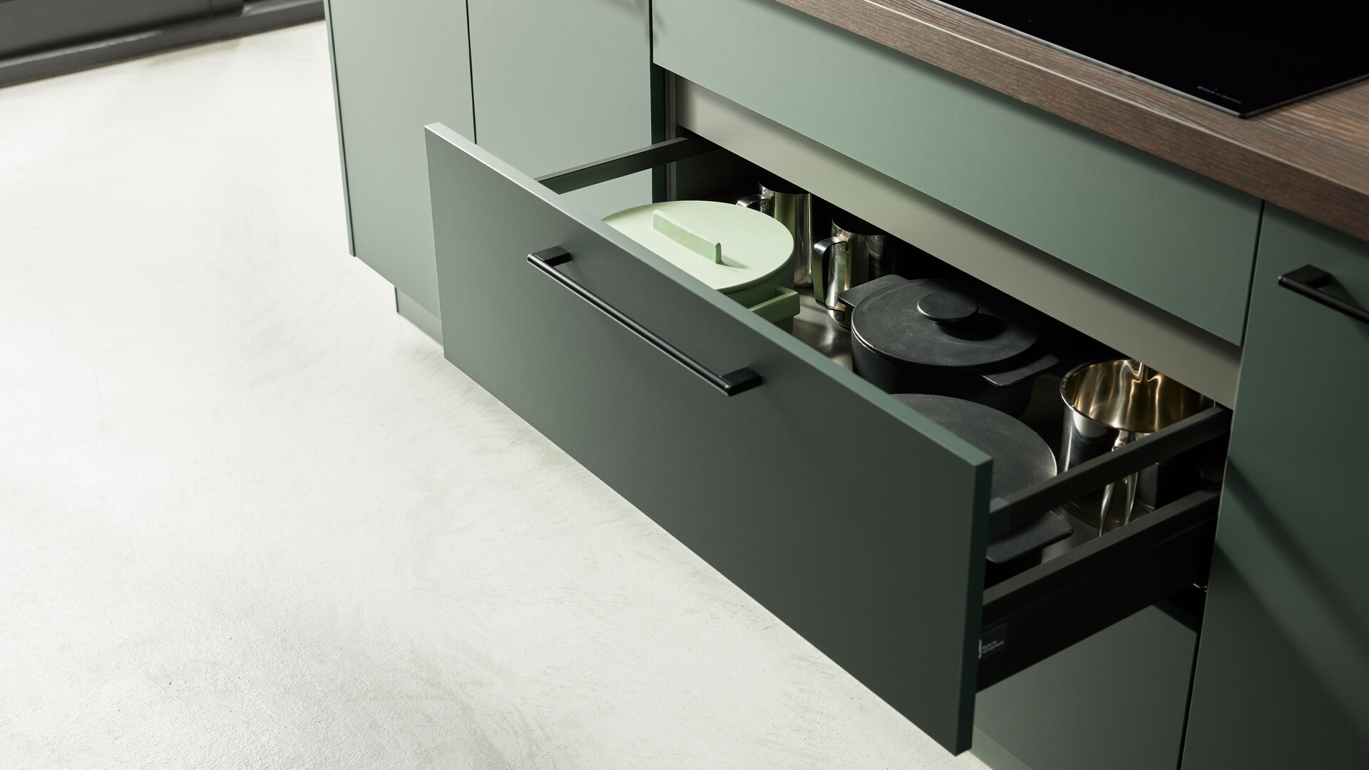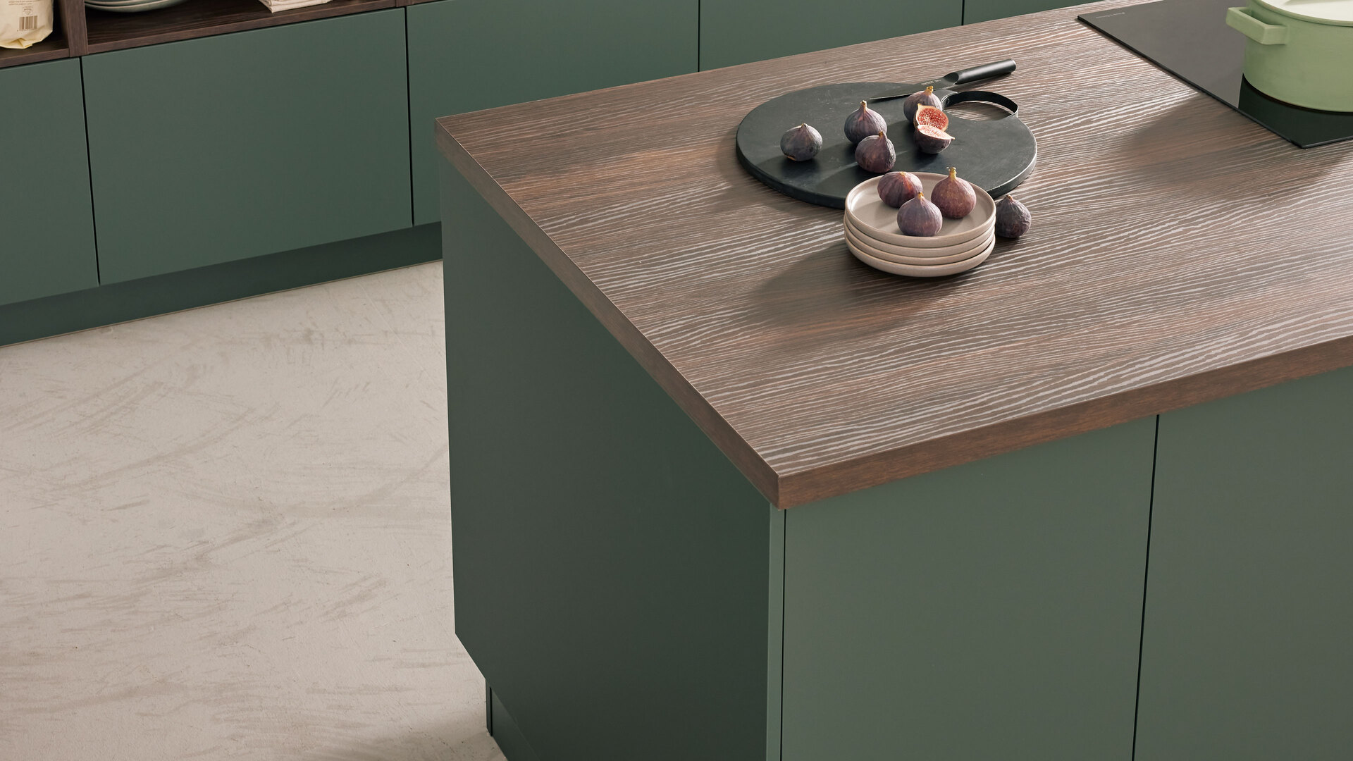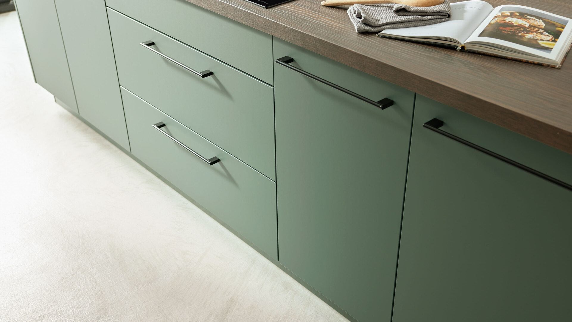 Die Interliving Küche Serie 3083 ist wie gemacht für alle, die ihrer Küche Persönlichkeit verleihen möchten. Matte Fronten in Schwarzgrün treffen auf edle Nussbaum Kuba Nachbildung und werden durch schwarze Metallgriffe vollendet. Das Zusammenspiel dieser Materialien sorgt für eine kraftvolle Optik mit wohnlicher Note – deine Küche wird zum echten Blickfang und zugleich zum gemütlichen Mittelpunkt des Zuhauses.