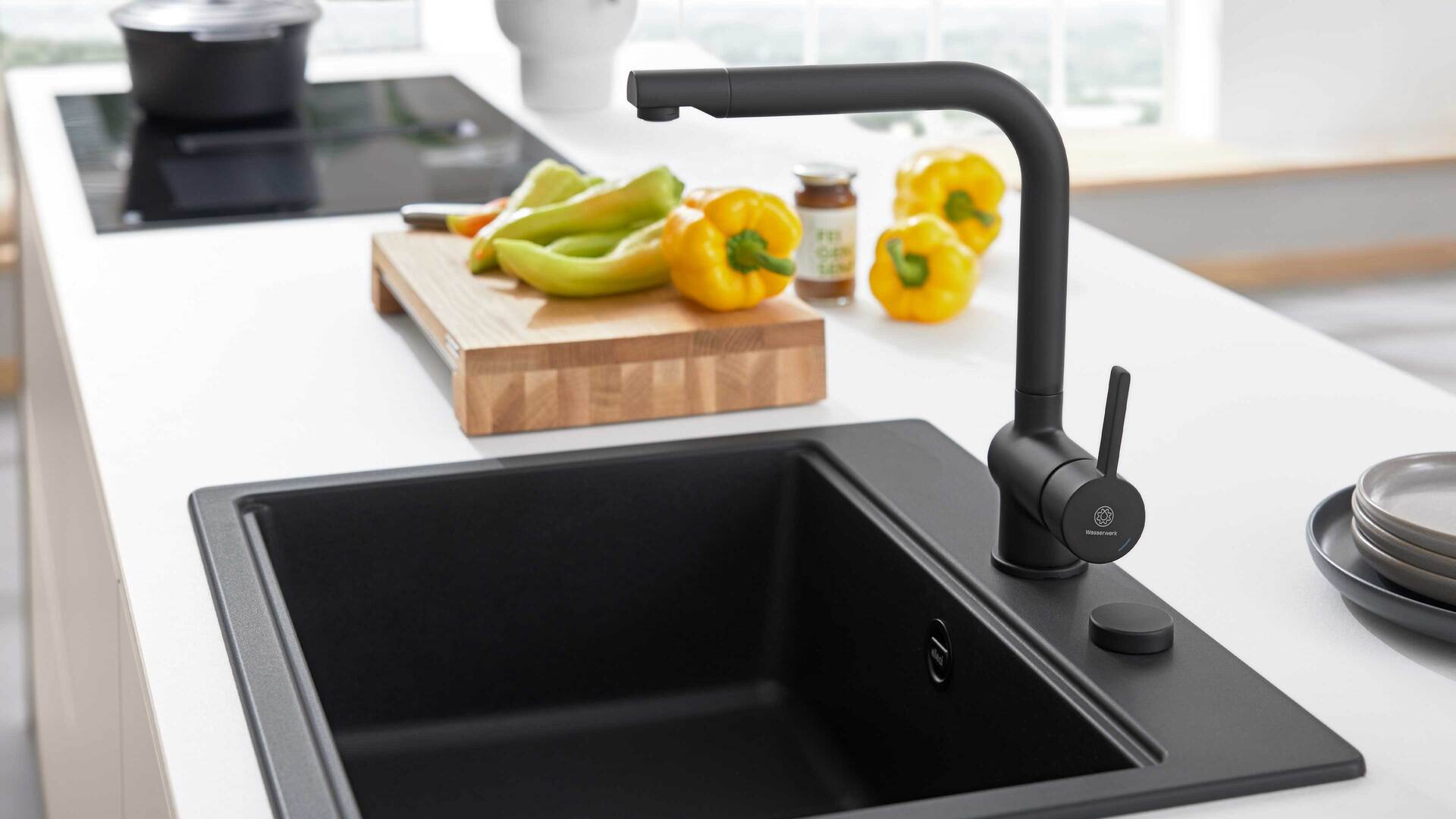 Großzügige Kochinsel: Die Insel misst in der Länge ca. 303 cm und ist ausgestattet mit dem SIEMENS Induktionskochfeld ED811BS16E mit Muldenlüfter (Energieeffizienzklasse B, Spektrum A+++ bis D), einer mattschwarzen Einbauspüle und einer mattschwarzen Einhebel-Mischbatterie – für ein klares, modernes Statement im Raum.