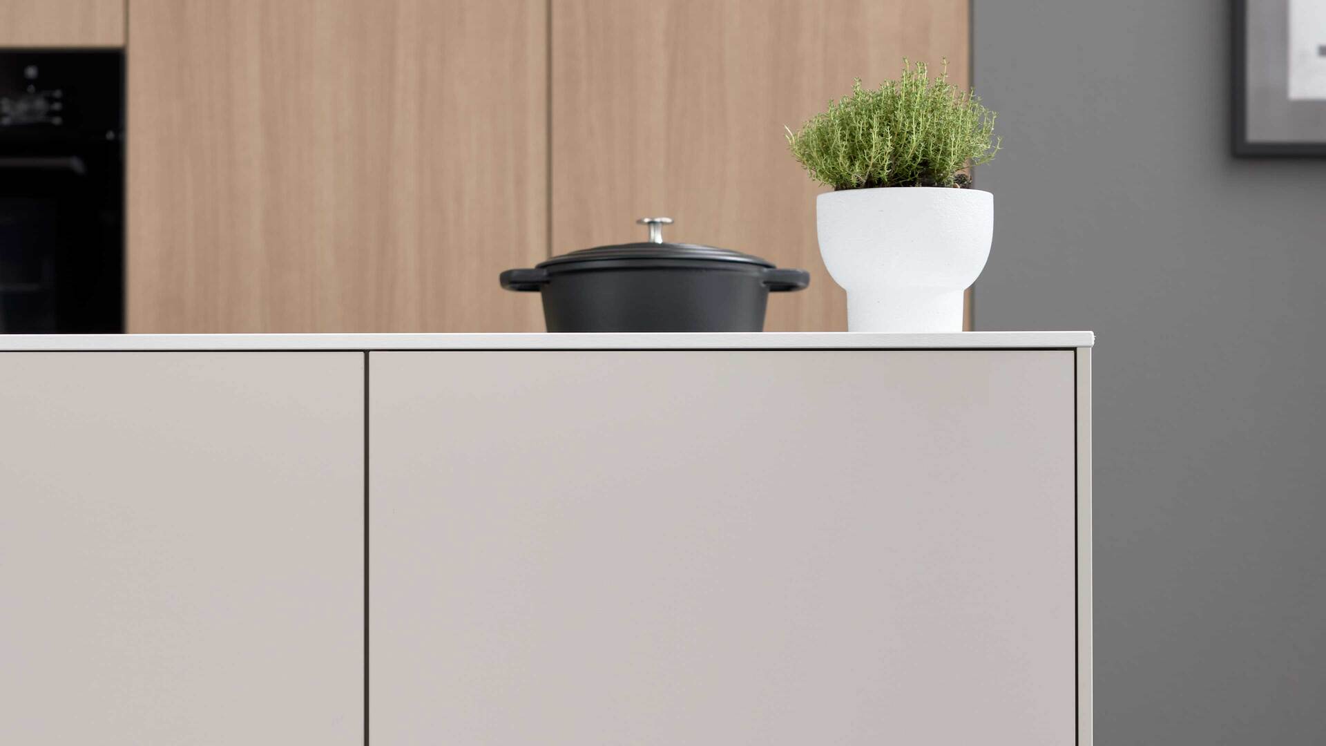 Elegantes Design: Die Kombination aus saharafarbenen, grifflosen Fronten und Natureiche Nachbildung schafft ein harmonisches Gesamtbild – modern, natürlich und zeitlos schön.