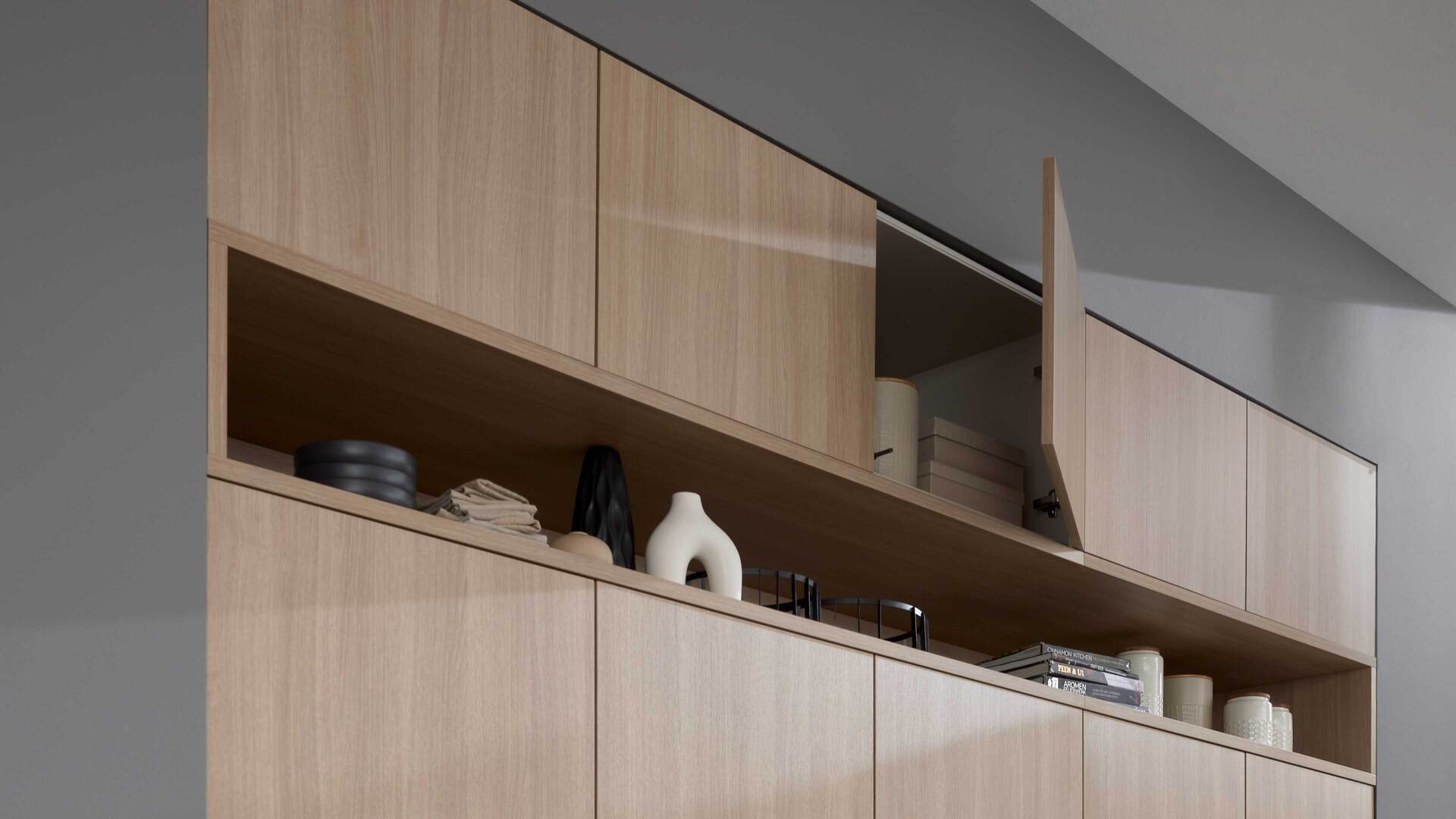 Harmonisches Gesamtbild: Durch die Kombination aus klaren Linien, offenen Regalbereichen und wohnlichen Holzakzenten entsteht eine Küche, die sich stilvoll ins Wohnumfeld integriert.