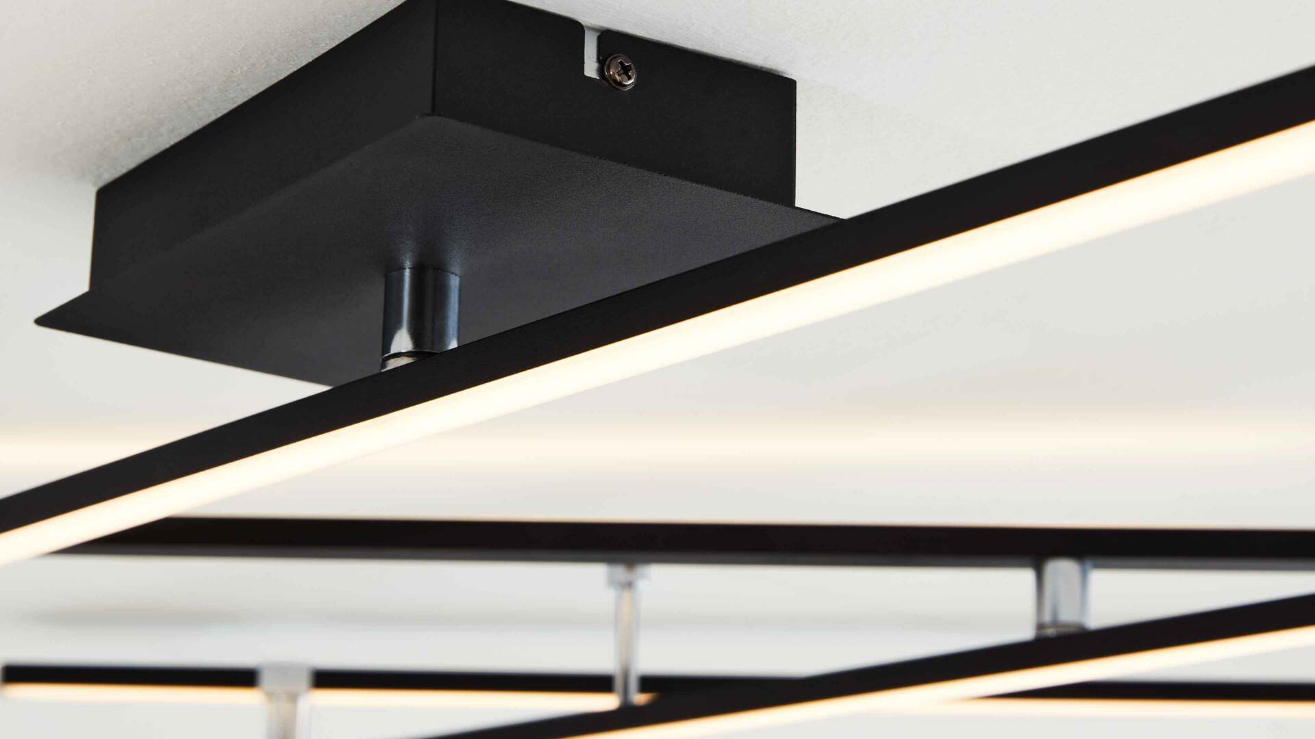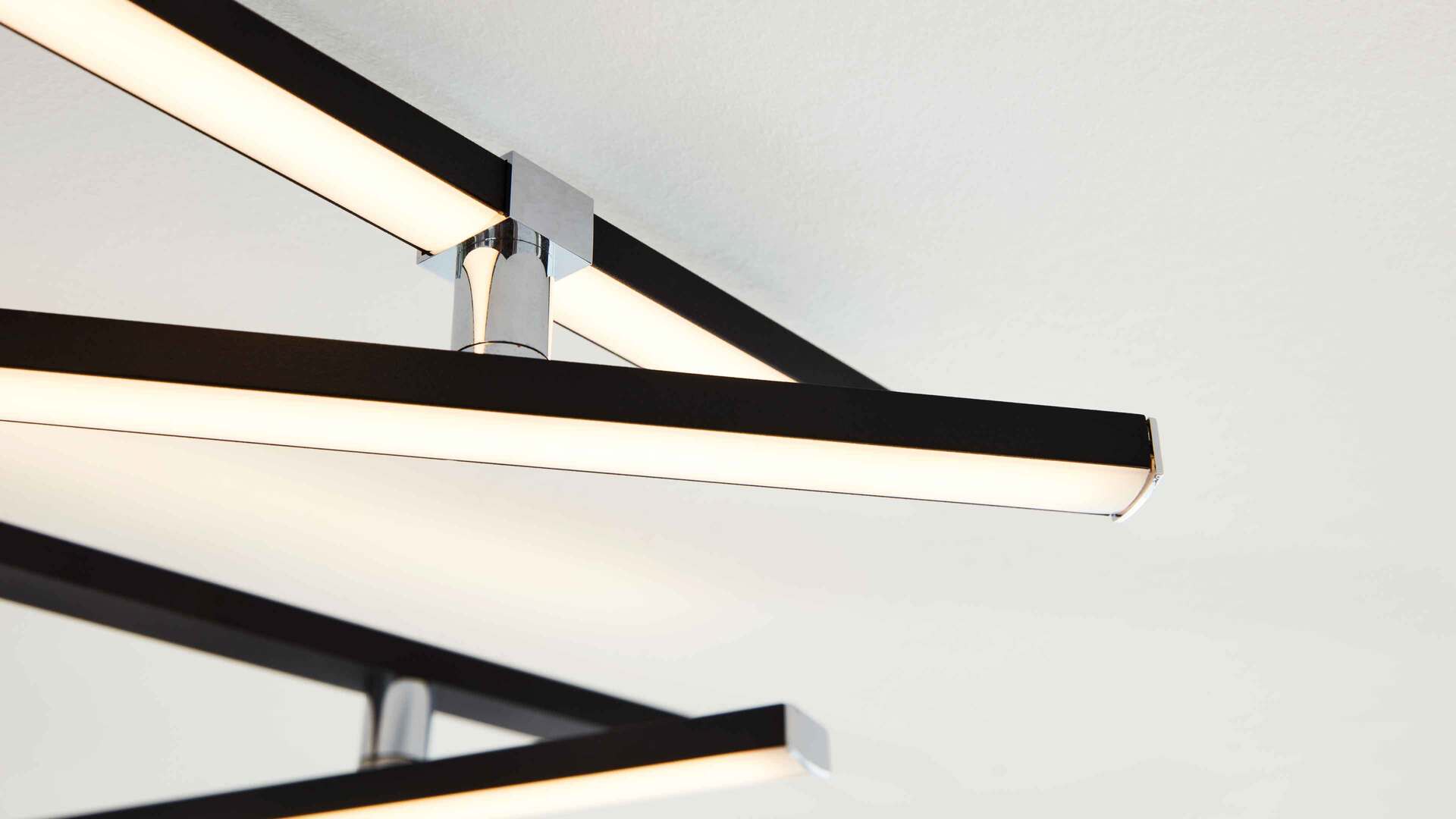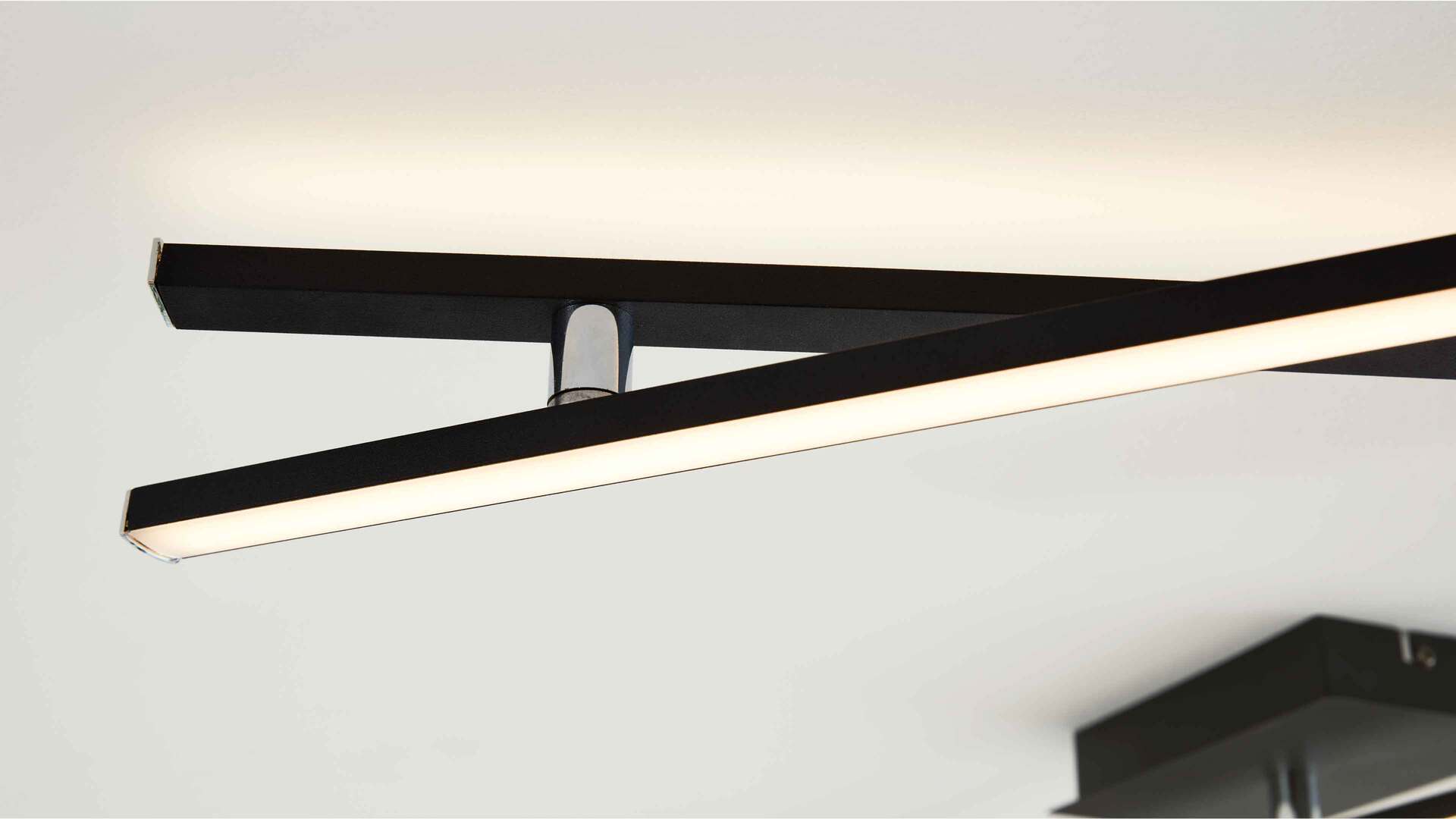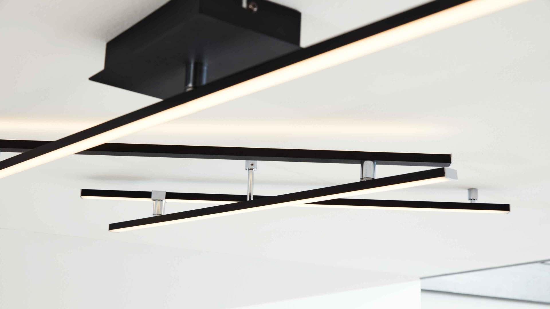 Die Deckenleuchte aus der Interliving Leuchten Serie 9339 beeindruckt zum einen mit ihrem abstrakten Design und zum anderen mit der hochwertigen Verarbeitung. Sie kombiniert mattschwarzes Metall mit glänzendem Chrom und weißem Acrylglas. Durch die perfekt aufeinander abgestimmten Materialien und Farben sowie die ungewöhnliche Formensprache erscheint die Deckenlampe modern und elegant. Sie setzt einen attraktiven Akzent im Raum. Ihre Maße betragen ca. 345 x 7 x 58 cm (LxHxT).