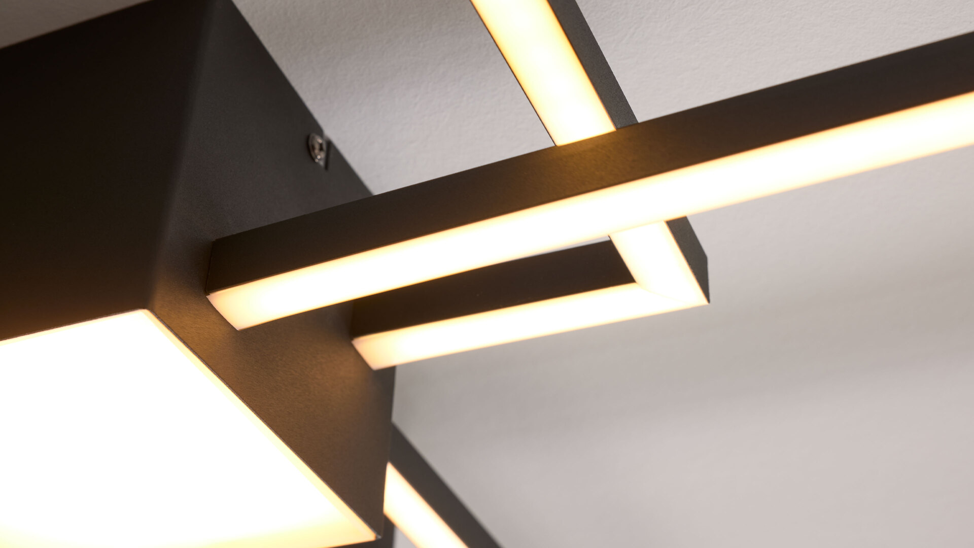 Die Leuchte ist sowohl für die Decken- als auch die Wandmontage geeignet – ideal für unterschiedlichste Raumkonzepte. Mit Abmessungen von ca. 110 x 18 x 75 cm (B/LxHxT) setzt sie ein modernes Designstatement und eignet sich perfekt für größere Räume.