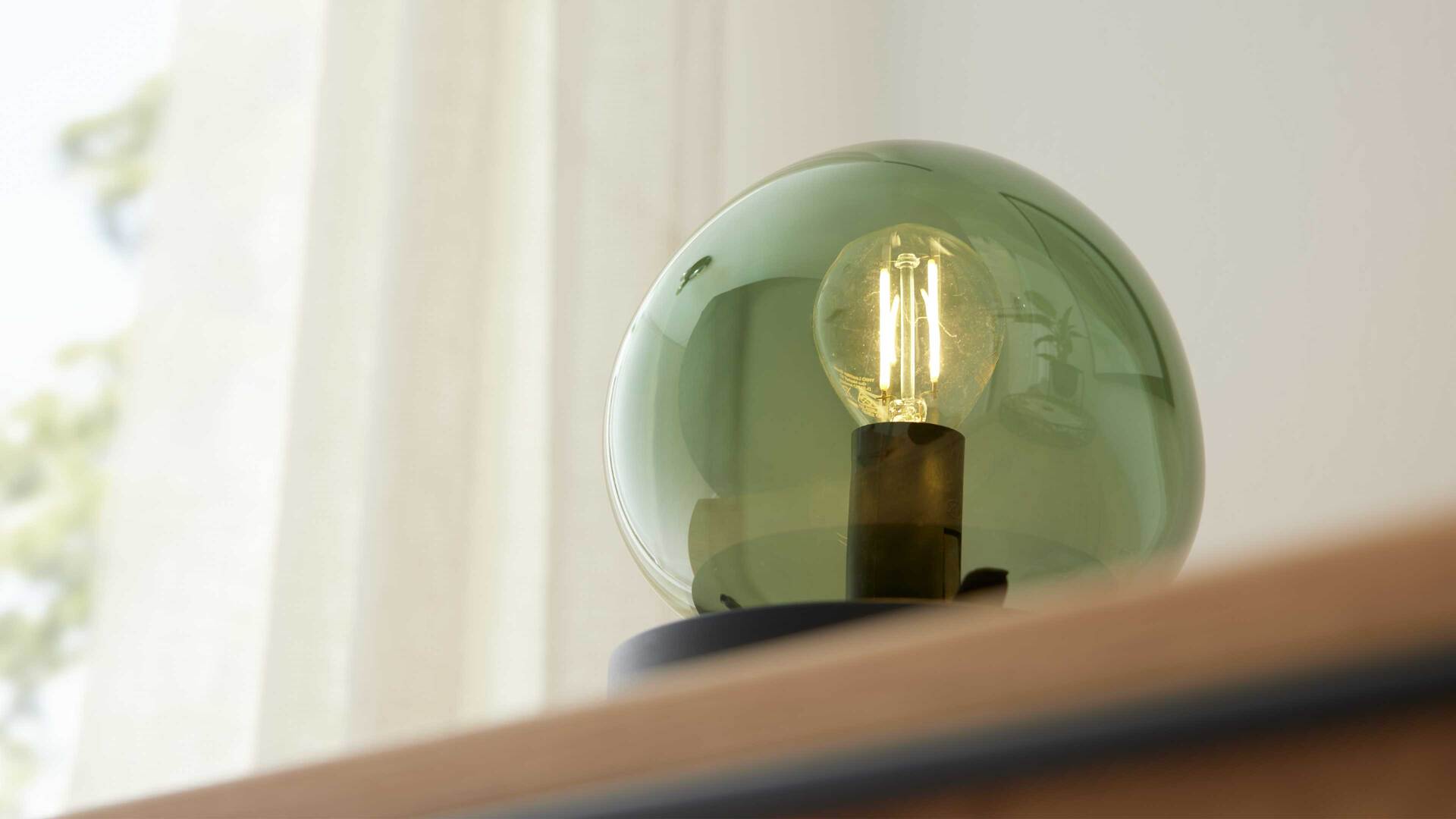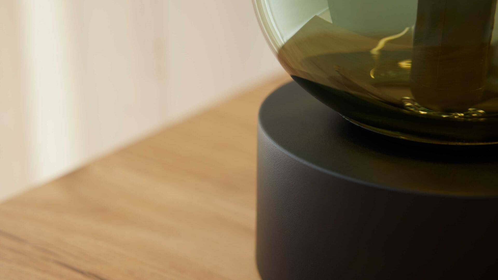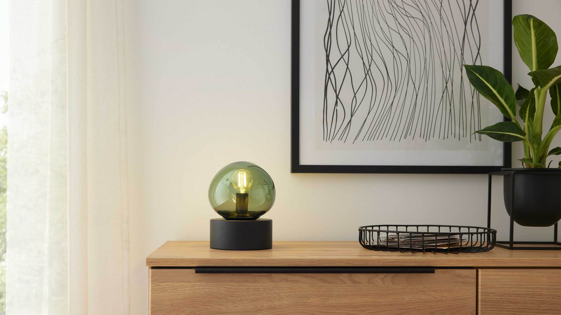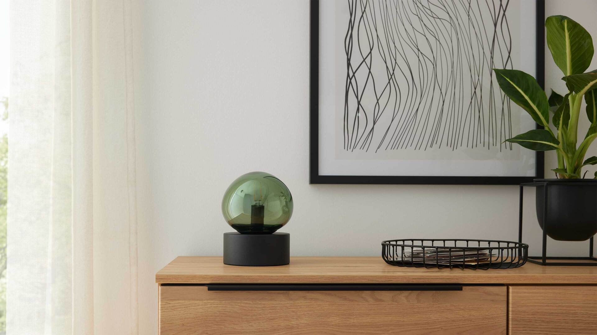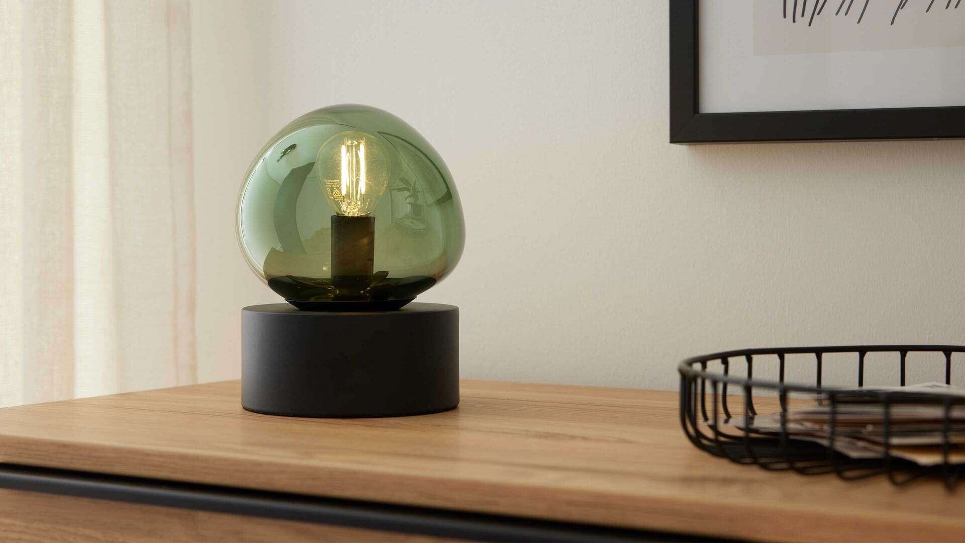 Die Tischlampe aus der Interliving Leuchten Serie 9350 vereint modernes Design mit wohnlicher Ausstrahlung. Der organisch geformte, matte Glas-Lampenschirm in elegantem Grün setzt ein stilvolles Highlight, während der mattschwarze Metallsockel und das schwarze Textilkabel mit praktischem Schnurschalter für einen harmonischen Gesamteindruck sorgen.