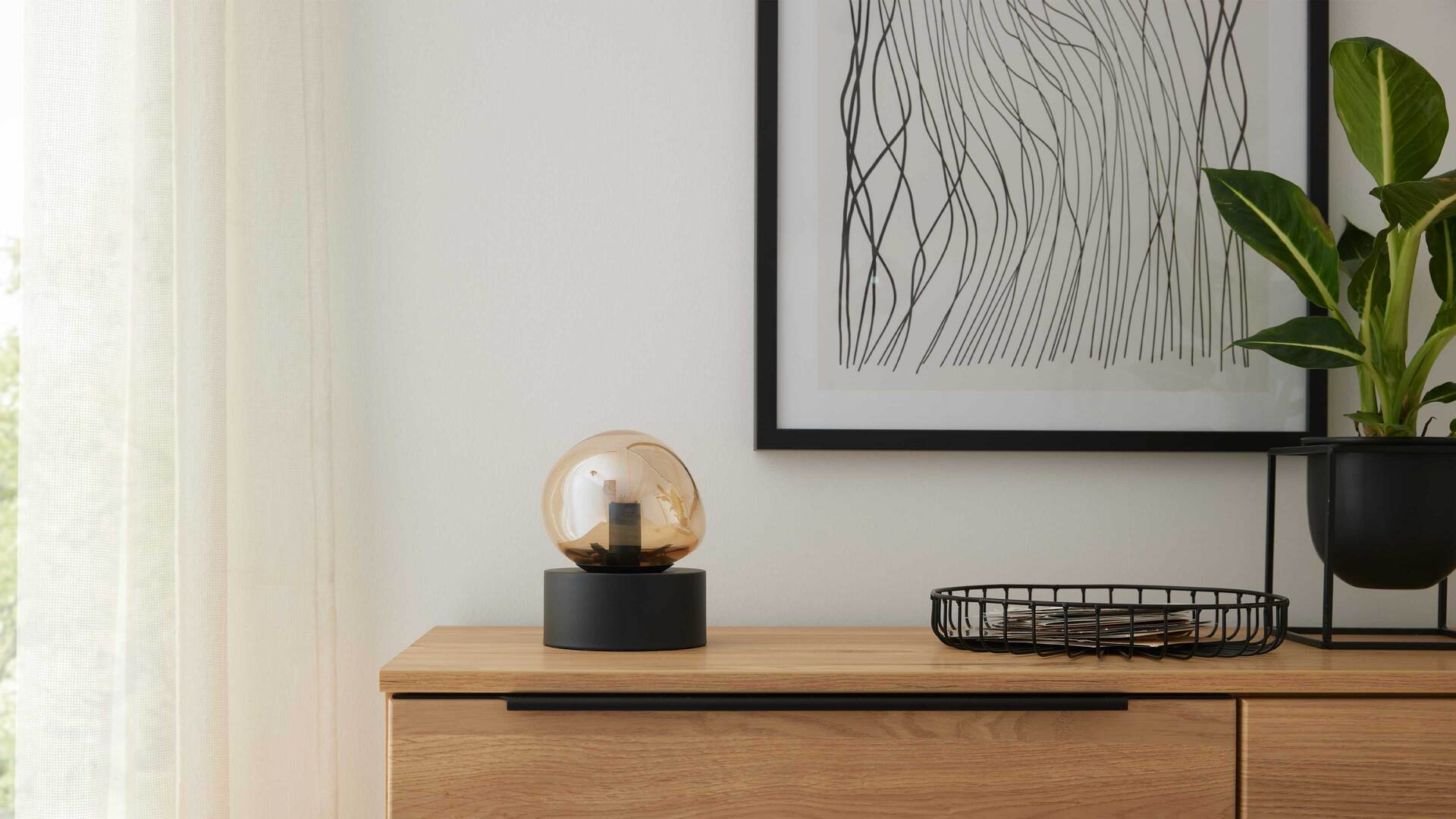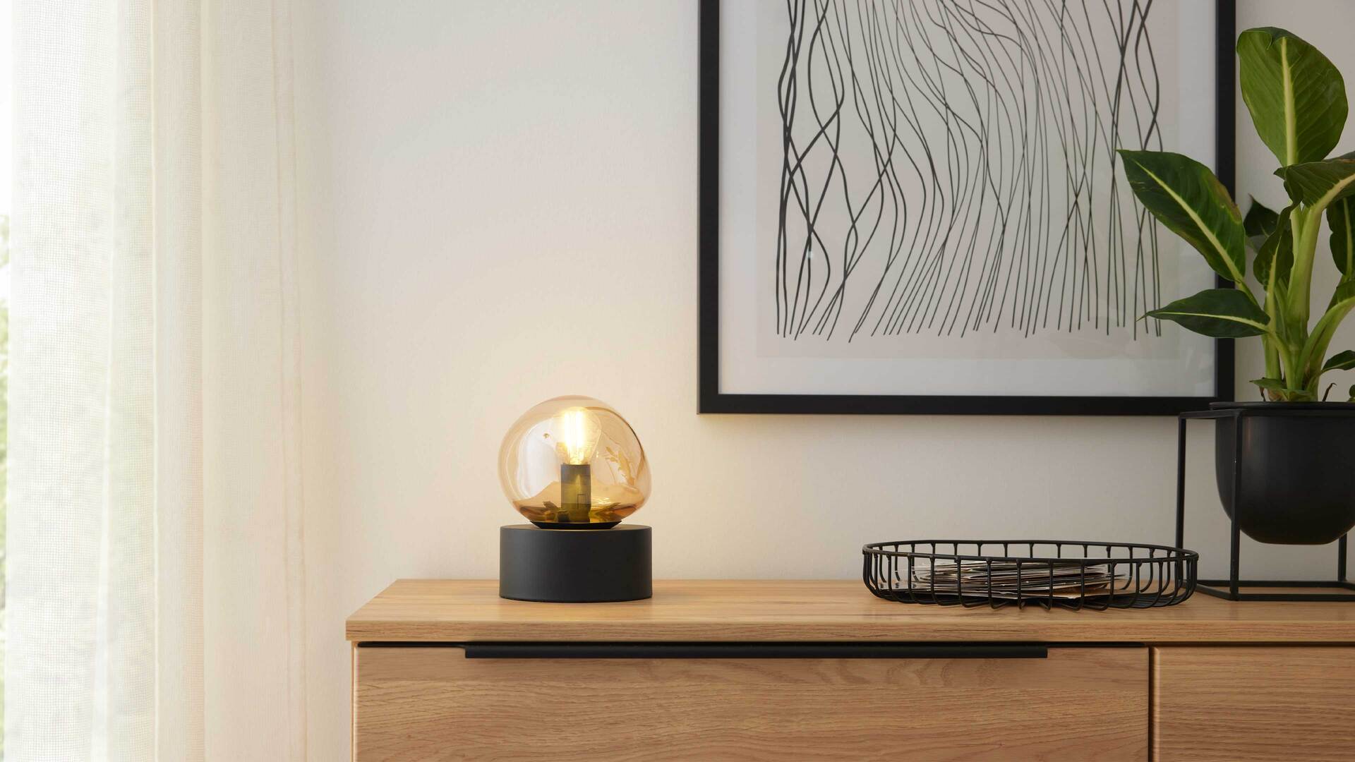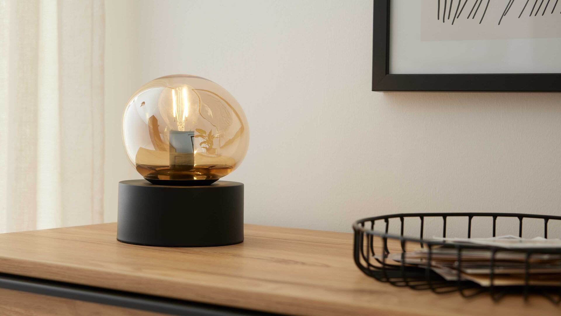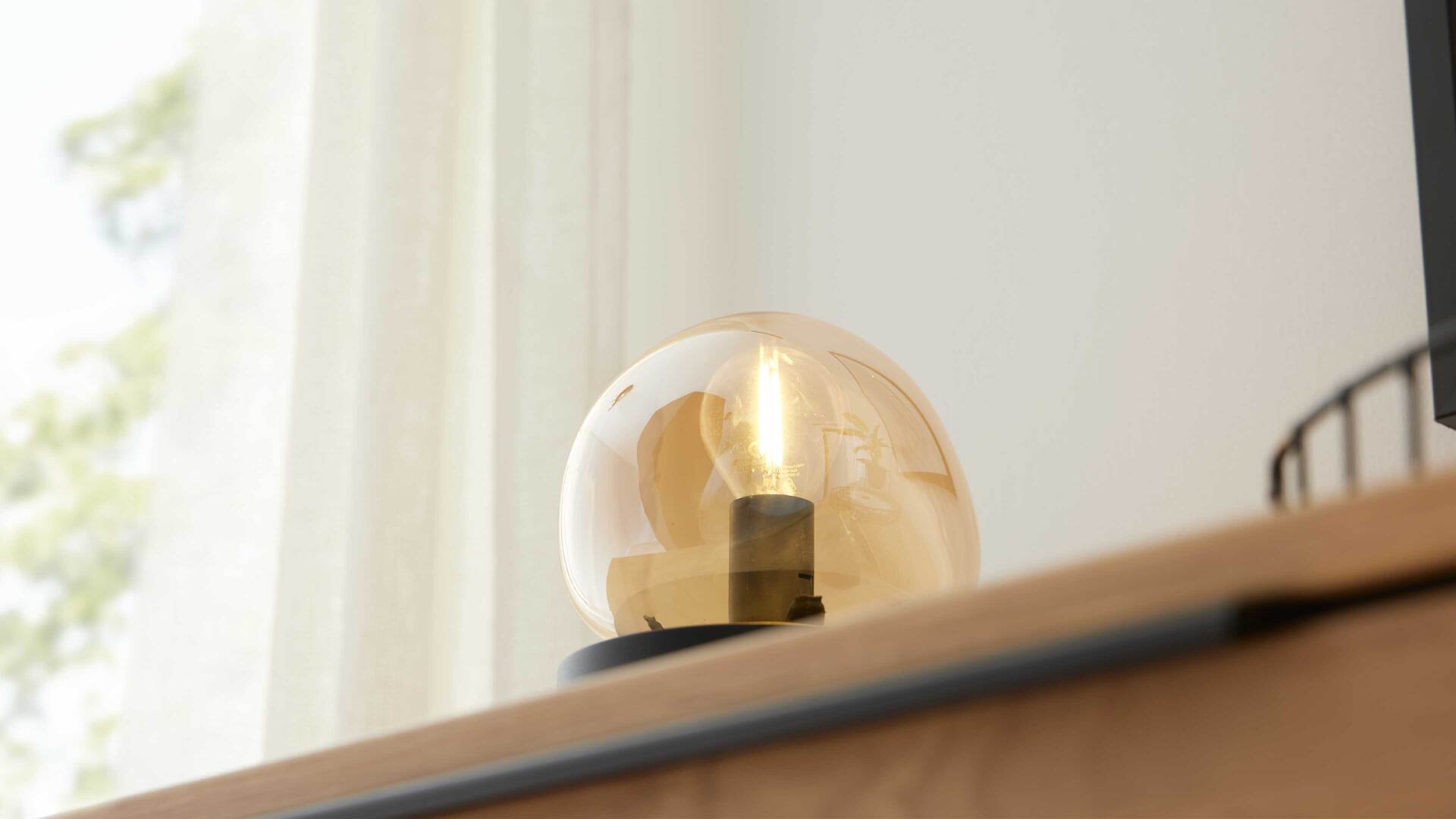 Die Tischlampe aus der Interliving Leuchten Serie 9350 vereint modernes Design mit wohnlicher Ausstrahlung. Der organisch geformte, matte Glas-Lampenschirm in warmem Amber setzt ein stilvolles Highlight, während der mattschwarze Metallsockel und das schwarze Textilkabel mit praktischem Schnurschalter für einen harmonischen Gesamteindruck sorgen.